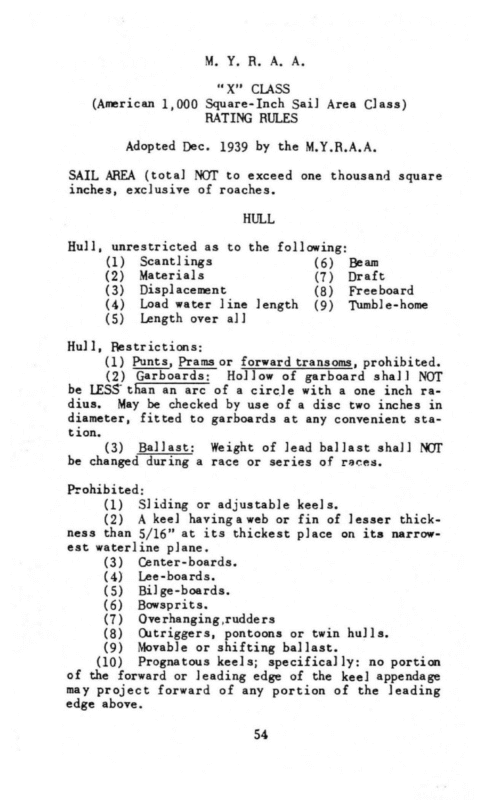 M. Y. R. “ x” A. A. CLASS (American 1,000 Square-Inch Sai] Area Class) RATING RULES Adopted Dec. 1939 by the M.Y.R.A.A. SAIL AREA (tota] NOT to exceed one thousand square inches, exclusive of roaches. HULL Hull, unrestricted as to the following: (1) Scantlings (6) Beam (2) Materials (7) Draft (3) Displacement (8) Freeboard (4) Load water line Jength (9) Tumble-home (5) Hull, Length over al] Restrictions: (1) Punts, Prams or forward transoms, prohibited. (2) Garboards: Hollow of garboard shal] NOT be LESS than an arc of a circle with a one inch ra- dius. May be checked by use of a disc two inches in diameter, fitted to garboards at any convenient station, (3) Ballast: Weight of lead ballast shal] be changed during a race or series of races. NOT Prohibited: (1) Sliding or adjustable keels. (2) A kee] havingaweb or fin of lesser thickness than 5/16” at its thickest place on its narrow- est waterline plane. (3) (4) (5) (6) (7) (8) Center-boards. Lee-boards. Bilge-boards. Bowsprits. Overhanging,rudders Outriggers, pontoons or twin hulls. (9) Movable or shifting ballast. (10) Prognatous keels; specifically: no portion of the forward or leading edge of the kee] appendage may project forward of any portion of the leading edge above. 54 M.Y.R.A.A. “X” Class RIG Rig, Unrestricted as (1) to the following: Any type of rig allowed, providing batten limits are not exceeded. (2) Alternate, or smaller rigs vided total] (3) limited. (4) sai] allowed, area Jimit is not exceeded. Height of rig, mast, pro- or forestay is not Masts‘and spars may be of any type, section or material, Rig, restricted as to the following: (1) The greatest diameter of mast and spars is limited to one inch. (2) Headsticks or headboards sha]] not exceed one inch across base. (3) Wire or other stiffening shal] not be put in head or foot of sails. Corners of sails may be re-enforced with the same material of which the sail is made. (4) Battens shal] divide the after leach/es into approximately equal parts. MAINSAIL not to exceed four in number, upper and Jower shal] not exceed four inches each in length. mediate battens not to exceed five inches length. JIB BATTENS not to exceed three in each not to exceed three inches in length. BATTENS battens [Intereach in number, (5) Roach of sails shal] NOT exceed two (2) inches. Rounded foot of loose-footed sails NOT measured. Prohibited: Spinnakers. (1) (2) Reaching or Genoa jibs. Sails unfairly sheeted or set No jib or foresail shal] main boom. Two minsai]s shal] be sheeted onto the not beset at the same time. VALIDITY OF CERTIFICATES (See “ Genera] Rules Governing Rating’and Measurement’’)., Rating certificates and Registration Cards are valid only during the calendar year in which they are issued, 55 M.Y.R.A.A. “X”” Class Any changes affecting the sai] area LIMITS cancels Measurement Certificate and Registration Card. A change of owner, club, or name of yacht cancels Measurement Certificate and Registration Card. The onus rests at al] times with the owner to notify his Club Secretary or Measurer of anything whatsoever that may necessitate re-measuring or reregistration. Fo]]owing any such change or alteration the owner shal] surrender his Measurement Certificate and Registration Card to the Club Measurer for cancellation, and such yacht must be remeasured and re-registered before it is again allowed in competition, X-CLASS SAIL AREA MARKS In the X Class, both mainsail] and jib shal] be marked with the officia] M.Y.R.A.A. stamp by the Club Measurer, in the lower corner of sail nearest the mast. The amount of the measured sai] area to be added in the space provided with waterproof or indelible ink. The official M.Y.R.A.A. stamp shal] be an equilatera] triangle with base and sides measuring 7/8 inches with the letters “M.Y,R.A.A.”’ at base, Such stamp to be of rubber and to be had from the M.Y.R. A.A, Registrar. SAIL AREA MEASUREMENT No fore-triangle measurement is taken, ACTUAL sail area, excluding roaches, (See “Calculation of Sai] Area”. only the is measured. ROACH OF SAILS Roach of sails shal] NOT exceed two (2) inches. Rounded foot of loose-footed sai]s NOT measured. CALCULATION OF SAIL AREA See “Genera] Measurement”, Rules Governing Registration and 56