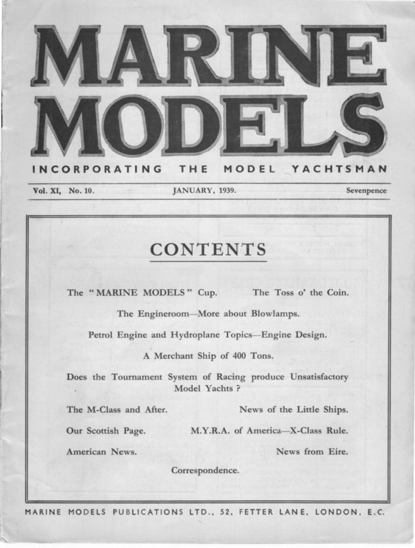 4,TOLLE, Ys U4 ij yy Gi” /tddiddlde Wy “ifs Y iy Vsti y We ccc “SS SWAN QS SSSI AVS VAs YW titi iistidddidiit tte QQ \ \ WHQy X ON S SWOOSHSS SS SSS yy” i“ Sass WS “ip ir a)y MEd YY” 7 WN MM Qq IN S 7, UML, VI1/11, IWS RowBi BR SSS AI SW MDM O99 INCORPORATING Vol. XI, PEANN SSSR N N Utils lsltd ttt tttte A Ydddddddddlds Wij Ye Vy Y, : dd Wh ss p71447 ol taV2 | Zan iy”: YY” “aYY “? ‘s la Ss Z, S il S x M0 N N S ~ Yy yyy EE S N N SK XSAASAAsAsA_Aa_a RW No. 10. THE MODEL SSSN WYSE a. N N N S S s YACHTSMAN JANUARY, 1939. Sevenpence CONTENTS The “MARINE MODELS ” Cup. The Toss o’ the Coin. The Engineroom—More about Blowlamps. Petrol Engine and Hydroplane Topics—Engine Design. A Merchant Ship of 400 Tons. SS Does the Tournament System of Racing produce Unsatisfactory ———— oe Model Yachts ? The M-Class and After. News of the Little Ships. Our Scottish Page. M.Y.R.A. of America—X-Class Rule. News from Eire. American News. Correspondence. MARINE MODELS = PUBLICATIONS — = LTD., 52, FETTER LANE, LONDON, E.C. MARINE MODELS HANDBOOKS How To Buitd A MopEL YACHT By W. J. DANIELS & H. B. TUCKER (with full-size Construction Plans for 30-in. Class Model) WHITE HEATHER Racing Model Yachts J. ALEXANDER & SONS 26, Victoria Parade, Ashton, Preston, Lancs. Useful to Builders of any size model How To BuiLd A MopEL STEAMER By J. VINES Expert Model Yacht Builders (30 years’ experience) FITTINGS SPECIALISTS (with 4 large scale Designs) Full of information for Novice and Expert Price: 2s. 6d. each, postage 4d. extra. HOW TO SAIL YOUR MODEL YACHT (Hints to Price: the Young 4d., postage Novice) 4d. Trade Terms on Application MARINE MODELS PUBLICATIONS LTD. 52, FETTER LANE, LONDON, E.C.4. MODEL SAILING CRAFT By W.J. DANIELS and H. B. TUCKER. REVISED EDITION. Price – 15s. With new Designs to Racing Classes. Now in course of preparation. 52, Fetter Lane, London, Practical Sail Makers. Accessories. Power Boat Hulls. Send Stamp for Lists Racing Model Yachts WHITE HEATHER TRADE SUPPLIED Model Yachting Association Subscriptions are now due and should be paid to the Hon. Secretary before January 15th. Order your copy in advance from : Marine Models Publications, “ Alexalight ’’? Metal Spars. Ltd., E.C.4 A Waterproof Glue Cheques and postal orders should be made payable to the Model Yachting Association and crossed “* Barclays Bank, Ltd.” The attention of Club Secretaries is drawn to the provisional list of M.Y.A. fixtures appearing on page 284. Also Heat and Acid Proof. No more sewing joints. A permanent and Solid Waterproof Craft. Breaking strain in wooden joints, moist and normal, over 1,100 Ibs. per sq. inch. RECOMMENDED BY “MARINE MODELS.” Tin The Annual General Meeting of the Association will be held on Saturday, January 28th, at Anderton’s Hotel, Fleet Street, E.C., at 3 p.m. containing 2 oz. 8d., or 4 Ib. 2/1, post free, from Anglo-American Pharmaceutical Co., Ltd., W. J. E. PIKE, GALEN WORKS, DINGWALL ROAD, CROYDON. Phone: Croydon 3118. Trade Enquiries Invited. When replying to Advertisers please mention MARINE MODELS. Hon. Secretary. Vol. XI, No. 10. Published on the Seventh of each Month THE TT: Council “MARINE of the Model Yachting Association have accepted the offer of the Proprietors of MARINE MODELS to provide a National Championship Cup for the “M” (Marblehead) Class. This class was introduced to Britain by the Ryde M.Y.C., who, with the consent of the M.Y.A., organised National Championships for the Class in 1937 and 1938. These races were held on the Ryde Canoe Lake, and the handsome Ryde Town Cup was used as a trophy. With the recognition of the class by the M.Y.A., the organisation of the National Championship for the class must fall on that body, and obviously the Ryde Town Cup, which is the property of the Ryde Club, and to be raced for at Ryde, cannot be used, especially as it is the policy of the Association to hold important events on different waters each year as far as possible, in order to give different clubs a share of them. As a new Cup was needed, the proprietors of this Magazine accordingly offered to present a trophy for the class. The conditions on which the Cup is given are framed to ensure that it can only be won by a decisive victory, and many or all of these provisions might with advantage be made applicable to every National Championship held by the Association. The conditions are as follows : — 1. This MOobDELS Cup Cup, shall and be shall known be used as for the the MARINE annual MODELS” January, 1939 CUP eon Championship for the ‘* M “’ (Marblehead) ass. 2. This Cup shall be handed to the winner of the Championship to keep for one year, and on its return he shall be handed a miniature replica of same to retain for himself. The Cup itself cannot be won outright. Replicas and such other prizes as are considered necessary, shall be provided by the Model Yachting Association. 3. The following conditions shall be observed as regards the race: — (a) Entries shall be not more than two boats per club, and may be restricted to one if more than 10 clubs enter. At least three clubs must enter or there shall be no race. (b) Races under strict M.Y.A. rules on the full Tournament system. At least one full day’s racing must be held for the Championship. If 10 or less boats start, two full rounds shall be sailed, one in the morning and one in the afternoon, but if there should be insufficient time to complete the second round, the O.O.D. may declare the result on the position at the end of the first round, unless one boat in the second round shall have gained such a commanding lead that she cannot be beaten by her nearest rival, even if such rival gained full points for all remaining heats and she herself did not score a single point. (c) Races shall not be sailed in fleets, but if more than 16 boats enter a second day’s racing, shall be held to complete the full Tournament wherein each boat meets each of her oppo