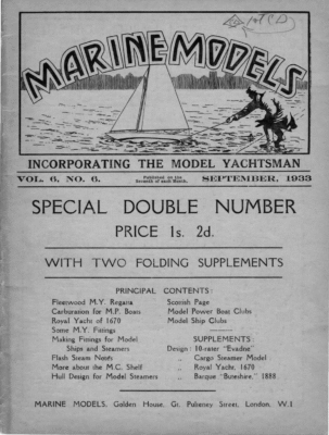 ctl VOL. G, NO. 7. enth oreuak won Seventh of each Month. OCTOBER, Editorial Barque ‘‘Omega’”’ of Shanghai Flashes from Fleetwood Model Ship and Steamer Fittings … Be Be News of the Little Ships Scottish Page Model Ship Clubs… Power Boat Clubs A Royal Yacht of 1670 … The Engine Room The M.E. Exhibition Odds and Ends we 4 ( 3} ) yy > ° : Sy. ‘ « MARINE MODELS, 7 reve GOLDEN HOUSE, GT. PULTENEY STREET, LONDON, W.1. 1933 THE SHIP MODEL FOUNDED SOCIETY. 1931 SECOND EXHIBITION OF SHIP MODELS 18TH TO Models steam 28TH of and warships. OCTOBER, all types and motor Scenic 1933 periods—galleys, vessels; sail merchantmen models—working and exhibit of the Gladstone Dock, Liverpool, the salvage of the “Hindenburg” at Scapa Flow. The Shadow- graph—ships of the ages shown in motion. Prize winners in the 3/- Model Competition. Prints of old ships, marine paintings, etc. A complete Chronological OLD S BLUE COAT SCHOOL, Open 10-0 a.m. to 9-0 p.m. Record of Ships School Lane, LIVERPOOL Admission 6d., (Tax included), Children. 3d. Model Sailing Craft By W. J. DANIELS and H. B. TUCKER Crown 4to., 260 pages, 230 photographs Diagrams and Plates. g WHITE HEATHER J 3 Racing Model Yacitts J. ALEXANDER & SOS 26, Ashton, Victoria Parade, Preston, Lancs. FITTINGS SPECIALISTS 25/- net, Postage 9d, Send Stamp for List. VVINTER comes with the evenings. long Your workshop calls you and you feel the urge to build that new model yacht. help you to This book will build a_ better boat than ever before. SAILS Model SPARS Yacht Builders ACCESSORIES Power Boat Hulls of ail descriptions If you want to beat the best Yachts, Sails, Spars or Fittings, you must go to ALEXANDER’S Racing Model Yachts Obtainable from the Offices of MARINE MODELS, all Bookshops and Libraries, or direct from the Publishers, Chapman & Hall, 11, Henrietta Street, London, W.C.2. Expert Ltd., WHITE HEATHER ara we: Fore Topmast 26 77.9 77.9 77.9 33.9 33.9 30.5 39.5 30.5 39.5 30.5 39.5 55.3 53.2 55.38 58.2 55.3 53.2 55.3 53.2 69.75 25.5 69.75 25. 69.75 69.75 25.2 34.4 25.2 34.4 34.4 49.6 45 49.6 45 49.6 45 49.6 45 82.2 | OO 982.2 36 $2.2 36 82:2) 36 30 83.6 77.3 30 33.9 77.9 MT. § 5 69.75 2 45 Mi 2R M2 M3 3R 3R M4 M5 4R 4R M6 1R F2 F3 2R 3R F44R F5 4R F6 5’82:2 36 Hoing ‘Jib … 33.7 33.7 33.7. 33.7 33.7 Total Areas Distinctive Marks on sails. =] 2nd = 3rd Reef Reef _ ist Reef to The fcre-and-aft sails are fitted as usual, excepting that headsail-sheets hook to the booms, and are adjusted by bowsers working on a jackline fixed along the port side of the bowsprit. Full Sail Sail: Pa ps guards on skylights are represented by gilded lines. Actual sidelight screens and two life-boats on skids, however, are in place. Her bowsprit has not sufficient steeve, purposely so, to gurad the figurehead and stem in collisions. It is 10 inches long, outboard. Booms, elliptic in section, are fitted to the fore and main courses, to all headsails and staysails, but, being concealed in batten-pockets, are hardly noticeable. BARQUE “OMEGA”—SAIL AREAS. A| from carrying water in any quantity, has her deck on top of the bulwarks. Her galley is of the height supposedly appearing above the bulwarks. Her hatches and skylights are merely painted on the deck and, a minute detail, the customary brass 858.55 697.65 590.95 486.55 249.55 3 2 1 IR 169 The Model Barque ‘‘Omega,’’ Shanghai. A table of the Full Sail Area, and of the various areas left standing after each reef has been worked out, is forwarded herewith. Under “ Distinctive Marks on Sails,” the inner column shows the position of each sail, while the right-hand column gives the number in the-series of reefs in which it is to come down. Each sail carries its distinctive markings in Indian ink, so there is little difficulty in knowing which sail to “bend” or what sail should come off. These little differences from accepted practice are explained in detail in the hope that some, at least, may be thought worth trial on other squareriggers. The Spanker sheet operates the Braine steering gear which is fitted. So far, “Omega” has been sailed three times, and has proved herself very able. Our sailing-pond, in the Jessfield Park, some five miles from town, is not large and, being “ornamental,” is practically surrounded by mounds, rockeries, trees and shrubberies. Only indifferent cruising is possible during spring, summer and autumn. When the leaves are off made to race. J. E. WATSON, A MESSAGE FROM MR. GEORGE BARON. ls have been asked by Mr. George Baron to convey to British model yachtsmen his sincere appreciation of the many kindnesses shown to Mrs. Baron and himself during his stay at Fleetwood, particularly to Mr. W. H. Davey, who acted as “Vanja’s” mate. the trees, however, sailing is more interesting and, during a storm, becomes quite good. No attempt has been Mr. Baron adds that he is satisfied the best yacht won, and that her designer and skipper deserves all credit for his yacht and skilful handling. 170 FLASHES FROM FLEETWOOD. By Tur Scorrish CoMMoDORE. Reflections of 30th July—4th August, 1933. UNDAY. All aboard. Hi! hold hard Guard. These boats must be stowed shipshape help you if they arrive damaged at Preston. or O.K., we’ll see to the transfer there. Right away. Sensational arrival at Boathouse of Scottish contingent. Shades of poor old Dobbin! Cruelty to deserving but fragile taxi. One crated model, one married ditto (sitting on husband), various other gear on top. Luggage grid loaded below Plimsoll. Another craft and five slim young (7) Scotsmen, total of about 52 stones of “Scotch” and 14 stones, or thereby, of Lancs. taximan. After eight miles of severe nervous tension what a hearty sigh of relief when safely arrived at destination. How does the busy Bee? Eight handsome sailors and ourselves busily engaged with the Schoolmaster writing numbers. Haven’t been so industrious with a pen since our Office Boy days. A poor job that will not stan