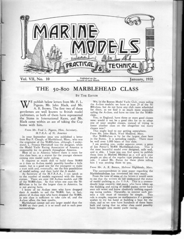 ” ul] wo s8s 5 SANAAAY eS Published on the Seventh of each Month 10 THE 50-800 MARBLEHEAD UTZ) | | ( ED f gully ° Vol. VII, No. Dynal sebasseee sean ing sant sees TECHNICAL. Coy January, 1935 CLASS By THE EDITOR Wy E publish below letters from Mr. F. L. Pigeon, Mr. John Black, and Mr. A. R. Brown. The first two of these gentlemen are well known to British model yachtsmen, as both of them have represented the States in International Races, and Mr. Black came within an ace of taking the Cup home with him. From Mr. Fred L. Pigeon, Hon. Secretary, M.Y.R.A. of N. America In your September issue you published a letter from Roy F. Clough, of Marblehead, Mass., who was the originator of the 50-800-class, although, I understand, L. Francis Herrishoff was the designer, while the Model Yacht Racing Association of America is responsible for its growth throughout America. Most of us in America believe there is room for this class here, as a starter for the younger element coming into model yacht sailing. It requires as much skill to build these 50-800 as it does an A-class model, possibly handles a little easier, but is a good size for the youngster to make a start with and, eventually, see the fine possibilities of model sailing, and then build the A model. As Secretary of the M.Y.R.A.A., I can speak as to the number of models registered with the Association. There are over 160 A-class models and 190 of the 50-800-class. So that when one says the 50800-class is by far the largest class in America, he il is not stating facts. I know of no A-class men who have dropped their A models to sail the 50-800, but, in fact, plenty of A-class men who have dropped the 50-800, as one class is sufficient to take care of, and the A-class offers the best results. Marblehead cannot sail any larger model than the 50-800 on their pool, it is so small and in such poor surroundings. We,in the Boston Model Yacht Club, enjoy sailing the A-class models; we have at least 25 of the 50800-class, but do not have any club races scheduled for them, as we find it so much more enjoyable sailing the A-class, and have no time for the 50-800class You, in England, have three or more good classes now; would it not be a good idea for us to adopt one of your smaller classes, instead of trying to foster another class on the altogether too many classes now? This might lead to our getting somewhere. From Mr. John Black, West Medford, Mass. Our 50-800-class is by far the largest class here in the States. It is spreading rapidly. There must be well over 1,000 boats of this class. I am sending you, under separate cover, a print of Jim Potter’s 50-800 Marblehead-class. This is the most beautiful model ever designed, sails well, and is able. I hope you can find space to publish these lines in MARINE MODELS as it will give your people an idea of the regular type produced by the rule. I asked Mr. Potter for these plans telling him I was sending them to you. From Mr. A. R. Brown, Melrose Highlands, Mass. The correspondence in your paper regarding the Marblehead-class has interested me very much. From the tone of some of the letters it would seem to me that the writers do not understand the status of model yachting in the U.S.A. Thisis a tremendously large country, and many who have taken up the building and racing of model yachts never have seen salt water and know absolutely nothing regarding racing yachts. Naturally, to interest such persons a rule must of-necessity be simple. This rule is siinple, requires no mathematics if a prospect wishes to try his hand at building a boat for the class, and so we now have hundreds of these boats built and racing that no other class could possibly have brought into model yacht racing. 256 MARINE _In my travels over a great many miles, time and time again at regattas, interested persons have asked me regarding boats that were racing in A-class. Questions regarding the rules for this have invari- ably resulted in a remark something as follows :— ** Good Lord, you have to be a Naval Architect to build one of those boats.’’ A rule that gives such an impression certainly is not a rule that will attract recruits to the sport. _ This 50-800-class is here to stay. At this time it is the class in this country. Regattas attract five times the number of entries drawn by any other class. Every conceivable shape and type of boat has been built to this rule, scows, cutter, double enders, long keels, short keels, long waterline and short waterline, and, I do not think now there is any one type that is superior. The finest boats under all-round conditions on various waters are of a type very close to our Class ‘‘Q’’ racing yachts. Any- body labouring under the delusion that ** freak ”’ boats will win in this class are “** nertz.’’ They have been tried and the winning boats in various sections are of a conservative type and fairly heavy displacement. Over here the Marblehead 50-800-class is the class, and, unless something is done to bolster up the waning interest in the larger classes it will overshadow these classes. tf It will be seen that Mr. Pigeon’s opinions differ from any that have been hitherto expressed, while Mr. Brown makes out a strong case in favour of a simple rule. Mr. Black sends us an actual design of a highly successful boat under this rule, and the most prejudiced cannot deny that she is an We have to extremely nice little yacht. thank her designer, Mr. Jas. A. Potter, for kind permission to publish this design for the benefit of readers of this Magazine. As two clubs in the Isle.of Wight have adopted this class, and one of them has sixty members, we anticipate that this design will be of considerable interest to them. Other readers, even if not interested in the class, will be glad to have the opportunity of seeing an example of the work of one of America’s leading model designers. The M.Y.R.A. of N. America, consists of about three dozen clubs, we believe. A second associ