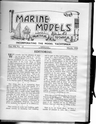 ll] ass SSAAAK’ see Zz AAV vat oe ase ot = — SS >. Vol. VII, No. 11 February, 1935 Published on the Seventh of each Month EDITORIAL ee photograph that appeared on our last month’s cover has provoked quite a little comment, and nobody seems so far to hold a brief for even the starting push. One humorist suggested in this connection that he thought that a Chart of Exercises calculated to develop the biceps and other muscles used in administering the necessary hefty push to a heavy model would form an excellent subject for one of our double-page Supplements. This gentleman went further and suggested patenting a special model yachting glove. The palm is to be of corrugated rubber to avoid any chance of the hand slipping, and the back covered with red rubber spines, like a rubber toothbrush. These, he explained, would be most useful when turning the boat in light weather, as by their aid it would be possible to lead the boat a good boat’s length forward when tacking, and augment the way nicely without apparently doing so. A Scottish correspondent writes about Mr. Pigeon’s suggestion that possibly American Clubs might be inclined to adopt one of our medium classes, and recommends the 6-m. He poirits to the British-American-contests in the full-scale 6’s, and adds that this class comes midway between the “A” and small classes, such as the Marblehead and Restricted 36-in. Many Clubs hardly realise the value of publicity to the sports of model yachting and If our sports were highly powerboating. organised and every Club supported the national associations, the public would appre- ~ ciate us more, and as a consequence greater facilities would be given by public authorities. The value of news in MARINE MODELS is that it is the only magazine devoted exclusively to the needs of marine modellers, and provides the medium for exchange of ideas and information. To be of more service MARINE MOopELs should be enlarged, but that entirely depends on increase of circulation. Every additional reader secured directly benefits the sport, as it adds to our strength and enables us to do more for our patrons. There are many model yacht and powerboat Clubs that we hear very little about. We should be glad to get into touch with some of these and hear something of their activities. Some of these lesser known Clubs sail recognised classes, but others have special classes and rules adapted to local requirements. We want to get into touch with every Model Marine Club in the world—a tall order and likely to involve the Editor in much correspondence—so send us along your news. IMPORTANT NOTICE. Since the publication of our January issue, the venue for the British A-class Championship and International Races has been changed to Fleetwood.- Dates, etc., will be found on page 301. 282 MARINE MODELS LAKE SAILING versus OPEN WATER SAILING By J. R. B. (U.S.A,) N the United States bank-to-bank sailing ] is a comparatively recent development. It was introduced primarily to promote international racing, and has increased in popularity on its own merits as a mighty fine sport. It is, however, an entirely different game from models sailed from skiffs, and the differences may be much more important than many of us appreciate. They are, in fact, great enough to demand a radically different setting of sails, and may be great enough to lead to two different types of hull. Sailing from skiffs differs from bank-tobank sailing in one very important feature; that is, the skipper is always with his model. This fact leads at once to an entirely different jib sheet setting in the two forms of sport. In bank-to-bank sailing a sudden shift of wind, leaving the model in irons, must be guarded against at all costs. This function is accomplished by trimming the jib sheet to a greater degree than is required when sailing from skiffs. At the same time the centre of effort of the whole rig must be correspondingly further aft. There are several corollaries to the fact that jib setting for windward work is flatter for bank-to-bank sailing than is customary for either skiff sailing or for full scale yachts. One is that the flat jib is a less efficient pulling sail than a jib set at a greater angle. It is quite possible that the theoretical advantage of a given area of jib over an equal area in the mainsail has been lost. If such is the case the natural tendency will be toward smaller jibs and possibly a different hull form to accommodate the altered proportion of jib to mainsail. With my limited knowledge of hull forms I am unable to compare the typical model as developed for bank-to-bank sailing with the typical model evolved from the lessons of open-water sailing. We have only to compare the present A-class model with her modified skeg, with the full-scale yacht, or even with the A-class model of eight years ago, to realisé that evolutionary processes are very rapid in the development of model yachts. _ If a new feature in a model is found successful it is quickly incorporated into the newer designs, and, if this successful feature is of benefit in bank-to-bank models, but not to models sailed in open water, it will soon be discarded by the latter type, and we have then witnessed the development of two types of models from the same ancestor. The differences between these models—one to be successful in bank-to-bank sailing, and the other in open water—should become greater as time passes. Whether a sufficient period has elapsed for the models to have developed recognisable typical differences, I do not know, but the comparison of a typical English A-class model with those of Norway would be very interesting. ~- If it is found that we are dealing with two types of models, and not one, it is highly important to the model yachtsman to recognise the fact, and to choose his designs to suit his purpose. ~ Perhaps then we will be able to explain the apparently contradictory results of the races between England and the United States in 