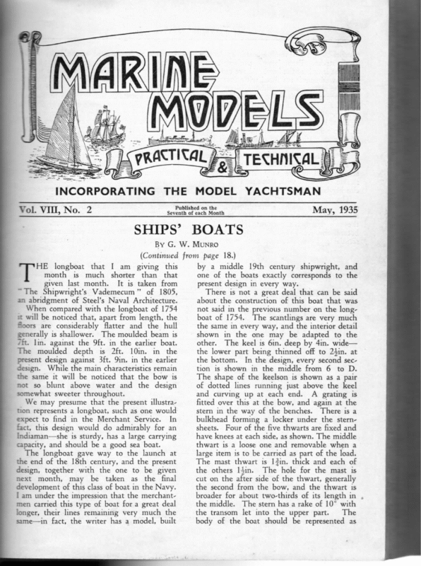 sy) LD woe VTPLLxCELL USNNSYSYSDNDNVNYD DDD NSAD DAD 02 2) =| TECHNICAL — INCORPORATING Vol. VIII, No. 2 THE MODEL Published on the Seventh of each Month SHIPS’ YACHTSMAN May, 1935 BOATS By G. W. Munro (Continued from page 18.) HE longboat that I am giving this month is much shorter than that given last month. It is taken from ~The Shipwright’s Vademecum” of 1805, an abridgment of Steel’s Naval Architecture. When compared with the longboat of 1754 st will be noticed that, apart from length, the floors are considerably flatter and the hull generally is shallower. The moulded beam is ft. lin. against the 9ft. in the earlier boat. The moulded depth is 2ft. 10in. in the present design against 3ft. 9in. in the earlier design. While the main characteristics remain the same it will be noticed that the bow is mot so blunt above water and the design somewhat sweeter throughout. We may presume that the present illustration represents a longboat, such as one would expect to find in the Merchant Service. In fact, this design would do admirably for an Indiaman—she is sturdy, has a large carrying capacity, and should be a good sea boat. The longboat gave way to the launch at the end of the 18th century, and the present design, together with the one to be given mext month, may be taken as the final development of this class of boat in the Navy. lam under the impression that the merchantmen carried this type of boat for a great deal longer, their lines remaining very much the same—in fact, the writer has a model, built by a middle 19th century shipwright, and one of the boats exactly corresponds to the present design in every way. There is not a great deal that can be said about the construction of this boat that was not said in the previous number on the longboat of 1754. The scantlings are very much the same in every way, and the interior detail shown in the one may be adapted to the other. The keel is 6in. deep by 4in. wide— the lower part being thinned off to 24in. at the bottom. In the design, every second section is shown in the middle from 6 to D. The shape of the keelson is shown as a pair of dotted lines running just above the keel and curving up at each end. A grating is fitted over this at the bow, and again at the stern in the way of the benches. There is a bulkhead forming a locker under the sternsheets. Four of the five thwarts are fixed and have knees at each side, as shown. The middle thwart is a loose one and removable when a large item is to be carried as part of the load. The mast thwart is 13in. thick and each of the others 14in. The hole for the mast is cut on the after side of the thwart, generally the second from the bow, and the thwart is broader for about two-thirds of its length in , the middle. The stern has a rake of 10° with the transom let into the upper part. The body of the boat should be represented as 30 MARINE clincher-built from the garboard up to the upper strake. From here a rubbing strake runs the length of the boat. Above the upper strake washboards are fitted with slots cut to take the oars. These washboards have a pair of compensation pieces at each side to take the strain of the oars when the men are rowing. There is no rule for the number of strakes in each side, but eleven might be taken as a fair representation of the usual English practice. Of course the quality of the wood available will be a deciding factor, but boat builders of Northern Europe were, and still are, inclined to use very broad planks or strakes compared with those seen on English clincher-built boats. The rudder is hung on three pintles as shown. Two eye-bolts are driven into the middle and upper part of the stern to support the two downward pointing pintles. The bottom one, just above the keel, is more substantial and has plates on each side of the i i i MODELS sternpost as far forward as the butts of the strakes. A long pintle points upward from this one and should bear most of the weight of the rudder. A square hole is cut through the rudder-head to take the tiller which should be about 2ft. 6in. long. A turk’s head or a piece of fancy carving is usually done at the inner end of the tiller. The shape of the breasthook and the ears can be seen at the stem in the plan view. The scale of this drawing, like that of last month, is tin. = 1 ft. It is doubtful if the average modeller will attempt to build a ship’s boat at this scale, but resort to the usual and more suitable method of carving it out. Nevertheless, I have seen a naval cutter, complete with machine-gun, clincher-built and complete to the last pin at the scale of tin.=1ft. This model is at present in the Science Museum at South Kensington, and is the most beautiful piece of modelling I have ever seen. The most usual method of representing the different strakes on a ship’s boat is to draw I if a3 A SHIP’S LONGBOAT OF 1805 1 J ji I : ] is =) MARINE them in with ink or pencil, exactly like the deck lines. This gives a very fair represen- tation of the layers of wood in the clincher work. It scale must be mentioned, remembered if 4in. that, boards at are the to be represented they will be | /84in. on the model before being dressed down, etc. In other words, the clincher work will be about the thickness of the paper used in this Magazine. (To be continued.) MODELS 31 FLEETWOOD INTERNATIONAL REGATTA NTRIES have been received ” from France, E; Germany, Norway and the United States. The former will, we understand, be represented by ‘‘ Gaulois,”” a new boat built by M. R. Authenac to his own designs. She is being tested and tuned up against a model to the designs of Mr. Reg. Lance, who was responsible for the international winners “ Little Nell ’’ and ‘* Flame.’’ The United States will be represented by the winner of the American National A-class Championship. As usual, the British boat will be the winner of the British A-class Championship, which immediately precedes the International Regatta