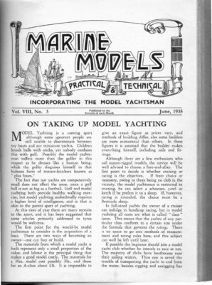 sy) LD woe VTPLLxCELL USNNSYSYSDNDNVNYD DDD NSAD DAD 02 2) =| TECHNICAL — INCORPORATING Vol. VIII, No. 2 THE MODEL Published on the Seventh of each Month SHIPS’ YACHTSMAN May, 1935 BOATS By G. W. Munro (Continued from page 18.) HE longboat that I am giving this month is much shorter than that given last month. It is taken from ~The Shipwright’s Vademecum” of 1805, an abridgment of Steel’s Naval Architecture. When compared with the longboat of 1754 st will be noticed that, apart from length, the floors are considerably flatter and the hull generally is shallower. The moulded beam is ft. lin. against the 9ft. in the earlier boat. The moulded depth is 2ft. 10in. in the present design against 3ft. 9in. in the earlier design. While the main characteristics remain the same it will be noticed that the bow is mot so blunt above water and the design somewhat sweeter throughout. We may presume that the present illustration represents a longboat, such as one would expect to find in the Merchant Service. In fact, this design would do admirably for an Indiaman—she is sturdy, has a large carrying capacity, and should be a good sea boat. The longboat gave way to the launch at the end of the 18th century, and the present design, together with the one to be given mext month, may be taken as the final development of this class of boat in the Navy. lam under the impression that the merchantmen carried this type of boat for a great deal longer, their lines remaining very much the same—in fact, the writer has a model, built by a middle 19th century shipwright, and one of the boats exactly corresponds to the present design in every way. There is not a great deal that can be said about the construction of this boat that was not said in the previous number on the longboat of 1754. The scantlings are very much the same in every way, and the interior detail shown in the one may be adapted to the other. The keel is 6in. deep by 4in. wide— the lower part being thinned off to 24in. at the bottom. In the design, every second section is shown in the middle from 6 to D. The shape of the keelson is shown as a pair of dotted lines running just above the keel and curving up at each end. A grating is fitted over this at the bow, and again at the stern in the way of the benches. There is a bulkhead forming a locker under the sternsheets. Four of the five thwarts are fixed and have knees at each side, as shown. The middle thwart is a loose one and removable when a large item is to be carried as part of the load. The mast thwart is 13in. thick and each of the others 14in. The hole for the mast is cut on the after side of the thwart, generally the second from the bow, and the thwart is broader for about two-thirds of its length in , the middle. The stern has a rake of 10° with the transom let into the upper part. The body of the boat should be represented as 30 MARINE clincher-built from the garboard up to the upper strake. From here a rubbing strake runs the length of the boat. Above the upper strake washboards are fitted with slots cut to take the oars. These washboards have a pair of compensation pieces at each side to take the strain of the oars when the men are rowing. There is no rule for the number of strakes in each side, but eleven might be taken as a fair representation of the usual English practice. Of course the quality of the wood available will be a deciding factor, but boat builders of Northern Europe were, and still are, inclined to use very broad planks or strakes compared with those seen on English clincher-built boats. The rudder is hung on three pintles as shown. Two eye-bolts are driven into the middle and upper part of the stern to support the two downward pointing pintles. The bottom one, just above the keel, is more substantial and has plates on each side of the i i i MODELS sternpost as far forward as the butts of the strakes. A long pintle points upward from this one and should bear most of the weight of the rudder. A square hole is cut through the rudder-head to take the tiller which should be about 2ft. 6in. long. A turk’s head or a piece of fancy carving is usually done at the inner end of the tiller. The shape of the breasthook and the ears can be seen at the stem in the plan view. The scale of this drawing, like that of last month, is tin. = 1 ft. It is doubtful if the average modeller will attempt to build a ship’s boat at this scale, but resort to the usual and more suitable method of carving it out. Nevertheless, I have seen a naval cutter, complete with machine-gun, clincher-built and complete to the last pin at the scale of tin.=1ft. This model is at present in the Science Museum at South Kensington, and is the most beautiful piece of modelling I have ever seen. The most usual method of representing the different strakes on a ship’s boat is to draw I if a3 A SHIP’S LONGBOAT OF 1805 1 J ji I : ] is =) MARINE them in with ink or pencil, exactly like the deck lines. This gives a very fair represen- tation of the layers of wood in the clincher work. It scale must be mentioned, remembered if 4in. that, boards at are the to be represented they will be | /84in. on the model before being dressed down, etc. In other words, the clincher work will be about the thickness of the paper used in this Magazine. (To be continued.) MODELS 31 FLEETWOOD INTERNATIONAL REGATTA NTRIES have been received ” from France, E; Germany, Norway and the United States. The former will, we understand, be represented by ‘‘ Gaulois,”” a new boat built by M. R. Authenac to his own designs. She is being tested and tuned up against a model to the designs of Mr. Reg. Lance, who was responsible for the international winners “ Little Nell ’’ and ‘* Flame.’’ The United States will be represented by the winner of the American National A-class Championship. As usual, the British boat will be the winner of the British A-class Championship, which immediately precedes the International Regatta
