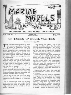 J ceteainindeed oe. — Vol. VIII, No. 5 Published on the Seventh of each Month August, 1935 ON TAKING UP MODEL YACHTING (Continued from page 83.) AVING tuned the yacht up for beat- gives trouble, the rudder gye should be resorted to. Performance on the gye depends on the correct strength of rubber being used, correct position of the attachment to hull and boom, and, finally, correct adjustment and H ing to windward under first suit, the first possible opportunity should be taken to balance her under second and third suits. These should be arranged so that the model sails with the same mast position and rake as under first suit. This is done by use. varying the size of jib and, to a lesser extent, by the distance to which the jib tack is hooked out. You are at liberty to place the yib tack as you wish, provided the limits of the first suit are not exceeded. Another point to be attended to is the beating gye. (Pace Mr. Stewart! We are using the official spelling of the M.Y.A. Rules.) Gyes are of two kinds—the ordinary rubber gye and the rudder gye. The former consists of a rubber spring with an adjustable cord tail. The latter is similar but has an extension cord to the rudder quadrant. In light winds, and provided the sail-plan has not too high an aspect ratio (proportion of height to breadth), the rudder gye is probably better as it is not so drastic in action. Boats with very high, narrow plans need a rudder gye, and in heavy boats and winds the rudder gye is more certain and positive in action. A good deal depends on the boat herself, but if the ordinary gye _ The leverage exerted by the gye depends firstly on the position of attachment to the hull. The further forward this is the more leverage is exerted up to a point, but on no account must this be forward of the axis of rotation of the hull. The best position is probably just aft of the C.L.R. The point of attachment to the boom should be as far aft as possible. Greater liberties can be taken in this respect with a rudder gye. One frequent source of trouble with a high, narrow sail is that the boom rises when the boat is on the gye, and in consequence the sail spills the wind and loses its power to bring the boat to the wind. The kicking strap will stop this and the point of attachment of the gye to the hull can possibly be brought more aft. Experiment is the only way to get the gye to function perfectly. Most yachts these days have a three-eyed jockey on their forward horse. Adjust the jib on the centre eye correctly for beating, then shift to what will w. ae PE INCORPORATING THE MODEL YACHTSMAN ek i MARINE MODELS eee ee 110 ©) Fe. er ae anak arian gee RD, pM fal temgf pm! 2 3 ited Br be the leeward eye on the off-shore tack. This will make the sheet a thought slacker on this tack and so help the boat to come up into the wind. On the inshore (or long) tack she will be a shade tighter, which will keep her going full-and-bye. In putting a boat off on the gye, see that the jib is full and the weight of the wind in the mainsail stretching the rubber of the gye. If it is not doing so, the tension is too tight or the rubber too strong. If a boat is turned off very square with a tight gye she will slam round violently. If the gye is inoperative through being too slack, the boat will simply sail off on the off-shore tack and refuse to come about. If the sail rises she may not only refuse to gye but even bolt right away from the wind. Occasionally one comes across boats that answer the gye all right up to the point when they come head to wind, but then hang in irons and hesitate unduly, sometimes even paying off on the original tack. Probably the gye is not quite strong enough and experiment should be made to rectify this fault. If all else fails, but only when all else has failed, recourse may be made to a Liverpool Boy. This is a very light rubber cord that hauls the jib aweather on one tack. It is put on the side opposite the beating gye. When you are not actually beating to windward but close reaching, the gye can be put on the lee side and will remain idle unless the boat is suddenly headed, when it is useful to make a short tack. It will also save the situation if the boat is accidentally put about on to the wrong tack. The set of the sails makes a lot of difference in windward work, so the novice should take pains to get his sails setting nicely. The forestay should be set up tight and the jib halliard sufficiently tight to keep the sail without sag. There is no need to set the halliard up unduly as, the sail being hanked to the stay, the latter takes the strain. The clew outhaul should be just tight enough to keep the corner of the jib to the jib club but not tight enough to strain the sail out of shape. Turning to the mainsail, the tack hook or lacing should be arranged to get the corner of the sail right into the angle formed by mast and boom so that the luff pulls straight. The lacing keeps the sail to mast and boom, so there is no need to set up halliards and clew outhaul unduly tight, but they should be tight enough to keep the sail in shape and close to the spars. No wrinkle should appear at the clew. _ If there is a “ cut” across the sail at any point it is a sign that the lacing (or wire jackstay, as the case may be) requires easing up at this point. If the yacht has wire jackstays up the mast or along the boom and you are having trouble in this respect, try substituting a cord lacing round the spar. When sails get wet, halliards and clew outhauls require easing up, and in any case this should always be done when you have | finished sailing, as it gives the sails a chance to recover their shape and keeps the fabric from losing its elasticity. For the benefit of the novice it may be mentioned that the forward side of the sail is the “* luff,” the after side the “* leach,” and the bottom the “ foot.” The front bottom corner is the “tack,” the after corner the clew,” and the upper ccrner the “ head.