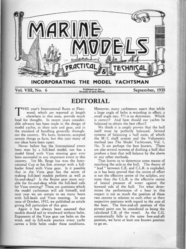 7 he ol WS Hata aevee Vol. VIII, No. 6 Published on the Seventh of each Month EDITORIAL HIS year’s International Races at Fleetwood, which are reported at length elsewhere in this issue, provide much food for thought. In recent years considerable advance has been made in the design of model yachts, in their sails and gear, and in the standard of handling generally throughout the country. We have, however, accepted certain things as facts, but this year many of our ideas have been upset. Never before has the International event been won by a full-keel model, nor has a model fitted with Vane steering gear ever been successful in any important event in this country. Yet Mr. Berge has won the International Cup at his first attempt with a fullkeeler fitted with Vane gear. Is it possible that in the Vane gear lies the secret of making full-keel models perform as well as fin-and-skeg? Is the Braine gear more suitable for fin-and-skeg while the full-keel calls for Vane steering? These are questions which the model yachtsman will ask himself, and next year we are certain to see many boats with full-keels and Vane steering. In our issue of October, 1932, we published an article giving full particulars of this gear. Again it has always been assumed that models should sail to windward without helm. Exponents of the Vane gear use helm on the wind, and in full-scale practice every yacht carries a little helm under these conditions. Moreover, many yachtsmen assert that while a large angle of helm is retarding in effect, a small angle (say, 5°) is no detriment. Which is correct? And how should our yachts be balanced to obtain the best effect? We think it is amply proven that the hull itself must be perfectly balanced. Several systems of balancing a hull exist, of which the M/C shelf system and the Volumetric method (see The Model Yachtsman, Vol. 1, No. 3) are perhaps the best known. There are also several systems of drafting a hull that produce a boat that will balance by the above or any other methods. That leaves us to determine some means of matching the sails-to the hull. The theory of “lead ” between C.E. and C.L.R. is exploded, as it has been proved that the centre of effort is not the effective centre of the sailplan, any more than the C.L.R. is the effective centre of lateral pressure of water against the leeward side of the hull. Yet what determines the performance of a boat in this respect is not so much the position of these two centres in relation to each other as their respective positions with regard to the axis of the boat. The fore-and-aft position of this pivotal point can be considered as being the calculated C.B. of the vessel. As the C.G. automatically falls in the same fore-and-aft position, we have at least one known position to go on. ey Osal bet rs i ree oe ae epee 134 MARINE Turning to other matters arising from this year’s International Races, we draw attention to the conduct of H.M. Customs at Southampton. When M. Boussy, the French representative, arrived at Southampton en route for Fleetwood, his yacht was impounded and a duty of £5 demanded. He was kept hanging about for two whole days before matters were settled. Ultimately the duty demanded (£5) was paid and M. Boussy was informed that it would not be recoverable when he took his boat home again. A foreigner can come to Britain to play in a golf or tennis tournament without being treated in this intolerable fashion. It is true that a model yacht is more valuable than a bag of golf clubs or a tennis racket, yet this discrimination against model yachtsmen should not exist. Even if some security is considered necessary by the Customs, why should it not be recoverable on re-export as in the case of deposit on cars belonging to visitors from abroad? What it amounts to, is that M. Boussy was fined £5 for bringing his boat to compete in a race in Britain. We ask, what is the practice with regard to 12 sq. metre sharpies sailing in international events? Do they pay a heavy nonrecoverable duty? These little yachts are imported by steamer, as was M. Boussy’s model, and the case is on all-fours, except that the model yachtsman received very different treatment. The M.Y.A. Regatta Committee communicated with the Customs at the various ports beforehand. At Hull, Harwich and Liverpool, the foreign competitors were treated with every consideration and the necessary facilities for free entry extended. At Southampton alone was this difficulty experienced. The matter must not be allowed to rest, but demands official investigation. There is at least one Member of Parliament who is an active model yachtsman, though no doubt other members of our legislature are interested in the sport. May we ask this gentleman to raise the question in the House of Commons? Our tourist trade is most important to the country, and innocent visitors, even if they are model yachtsmen, must not be subject to the whims of minor officials. Again, our railways discriminate against The cricketer can take ‘ model yachtsmen. MODELS his bag with him without payment, but the model yachtsman must pay extra for his yacht unless he takes her in the carriage with him, a proceeding decidedly unfair to his fellow travellers in a crowded trains! And when he takes a special ticket for his boat, what does he get? A perambulator ticket! Model yachtingis a growing sport. Sailing lakes form part of the amenities of up-to-date resorts, and soon every borough will have its model yachting lake as well as its tennis courts, bowling greens and swimming pool. It is, therefore, time that these restrictions are abolished and model yachting receives as good treatment as other sports. In conclusion, may we write a few lines about ourselves? Our present issue, the 1935 September Special Number of MAriINE MODELS, is bigger and, we hope, better than any previous number. Year by year the Magazine has grown, and the present number is four times the size of our first issue, while ord