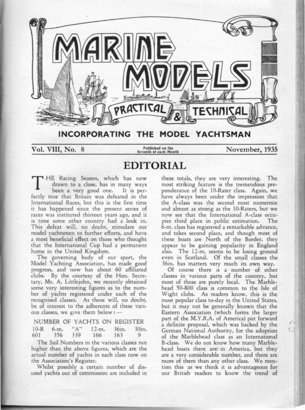 ONAI! mult} n . Dea a= Paanzs = INCORPORATING Vol. VIII, No. THE MODEL Published on the Seventh of each Month 8 YACHTSMAN November, 1935 EDITORIAL HE Racing Season, which has now drawn to a close, has in many ways been a very good one. It is perfectly true that Britain was defeated in the International Races, but this is the first time it has happened since the present series of races was instituted thirteen years ago, and it is time some other country had a look in. This defeat will, no doubt, stimulate our model yachtsmen to further efforts, and have a most beneficial effect on those who thought that the International Cup had a permanent home in the United Kingdom. The governing body of our sport, the Model Yachting Association, has made good progress, and now has about 60 affiliated clubs. By the courtesy of the Hon. Secretary, Mr. A. Littlejohn, we recently obtained some very interesting figures as to the num- ber of yachts registered under each of the recognised classes. As these will, no doubt, be of interest to the adherents of these various classes, we give them below :— NUMBER OF YACHTS ON REGISTER 10-R 601 6m. 356 “A” ©3339 12-m. 166 36in. 163 30in. 9 The Sail Numbers in the various classes run higher than the above figures, which are the actual number of yachts 1n each class now on the Association’s Register. Whilst possibly a certain number of disused yachts out of commission are included in these totals, they are very interesting. The most striking feature is the tremendous preponderance of the 10-Rater class. Again, we have always been under the impression that the A-class was the second most numerous and almost as strong as the 10-Raters, but we now see that the International A-class occupies third place in public estimation. The 6-m. class has registered a remarkable advance, and takes second place, and though most of these boats are North of the Border, they appear to be gaining popularity in England also. The 12-m. seems to be losing ground even in Scotland. Of the small classes the 36in. has matters very much its own way. Of course there is a number of other classes in various parts of the country, but most of these are purely local. The Marblehead 50-800 class is common to the Isle of Wight clubs. As readers know, this is the most popular class to-day in the United States, but it may not be generally known that the Eastern Association (which forms the larger part of the M.Y.R.A. of America) put forward a definite proposal, which was backed by the German National Authority, for the adoption of the Marblehead class as an International B-class. We do not know how many Marblehead boats there are in America, but they are a very considerable number, and there are more of them than any other class. We mention this as we think it is advantageous for our British readers to know the trend of 212 MARINE events abroad as well as in this country. One thing that all these figures clearly prove is that a simple rating rule is popular with the average model yachtsman. ~* This year’s 10-Rater Championship marks an advance on anything this class has done hitherto, but we hope to see this event made into an even bigger thing next season. The Model Yachting Association has had a special Sub-Committee working for many months on the revision of the Sailing Rules and General Rules governing rating. The result is now before the Council and will come before a General Meeting in due course, so the new rules should be out in plenty of time for the 1936 season. As matters are still sub judice we must refrain from comment on suggested alterations and amendments, but some of them are distinctly radical and may excite considerable comment. MEMBERS OF THE MODELS QUEENSTOWN, SOUTH AFRICA The photograph reproduced on this page shows a group of members of the Queenstown (South Africa) M.Y.C. The lake is about 500 feet long, but much of the shore is faced with rough rock and boulders, which soon play havoc with a boat’s sides. The class used is a 36in. Restricted class, with a weight limit of 12 lb. without rig. In N.W. or S.E. winds there are very heavy seas foot high, of weather up. Boats score 4, 3, they arrive up to a and if a boat gets ashore in this kind she is liable to be damaged or broken are usually sailed in heats of four, and 2, 1, according to the order in which home. AUCKLAND, NEW ZEALAND There are now seven model yacht clubs in Auck- land, but, as there are no ponds or lakes, sailing is from dinghies in the harbour round a triangular course. The rule used is 48in. L.O.A., to which 1/3 beam has recently been added. There are no other restrictions. The result is that boats draw up to 2ft. of water and carry up to 40 Ib. of lead. Many local modelmen favour a modern rating rule producing a more desirable type. QUEENSTOWN M.Y.C., SOUTH AFRICA MARINE HOW MODELS TO MAKE MODEL SHIP STEAMER FITTINGS 213 AND By A. P. Isarp, A.M.I.Mech.E. (Continued from page 188.) ARTICULARS of ordinary lifebuoys, with notes on their construction, will be found on page 105 of the August, 1934, issue of MARINE MOpELs. A Dutch horseshoe lifebuoy is shown in Fig. 115. This is canvas-covered, and has a lifeline attached. The size of this lifebuoy is approximately 18in. inside diameter, 14in. between the extremities of the arms and width of arms 7in., the overall size (not including lifeline) being about 32in. x 30in. The body should be carved from hard wood and the lifeline attached by means of white tape of suitable width, sewn in its proper position or glued with waterproof glue. Finish by painting neatly all over with white enamel. form the buoy. The arms are provided with rope hand-grips. The lowest of these spheres has two receptacles; in one is a whistle for the person in the water to signal with, while the other contains a small flask of brandy, or other suitable restorative. The buoy rests upon two angle-iron girders a bent to the shape shown, a guide rod b passes through two brackets c and also th