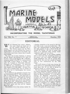 ONAI! mult} n . Dea a= Paanzs = INCORPORATING Vol. VIII, No. THE MODEL Published on the Seventh of each Month 8 YACHTSMAN November, 1935 EDITORIAL HE Racing Season, which has now drawn to a close, has in many ways been a very good one. It is perfectly true that Britain was defeated in the International Races, but this is the first time it has happened since the present series of races was instituted thirteen years ago, and it is time some other country had a look in. This defeat will, no doubt, stimulate our model yachtsmen to further efforts, and have a most beneficial effect on those who thought that the International Cup had a permanent home in the United Kingdom. The governing body of our sport, the Model Yachting Association, has made good progress, and now has about 60 affiliated clubs. By the courtesy of the Hon. Secretary, Mr. A. Littlejohn, we recently obtained some very interesting figures as to the num- ber of yachts registered under each of the recognised classes. As these will, no doubt, be of interest to the adherents of these various classes, we give them below :— NUMBER OF YACHTS ON REGISTER 10-R 601 6m. 356 “A” ©3339 12-m. 166 36in. 163 30in. 9 The Sail Numbers in the various classes run higher than the above figures, which are the actual number of yachts 1n each class now on the Association’s Register. Whilst possibly a certain number of disused yachts out of commission are included in these totals, they are very interesting. The most striking feature is the tremendous preponderance of the 10-Rater class. Again, we have always been under the impression that the A-class was the second most numerous and almost as strong as the 10-Raters, but we now see that the International A-class occupies third place in public estimation. The 6-m. class has registered a remarkable advance, and takes second place, and though most of these boats are North of the Border, they appear to be gaining popularity in England also. The 12-m. seems to be losing ground even in Scotland. Of the small classes the 36in. has matters very much its own way. Of course there is a number of other classes in various parts of the country, but most of these are purely local. The Marblehead 50-800 class is common to the Isle of Wight clubs. As readers know, this is the most popular class to-day in the United States, but it may not be generally known that the Eastern Association (which forms the larger part of the M.Y.R.A. of America) put forward a definite proposal, which was backed by the German National Authority, for the adoption of the Marblehead class as an International B-class. We do not know how many Marblehead boats there are in America, but they are a very considerable number, and there are more of them than any other class. We mention this as we think it is advantageous for our British readers to know the trend of 212 MARINE events abroad as well as in this country. One thing that all these figures clearly prove is that a simple rating rule is popular with the average model yachtsman. ~* This year’s 10-Rater Championship marks an advance on anything this class has done hitherto, but we hope to see this event made into an even bigger thing next season. The Model Yachting Association has had a special Sub-Committee working for many months on the revision of the Sailing Rules and General Rules governing rating. The result is now before the Council and will come before a General Meeting in due course, so the new rules should be out in plenty of time for the 1936 season. As matters are still sub judice we must refrain from comment on suggested alterations and amendments, but some of them are distinctly radical and may excite considerable comment. MEMBERS OF THE MODELS QUEENSTOWN, SOUTH AFRICA The photograph reproduced on this page shows a group of members of the Queenstown (South Africa) M.Y.C. The lake is about 500 feet long, but much of the shore is faced with rough rock and boulders, which soon play havoc with a boat’s sides. The class used is a 36in. Restricted class, with a weight limit of 12 lb. without rig. In N.W. or S.E. winds there are very heavy seas foot high, of weather up. Boats score 4, 3, they arrive up to a and if a boat gets ashore in this kind she is liable to be damaged or broken are usually sailed in heats of four, and 2, 1, according to the order in which home. AUCKLAND, NEW ZEALAND There are now seven model yacht clubs in Auck- land, but, as there are no ponds or lakes, sailing is from dinghies in the harbour round a triangular course. The rule used is 48in. L.O.A., to which 1/3 beam has recently been added. There are no other restrictions. The result is that boats draw up to 2ft. of water and carry up to 40 Ib. of lead. Many local modelmen favour a modern rating rule producing a more desirable type. QUEENSTOWN M.Y.C., SOUTH AFRICA MARINE HOW MODELS TO MAKE MODEL SHIP STEAMER FITTINGS 213 AND By A. P. Isarp, A.M.I.Mech.E. (Continued from page 188.) ARTICULARS of ordinary lifebuoys, with notes on their construction, will be found on page 105 of the August, 1934, issue of MARINE MOpELs. A Dutch horseshoe lifebuoy is shown in Fig. 115. This is canvas-covered, and has a lifeline attached. The size of this lifebuoy is approximately 18in. inside diameter, 14in. between the extremities of the arms and width of arms 7in., the overall size (not including lifeline) being about 32in. x 30in. The body should be carved from hard wood and the lifeline attached by means of white tape of suitable width, sewn in its proper position or glued with waterproof glue. Finish by painting neatly all over with white enamel. form the buoy. The arms are provided with rope hand-grips. The lowest of these spheres has two receptacles; in one is a whistle for the person in the water to signal with, while the other contains a small flask of brandy, or other suitable restorative. The buoy rests upon two angle-iron girders a bent to the shape shown, a guide rod b passes through two brackets c and also th