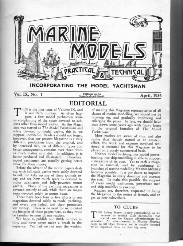 te tree, id. 4 j ne WAR . 4 A an >= — i_ ~ iG = 3 a oa — = = i — – = = jes MMi tse = D set SHNISAL, aa ec & Vol. IX, No. 1 Published on the Seventh of each Month April, 1936 EDITORIAL HIS is the first issue of Volume IX, and is our 97th number. As often happens, a few model yachtsmen write us complaining of the space devoted to sub- jects other than model yachts. As this Magazine was started as The Model Yachtsman and solely devoted to model yachts, this is, we suppose, inevitable. Readers should not forget, however, that our present Magazine is a very different production from the original, and by increased size, use of different types and better arrangement, contains over three times as much matter as it did. In addition, it is better produced and illustrated. Therefore, model yachtsmen are actually getting better value for their money. Before the advent of the motor, papers dealing with full-scale yachts were solely devoted to sail, but take up any of these journals today and see how much space is devoted to motor auxiliaries and fully-powered motor yachts. None of the yachting magazines is devoted entirely to sail, while there are magazines devoted solely to motor boats. There have been four or five efforts to run magazines devoted solely to model yachting, and every one failed, and their promoters lost money. There is no need for us to detail the histories of these papers here, as they must be familiar to most of our readers. We hope to publish our 100th number in July, and have never made a break in the sequence. Yet had we not seen the wisdom of making this Magazine representative of all classes of marine modelling, we should not be carrying on, and gradually improving and enlarging the paper. In fact, we should have shut down some years ago with heavy losses to the original founders of The Model Yachtsman. Most readers are aware of this, and also realise that though started as an amateur effort, the work and expense involved rendered it essential for this Magazine to be placed on a purely commercial basis. Neither model yachting, nor model powerboating, nor ship-modelling is able to support a magazine of its own. Yet to each a maga- zine is essential, and by combining ll branches of marine modelling MARINE MopELs becomes possible. It is our desire to improve the Magazine in every direction and increase the size. To make this possible, the support of every model yachtsman, powerboat man and ship modeller is essential. Readers are, therefore, requested to bring the Magazine to the notice of friends, and to get us new subscribers. TO CLUBS HE Sailing Season is now approaching, so we T venture to remind Club Secretaries that special rates available. An for Regatta advertisements are advertisement in MARINE MOopELs helps to fill Open Events, and is usually inserted by all important clubs for their big races. a MARINE MODELS 2 HOW TO MAKE MODEL SHIP AND STEAMER FITTINGS By A. P. IsARD, A.M.I.Mech.E. spokeshave. The finishing off is done by INCE, in the last article, we were discusslightly using No. 00 glass-paper and running lathe at the highest possible speed. Spars the ly. ship’s spars follow quite natural finally finished with a good varnish or are r numbe large very a that fact a Now it is unless the prototype has painted spars. polish, disfor of models are particularly noticeable of small power-driven craft wire models For l genera the g spoilin thus spars, proportional but it must be worked to its used, be may and appearance of an otherwise attractive etc., being easily solcrosstrees, taper, proper show the gives really This well-made model. the whole painted and position, in dered the lies away to the trained eye, and herein correctly. ng. buildi model secret of artistic In large-scale working models proper holMost models have spars of much too large masts should be made and fitted, as these low were size e tionat propor the if a diameter, and, the practical purpose of saving weight serve indeed ypes, they would S ing cables and ropes, a few notes on the fitted to the protot appear crude. Even in sailing models it is not often that a model is demasted in a fair contest with the elements. Spars are, of course, the mast, which may be simply a pole mast (that is, a mast with- Mast fittings, mee as maststeps, goose- out a topmast and complete in itself), and necks, etc., have been previously described in Masts for steamers are usually the pole sort, Masts are usually carried right down In through the main deck to the keelson. some small craft, such as barges, steam tugs, and the like, the masts are frequently housed in tabernacles on main deck level, thus enabling them to be lowered away for passage under obstructions, such as fixed bridges. Although it may be said that the ubiquitous outboard motor can hardly be described as a booms, gaffs, bowsprits, etc. a re without loss of strength. In this connection it must again be pointed out that it is important to keep the weight of all tophamper . down to the lowest possible amount. and are used for signalling purposes and to carry a number of booms complete with gins and tackles, thus forming derricks for hoisting cargo in and out of holds, and many other obvious and useful purposes. They are nearly always hollow steel tubes made of plates riveted up in sections and welded together. In very large ships these masts have internal ladders, up which the crow’s-nests can be reached, or, in the case of big capital warships, leading to fighting tops, fire control stations, The fighting tops in the old days of wooden walls, from which riflemen ramming home their charges down their old muzzle-loading muskets, fired down on the decks of the enemy ship alongside, were reached by climbing up the ratlines on the lower shrouds, running from the channels on the ship’s side up etc. to the tops. The majority of model masts and spars are made from timber, and for this purpose yellow pine is specially recommended. For those who possess lathe