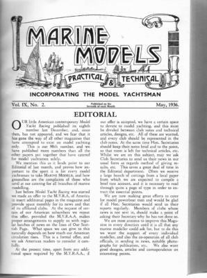 te tree, id. 4 j ne WAR . 4 A an >= — i_ ~ iG = 3 a oa — = = i — – = = jes MMi tse = D set SHNISAL, aa ec & Vol. IX, No. 1 Published on the Seventh of each Month April, 1936 EDITORIAL HIS is the first issue of Volume IX, and is our 97th number. As often happens, a few model yachtsmen write us complaining of the space devoted to sub- jects other than model yachts. As this Magazine was started as The Model Yachtsman and solely devoted to model yachts, this is, we suppose, inevitable. Readers should not forget, however, that our present Magazine is a very different production from the original, and by increased size, use of different types and better arrangement, contains over three times as much matter as it did. In addition, it is better produced and illustrated. Therefore, model yachtsmen are actually getting better value for their money. Before the advent of the motor, papers dealing with full-scale yachts were solely devoted to sail, but take up any of these journals today and see how much space is devoted to motor auxiliaries and fully-powered motor yachts. None of the yachting magazines is devoted entirely to sail, while there are magazines devoted solely to motor boats. There have been four or five efforts to run magazines devoted solely to model yachting, and every one failed, and their promoters lost money. There is no need for us to detail the histories of these papers here, as they must be familiar to most of our readers. We hope to publish our 100th number in July, and have never made a break in the sequence. Yet had we not seen the wisdom of making this Magazine representative of all classes of marine modelling, we should not be carrying on, and gradually improving and enlarging the paper. In fact, we should have shut down some years ago with heavy losses to the original founders of The Model Yachtsman. Most readers are aware of this, and also realise that though started as an amateur effort, the work and expense involved rendered it essential for this Magazine to be placed on a purely commercial basis. Neither model yachting, nor model powerboating, nor ship-modelling is able to support a magazine of its own. Yet to each a maga- zine is essential, and by combining ll branches of marine modelling MARINE MopELs becomes possible. It is our desire to improve the Magazine in every direction and increase the size. To make this possible, the support of every model yachtsman, powerboat man and ship modeller is essential. Readers are, therefore, requested to bring the Magazine to the notice of friends, and to get us new subscribers. TO CLUBS HE Sailing Season is now approaching, so we T venture to remind Club Secretaries that special rates available. An for Regatta advertisements are advertisement in MARINE MOopELs helps to fill Open Events, and is usually inserted by all important clubs for their big races. a MARINE MODELS 2 HOW TO MAKE MODEL SHIP AND STEAMER FITTINGS By A. P. IsARD, A.M.I.Mech.E. spokeshave. The finishing off is done by INCE, in the last article, we were discusslightly using No. 00 glass-paper and running lathe at the highest possible speed. Spars the ly. ship’s spars follow quite natural finally finished with a good varnish or are r numbe large very a that fact a Now it is unless the prototype has painted spars. polish, disfor of models are particularly noticeable of small power-driven craft wire models For l genera the g spoilin thus spars, proportional but it must be worked to its used, be may and appearance of an otherwise attractive etc., being easily solcrosstrees, taper, proper show the gives really This well-made model. the whole painted and position, in dered the lies away to the trained eye, and herein correctly. ng. buildi model secret of artistic In large-scale working models proper holMost models have spars of much too large masts should be made and fitted, as these low were size e tionat propor the if a diameter, and, the practical purpose of saving weight serve indeed ypes, they would S ing cables and ropes, a few notes on the fitted to the protot appear crude. Even in sailing models it is not often that a model is demasted in a fair contest with the elements. Spars are, of course, the mast, which may be simply a pole mast (that is, a mast with- Mast fittings, mee as maststeps, goose- out a topmast and complete in itself), and necks, etc., have been previously described in Masts for steamers are usually the pole sort, Masts are usually carried right down In through the main deck to the keelson. some small craft, such as barges, steam tugs, and the like, the masts are frequently housed in tabernacles on main deck level, thus enabling them to be lowered away for passage under obstructions, such as fixed bridges. Although it may be said that the ubiquitous outboard motor can hardly be described as a booms, gaffs, bowsprits, etc. a re without loss of strength. In this connection it must again be pointed out that it is important to keep the weight of all tophamper . down to the lowest possible amount. and are used for signalling purposes and to carry a number of booms complete with gins and tackles, thus forming derricks for hoisting cargo in and out of holds, and many other obvious and useful purposes. They are nearly always hollow steel tubes made of plates riveted up in sections and welded together. In very large ships these masts have internal ladders, up which the crow’s-nests can be reached, or, in the case of big capital warships, leading to fighting tops, fire control stations, The fighting tops in the old days of wooden walls, from which riflemen ramming home their charges down their old muzzle-loading muskets, fired down on the decks of the enemy ship alongside, were reached by climbing up the ratlines on the lower shrouds, running from the channels on the ship’s side up etc. to the tops. The majority of model masts and spars are made from timber, and for this purpose yellow pine is specially recommended. For those who possess lathe
