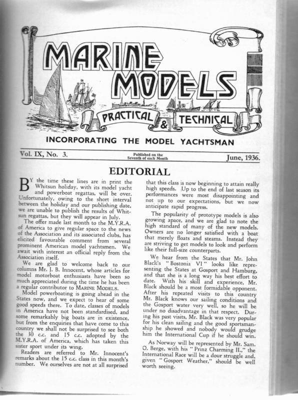 Yi “y N ‘ Ny \ WLI 5s \ X\ UN Vol. IX, No. 3. Published on the Seventh of each Month June, 1936. EDITORIAL Y the time these lines are in print the Whitsun holiday, with its model yacht and powerboat regattas, will be over. Unfortunately, owing to the short interval between the holiday and our publishing date, we are unable to publish the results of Whitsun regattas, but they will appear in July. The offer made last month to the M.Y.R.A. of America to give regular space to the news of the Association and its associated clubs, has elicited favourable comment from several Prominent American model yachtsmen. We wait with interest an official reply from the Association itself. We are glad to welcome back to our columns Mr. J. B. Innocent, whose articles for model motorboat enthusiasts have been so much appreciated during the time he has been 2 regular contributor to MARINE MopELs. Model powerboating is going ahead in the States now, and we expect to hear of some good speeds there. To date, classes of models m America have not been standardised, and some remarkably big boats are in existence, but from the enquiries that have come to this country we shall not be surprised to see both the 30 cc. and 15 cc. adopted by the MLY.R.A. of America, which has taken this sister sport under its wing. Readers are referred to Mr. Innocent’s remarks about the 15 c.c. class in this month’s number. \ We ourselves are not at all surprised that this class is now beginning to attain really high speeds. Up to the end of last season its performances were most disappointing and not up to our expectations, anticipate rapid progress. but we now The popularity of prototype models is also growing apace, and we are glad to note the high standard of many of the new models . Owners are no longer satisfied with a boat that merely floats and steams. Instead they are striving to get models to look and perform like their full-size counterparts. We hear from the States that Mr. John Black’s “ Bostonia VI” looks like repre- senting the States at Gosport and Hambu rg, and that she is a long way his best effort to date. With his skill and experience, Mr. Black should be a most formidable oppone nt. After his repeated visits to this countr y Mr. Black knows our sailing conditions and the Gosport water very well, so he will be under no disadvantage in that respect. During his past visits, Mr. Black was very popula r for his clean sailing and the good sportsmanship he showed and nobody would grudge him the International Cup if he should win. As Norway will be represented by Mr. Sam. O. Berge, with his “ Prinz Charming II.,” the International Race will be a dour strugg le and, given “Gosport Weather,” should be well worth seeing. 34 MARINE MODELS ~-PETROL ENGINE and HYDROPLANE TOPICS By J. B. INNOCENT Fr people permit me to apologise to those people I disappointed by not contributing to our April and May numbers. Unfortunately, it was quite impossible for me to do the necessary work, and | am afraid | shall have to modify my programme to some slight extent as I am now without the use of a workshop. Naturally this defect will be remedied as soon as possible, and the deviation from my intentions should not be of any magnitude. Since my last article was published, our first M.P.B.A. Regatta has come and gone. In this Regatta the home club, the Victoria, more than held their own, for they won the pole event with the only home boat available, Mr. Clifford’s ‘* Crackers ” to wit, and the steering competition with a boat that had never competed in one before. Friend Vines was a trifle below his usual immaculate standard, but succeeded in giving his club two places. The rest of the prizes were annexed by the South London Club, with the aid of its fleet of speed boats and Ted Vanner’s trusty old straight runner. One matter of unusual interest was the first public appearance of Mr. French’s 15 cc. ‘Little Star.” The performance of this boat was somewhat marred by an attack of temperament and a faulty switch, but for all this it showed us that the earlier 15 c.c. were not very clever, for it travelled at 30 m.p.h. Mr. French is the first person to produce anything resembling a high-speed racing engine in this class, but he tells me that the limit is by no means reached, for the motor will produce more power than its construction will stand. For this information I have to thank Mr. French, for he has shown that my own ideas of the possibilities of high speeds with baby motors is not so far-fetched after all. In fact, I expect to see the 15 c.c. jobs travelling at speeds that are only a few miles an hour below those of the 30 c.c. class. I promised to go through the machining of a very simple two-stroke for the benefit of those people who feel that a super job is beyond their abilities. Well, | duly machined the engine but have not so far been able to try it out, for there remain one or two minor items of fitting to be done before it is ready to run. The machining of the castings disclosed a slight error in the piston casting, but by finishing the head to the casting, and not to the drawing, trouble was avoided. Other variations from the drawings were the shortening of the stroke by | /32in., improved padding of the gudgeon pin and the provision of port bridges dividing the ports in two vertically to obviate the possibility of any catching of the port edges. The port sizes are much the same as the drawing, with the exception of the transfer port. This port I kept very shallow for a start, but made it considerably wider. I remarked in my last article that the piston dimensions were incorrectly shown, and in this respect the casting is more accurate than the drawing. The point is that a two-stroke piston should have a wall depth at least equal to the stroke, and preferably a little longer. If this is not done the exhaust port can become open to the crankcase during the inlet period, and whilst a motor will still f