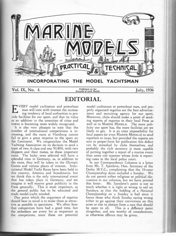 In /\ becxt) TECHNICAL ) SS amatlst aaa —_, aa = ° INCORPORATING Vol. IX, No. 4. THE MODEL Published on the Seventh of each Month cS YACHTSMAN July, 1936 a model yachtsmen or powerboat men, and properly organised regattas are the best advertisement and recruiting agency for our sport. Moreover, clubs should make a point of sending reports of regattas to their local Press as well as to MaRINE MopEts. The more publicity our sport has, the more facilities are we likely to get. It is an utter impossibility for local papers (or even MARINE MODELs) to send reporters to races, but provided the reports are sent in proper form for publication this defect can be remedied by clubs themselves, and probably the club secretary is more capable of putting together a report of a marine event than some cub reporter whose forte is reporting cases in the local police court. In our Correspondence Columns is a letter from Mr. T. Spenlove, Hon. Secretary of the Derby M.Y.C., complaining that the 10-rater Championship dates included a Sunday. We do not permit either religious or political discussions in our columns, but we have printed this letter. Mr. Spenlove’s point is not so much whether it is right or wrong to sail on Sundays, as that the holding of a National Championship on a Sunday is bad since it forces those who think Sunday racing wrong either to go against their convictions on this score or else to abstain from a race that should be open to all. This is a different point altogether, and one worthy of consideration, as otherwise offence may be given. _ VERY model yachtsman and powerboat man will note with interest the increasing tendency of local authorities to provide facilities for our sport, and that its value as an addition to the amenities of cities and towns is becoming more widely recognised. It is also very pleasant to note that the number of international competitions is increasing, and the races at Hamburg cannot fail to give a great impetus to the sport on the Continent. We congratulate the Model Yachting Association on its decision to send a team of two A-class and one 50-800, with two skippers and their mates, to these important races. The lucky ones selected will have a splendid time in Germany, as, in addition to the races, they will be taken to the Olympic Games and various places of interest. International Model Yacht Races have been held in this country, America and Scandinavia, but we think this is the only international event that has taken place in Germany, and we imagine it will receive great publicity in the Press generally. This is most important, as the general public has to be educated and made model-yacht minded. One point which the organisers of regattas should bear in mind is to make these as attractive as possible to spectators. We often hear that competitors have had a good time, but the onlookers are every bit as important as the competitors, since these are potential eS EDITORIAL 82 MARINE MODELS A MODEL OF THE ‘‘ QUEEN MARY” By Eric W. Foster, F.I.M.T. | nae model is 6ft. in length to a scale of .07in. to the foot, and has been constructed in every detail by hand. The hull is made of western cedar, kiln dried, and this proved excellent wood with which to work without being heavy. It is made on the ‘bread and butter” principle, with {in. planks glued and screwed. As the ship 1s designed to run by electricity, the depth below the waterline is slightly exaggerated to take the weight of two large Exide batteries. These batteries (type 3 EK 5A, capacity 13 A.H.) are fitted through the keel plank and made to rest on an din. steel plate, which is fitted snug to the ship, almost from end to end; the weight of this plate is 8lb. and makes the model extremely stable afloat. The superstructure was not completed until all the machinery for propulsion had been fitted, and completely satisfactory results obtained after experimenting under full working conditions in the water. By this means the approximate waterline was determined. It was then only necessary to add slight trimming ballast after the ship was finished to bring her to the correct waterline. The model is driven by a 12-volt motor, taken out of a Klaxonette horn; these little motors are beautifully made, are light, rev. at approximately 3,500, and use very little current. The drive is taken through a double- reduction gearbox of 4 to 1, made from ordinary Meccano gears, to four prop. shafts, turning in opposite directions. These gears are mounted on steel bushes at each end and formed by ordinary steel bolts, having first been drilled and then bolted through the side plates, with lock nuts on the back. The gearbox is made of sheet brass and partially filled with thick car engine oil; incidentally, the gearbox seems to retain its oil very successfully. The four propellers are coupled to the spindles from the gearbox by 3in. lengths of speedometer cable with couplings at each end. The propellers, which are 4-bladed and have been chromium-plated, were made by shaping the blades first and soldering into special slots cut into the streamline bosses, the bosses having been previously screwed and soldered to the ends of the prop. shafts. The prop. shafts pass through a packing gland at their ends, the thrust being taken by the nut which forms part of the gland, and which in turn is locked by a nut behind. The stern tubes are of copper, and made to appear as though they grow out of the stern by the use of plastic wood on sheet brass fitted between the stern tubes and the hull. The rudder is made to click into various positions by means of a spring and pawl dropping into the teeth of a gear wheel on the rudder spindle. Before the superstructure was commenced, Photo: J. Reade, Bournemouth MODEL OF ‘‘ QUEEN MARY,’’ BUILT BY ERIC W. FOSTER MARINE MODELS 83 Photo: J. Reade, Bournemouth THE MODEL OF THE ‘‘ QUEEN MARY’? UNDER WAY a template of the curve from bow to stern was made and used to get the correc