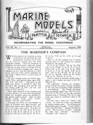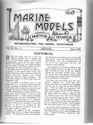 In /\ becxt) TECHNICAL ) SS amatlst aaa —_, aa = ° INCORPORATING Vol. IX, No. 4. THE MODEL Published on the Seventh of each Month cS YACHTSMAN July, 1936 a model yachtsmen or powerboat men, and properly organised regattas are the best advertisement and recruiting agency for our sport. Moreover, clubs should make a point of sending reports of regattas to their local Press as well as to MaRINE MopEts. The more publicity our sport has, the more facilities are we likely to get. It is an utter impossibility for local papers (or even MARINE MODELs) to send reporters to races, but provided the reports are sent in proper form for publication this defect can be remedied by clubs themselves, and probably the club secretary is more capable of putting together a report of a marine event than some cub reporter whose forte is reporting cases in the local police court. In our Correspondence Columns is a letter from Mr. T. Spenlove, Hon. Secretary of the Derby M.Y.C., complaining that the 10-rater Championship dates included a Sunday. We do not permit either religious or political discussions in our columns, but we have printed this letter. Mr. Spenlove’s point is not so much whether it is right or wrong to sail on Sundays, as that the holding of a National Championship on a Sunday is bad since it forces those who think Sunday racing wrong either to go against their convictions on this score or else to abstain from a race that should be open to all. This is a different point altogether, and one worthy of consideration, as otherwise offence may be given. _ VERY model yachtsman and powerboat man will note with interest the increasing tendency of local authorities to provide facilities for our sport, and that its value as an addition to the amenities of cities and towns is becoming more widely recognised. It is also very pleasant to note that the number of international competitions is increasing, and the races at Hamburg cannot fail to give a great impetus to the sport on the Continent. We congratulate the Model Yachting Association on its decision to send a team of two A-class and one 50-800, with two skippers and their mates, to these important races. The lucky ones selected will have a splendid time in Germany, as, in addition to the races, they will be taken to the Olympic Games and various places of interest. International Model Yacht Races have been held in this country, America and Scandinavia, but we think this is the only international event that has taken place in Germany, and we imagine it will receive great publicity in the Press generally. This is most important, as the general public has to be educated and made model-yacht minded. One point which the organisers of regattas should bear in mind is to make these as attractive as possible to spectators. We often hear that competitors have had a good time, but the onlookers are every bit as important as the competitors, since these are potential eS EDITORIAL 82 MARINE MODELS A MODEL OF THE ‘‘ QUEEN MARY” By Eric W. Foster, F.I.M.T. | nae model is 6ft. in length to a scale of .07in. to the foot, and has been constructed in every detail by hand. The hull is made of western cedar, kiln dried, and this proved excellent wood with which to work without being heavy. It is made on the ‘bread and butter” principle, with {in. planks glued and screwed. As the ship 1s designed to run by electricity, the depth below the waterline is slightly exaggerated to take the weight of two large Exide batteries. These batteries (type 3 EK 5A, capacity 13 A.H.) are fitted through the keel plank and made to rest on an din. steel plate, which is fitted snug to the ship, almost from end to end; the weight of this plate is 8lb. and makes the model extremely stable afloat. The superstructure was not completed until all the machinery for propulsion had been fitted, and completely satisfactory results obtained after experimenting under full working conditions in the water. By this means the approximate waterline was determined. It was then only necessary to add slight trimming ballast after the ship was finished to bring her to the correct waterline. The model is driven by a 12-volt motor, taken out of a Klaxonette horn; these little motors are beautifully made, are light, rev. at approximately 3,500, and use very little current. The drive is taken through a double- reduction gearbox of 4 to 1, made from ordinary Meccano gears, to four prop. shafts, turning in opposite directions. These gears are mounted on steel bushes at each end and formed by ordinary steel bolts, having first been drilled and then bolted through the side plates, with lock nuts on the back. The gearbox is made of sheet brass and partially filled with thick car engine oil; incidentally, the gearbox seems to retain its oil very successfully. The four propellers are coupled to the spindles from the gearbox by 3in. lengths of speedometer cable with couplings at each end. The propellers, which are 4-bladed and have been chromium-plated, were made by shaping the blades first and soldering into special slots cut into the streamline bosses, the bosses having been previously screwed and soldered to the ends of the prop. shafts. The prop. shafts pass through a packing gland at their ends, the thrust being taken by the nut which forms part of the gland, and which in turn is locked by a nut behind. The stern tubes are of copper, and made to appear as though they grow out of the stern by the use of plastic wood on sheet brass fitted between the stern tubes and the hull. The rudder is made to click into various positions by means of a spring and pawl dropping into the teeth of a gear wheel on the rudder spindle. Before the superstructure was commenced, Photo: J. Reade, Bournemouth MODEL OF ‘‘ QUEEN MARY,’’ BUILT BY ERIC W. FOSTER MARINE MODELS 83 Photo: J. Reade, Bournemouth THE MODEL OF THE ‘‘ QUEEN MARY’? UNDER WAY a template of the curve from bow to stern was made and used to get the correc