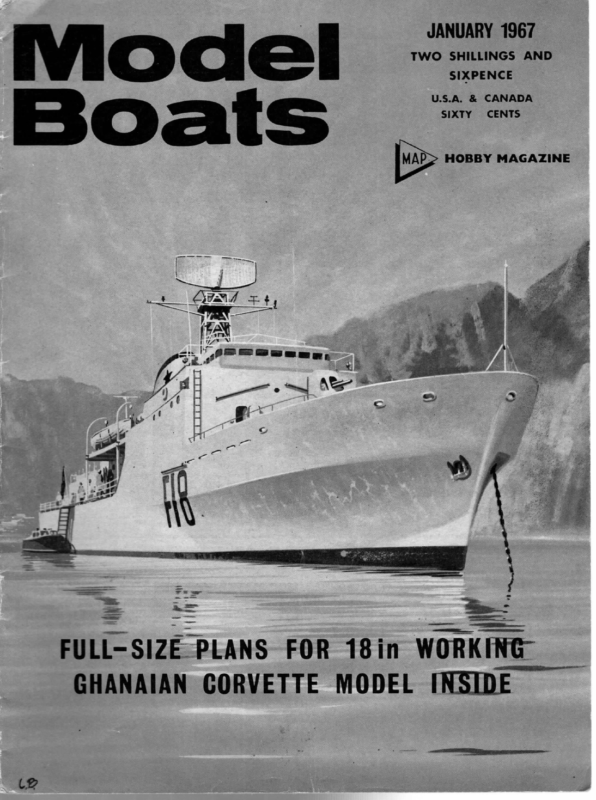 JANUARY 1967 TWO SHILLINGS AND SIXPENCE U.S.A. & CANADA SIXTY CENTS | as Ce a 7 i HOBBY MAGAZINE cence TET FULL-SIZE PLANS FOR 18in WORKING eae nae S SP recess COI ||a a aaa ~~ MODEL BOATS BOATING FOR BEGINNERS OF THE CONSTRUCTIONAL — PART TWO NOTES ON = tin BUILDING OUR CHRISTMAS FREE PLAN STARLET ‘Two jobs go hand in hand with stages discussed last month, the rudder and the deck. We left the skeg drying out with a cut brass tube fitted to its after edge and running through to project slightly above deck level. This is referred to as the rudder tube or, more correctly, as the rudder trunk. The rudder stock is the bit that fits inside the trunk, to which the rudder is actually attached. In Starlet this is another length of tube (though it could be brass rod with a small hole drilled in its lower end) which is an easy fit in the trunk—with 7% in. o.d. for the trunk, + o.d. could well be the size for the stock. It doesn’t matter if it is a slack fit; better that than tight. This stock has to fit in a groove on the fore edge of the rudder blade, in such a way that a movement of about 20 deg. either side of the centre is obtainable and the rudder moves easily. At one time screws used to be driven through the tube into the rudder and the heads filed to the diameter, but nowadays epoxy resin provides an entirely sound joint, if the brass tube is roughened slightly with glasspaper before sticking. For the loss of a little streamlining a brass sheet rudder could be silver soldered to the stock if preferred. The stock eventually will be pushed into the trunk (from beneath, of course) and held in place by a pintle plate. This is a is in. wide strip of brass screwed to the bottom of the skeg, projecting beneath the rudder and carrying a pintle pin which engages in the lower end of the stock. This is the reason for a hole being required if a solid stock is used, An alternative is to drill a hole in the plate extension, through which the tip of a solid stock could pass, but this is a less efficient method. The pin can be a rivet or cut-off brass nail soldered through the plate. y N E LL | MU Y // 34” YACHT FOR FREE-RUNNING OR R/C The deck is a single piece of ys in. ply and the best way to mark it out is to drill a hole in the sheet to slip over the short piece of the rudder trunk which projects above the backbone. Locate the sheet, bend it to touch the inwale all round—it can be done single-handed quite easily, but an assistant makes an error less likely—and draw round the hull with a pencil, Cut out outside this line—a good ¢ in. spare should be allowed—and try for fit. Mark a centre line on the top face, and from this mark out the cut out hatch area, Cut the hatch, using a trimming knife and straight edge, using several light cuts rather than one heavy one which could score the ply if it slipped. A saw can of course be used if preferred. Varnish the underside of the deck two coats, keeping clear of the edges which will be glued; a chance is usually taken on areas which will be glued to bulkhead tops or deck beams, as it would be difficult to varnish adequately while leaving strips unvarnished here and there. Provided the deck edge is firmly secured no harm will come, especially as some of the fittings screw through the deck into the frame and will thus hold it. Our preference is to glue the deck firmly on, but some builders bed the deck on wet varnish and use fine screws or pins to hold it down. This certainly simplifies removal of the deck if at some time in the future it is decided to strip a boat down for a complete refit; we feel, however, that with such an extensive refit a new deck might be best anyway. If using glue, then, glue and pin the deck in the same way as the bottom and side skins, removing the pins when the glue is dry. If varnishing, use brass pins tapped home. Leave to dry, then trim the edge flush, using a sharp knife and glasspaper. We decided to get a couple of undercoats on the hull, so that they could be drying while we cut out the cabin pieces. The next job therefore was to cut and fit the fin keel, which is simply glued in using At the top the stock needs a short threaded stub, which can be run on a solid stock with a die, or, for the tubular stock recommended, a short length of appropriate brass bolt soldered in. For a radio model, the rudder should swing with reasonable freedom, though the servo power will normally be enough to overcome minor friction. For a free-sailing model, however, the rudder must be absolutely free; unfortunately oil cannot be used to lubricate it as it simply goes sticky in water. epoxy resin or Cataloy. The latter makes it easier to run a very tiny fillet round the junction of the fin and bottom skins, using a toothpick or scrap of balsa to smooth the adhesive and form a “corner”. Surplus can be sanded away when dry, if not too great an amount. Incidentally, we use bun baking 12 JANUARY 1967 cases for mixing Cataloy, since only small amounts are mixed at a time and the used paper case can be discarded. A careful check must be made to see that no misalignment has crept in during construction; the method is pretty fool-proof but it is as well to check that the fin is truly vertical and in line with the bull centre line. When dry, sand over the entire hull in readiness for painting. If you want a veneered transom, now is the time to do it, as the veneer will need two coats of varnish to prevent any paint that may creep on to it from marking it permanently. The cabin structure shown on the drawing is optional and some builders may prefer to save a couple of ounces by omitting it. On the other hand, it does add to the appearance of the model and it reduces the amount of water likely to get inside the boat by seepage through the hatch and mast mounting. We would recommend it for radio; for free-sailing it depends on whether you like the idea of a semiscale layout or would prefer functional simplicity. To make it, draw-out on the 