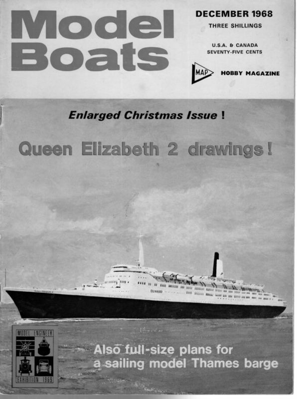 DECEMBER 1968 THREE SHILLINGS U.S.A. & CANADA SEVENTY-FIVE CENTS HOBBY MAGAZINE * j way Wifie i MODEL BOATS Longbow and Bambi By S. Witty Two interesting new Marblehead designs HE two new ‘M’ designs shown with the following article have certain features in common, but are basically different in concept. In both, the draught is limited, for though the deep keels are more efficient in any kind of a breeze, they are too restricted in the choice of sailing water. In the Longbow design as drawn, the draught is 13.4 ins. but alternative versions are building at 12.4 and 15.4 ins. respectively. One difference to previous designs is that the after edges of the fins are swept forward, thus gaining a little extra stability due to the higher C. LR. position, and an improvement in the balance with the more centralised root. To give a better safety margin when being driven really hard the stem is fairly high in both cases. Prevention is better than cure after all, and such small extra windage as there is, being forward, improves the aerodynamic balance. With the combination of tall rig and short ends, a tendency for the bows to drive in is always a factor in this class. Actually the bulb keel is no help in this respect, for when accelerating, the thrust of the sail tends to move the yacht around the c.g. This being lower in a bulb-keeler, it follows that the bow sections will be more heavily loaded. Even taking this into account, the advantages far outweigh the disadvantages. A point in common in these designs is the incorporation of the bumper into the shape of the hull. This idea was used in Floreana, the winner of the championship in 1952, but was not taken up for many years. Possibly it was considered that the extra one-hundredth of the length was not worthwhile bothering about. Aesthetically, too, a raked stem is more pleasing and helps to deflect the waves downward. Even a slight rake shortens the sailing length half an inch though, and the rounding off to avoid injury to the hand loses more. The bumper, being usually of softer material, needs no rounding off, so the actual gain may be appreciable when all factors are taken into account. Care should be taken not to exceed the maximum length of boat and bumper however. The first design shown is unusual in that the lines and sections below the water-line were developed from those of a new ‘A’ boat. As far as I know, this is the first time this has been done, though I have heard of a development the other way round, from ‘M’ to ‘A’. Being designed for Australian waters, this concept had to be good in the lightish conditions which often prevail in N.S.W. Originally she was envisaged as a ‘heavy’, to obtain a powerful, easily driven hull which would be able to carry a main with a 90 or 100 inch luff, since performance in light conditions depends largely on the sail to wetted area ratio. Three sets of lines and sections were drawn to different scales, but my own preference was for the lighter 20 Ib. version. Alternative bulb sizes are shown, since the weight of an ‘M’ less keel can vary between five and eight pounds, the choice depending largely on the method of construction. Longbow Bambi Length Length L.W.L. Beam Length 50.25 in. + 0.5 in. (Bumper) Length L.W.L. Beam 49.5 in. 9.75 in. Displacement 20 Ibs. Draught 13.35 in. Draught Displacement 50.25 in. + 0.5 in. 50 in. 10.32 in. 12.3 in. 17 Ibs. These drawings are available from M.M. Plans Service, price 7s. 6d. each plus 6d. post, ref. M.M.1018 (Longbow) and M.M. 1019 (Bambi). Each has half-size sheer and waterlines with full-size body plan, fin, and skeg. ra LONGBOW (7) 504 DECEMBER f 1968 ca Te) | The ‘A’ class lineage can be seen in the form of the midsection, being well rounded, with low wetted area, yet fairly flat floored and not too deep. Together with the low p.c. this permits a really flat run aft and lifting sections forward, while waves of any real height are parted by the sharp stem. In both designs, the tumblehome is such that the heeled lee waterline is bisected at right angles where possible for minimum wetted area. The lines of the second design to some extent follow the trend of the latest planing dinghies, particularly the 12 ft. Nationals. With such craft, any tendency to dive is easily countered by seating the crew further aft. In the *M’, all corrective measures previously described are used, and as the c. of b. is well aft in this type, the fin and bulb van also be placed nearer the stern. Positioning the maximum depth of the canoe-body forward of the midsection as in the full-size craft seems to help to keep the bow flying, in spite of the fact that this also tends to sharpen the forward sections and waterlines. When driven hard the hull takes up the fore and aft trim it would naturally assume if placed on a flat surface. Whether this is a fair analogy or not, the converse also seems to hold good in that a hull with roughly semicircular rocker sits less when pushed, the reason being apparently that the main body depth moves aft in relation to the c.b. when the stern sits. This is at variance with what has been written on the subject, which indicates the opposite. In this design the width of the transom may seem more than is usual in an ‘M’. However, I came to the conclusion long ago that it is the straightness or otherwise of the ‘Welch Axis’ at any particular angle of heel which determines whether the canoe body stays in balance. Within reasonable limits it seems to make little difference if this is inclined at an angle to the centre-line from the hydrodynamic point of view. In fact the most likely disadvantage of a wide transom is probably aerodynamic, tending to point the yacht into the wind when heeled, but as the hydro action is just the opposite, these forces largely cancel out. As the latter varies in proportion to the angle of heel, this action is ideal in many respects. It should be made clear that in both fin and bulb-keel de