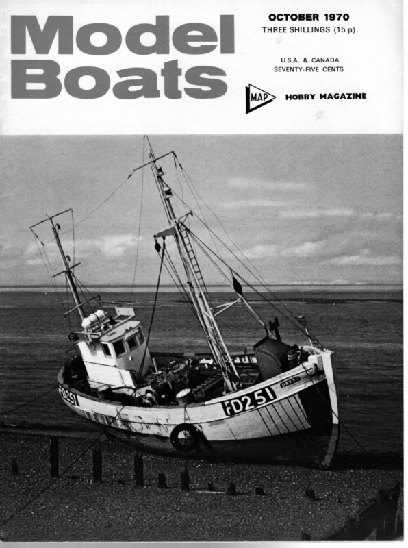OCTOBER 1970 THREE SHILLINGS (15 p) U.S.A. & CANADA SEVENTY-FIVE CENTS [o> HOBBY MAGAZINE OCTOBER Part Five —the ‘A3 FIG. 23 HARD CHINE HULL Bow Block method’ of building 1970 DETAILS OF FIN AND SKEG CB Hull, Transome Piece wk a hard chine hull |/4″ Mahogany Laminated 1/4″ Tufnol or 3/8″ Ply BODY PLAN By C. Griffin RACING MODEL YACHT CONSTRUCTION A HULL made by this method depends, as do all permitted under the Marblehead rules. The inwales and chines are best constructed by laminations of 4 in. thick by # in. wide spruce using Aerolite 306 glue. The fin is cut from ? in. thick marine plywood and extends through to the king plank, see fig. 23. The skeg and extension is laminated from two pieces of ¢ in. thick mahogany glued together with the grain of the wood reversed to prevent warping. If each layer of the mahogany is chamfered at the rudder tube edge before jointing this enables the rudder tube to be fitted into the recess so formed using epoxy and ? in. x No. 2 countersunk headed brass screws. See fig. 24 for details of a full rudder tube. hulls, on the accuracy of the initial building board, the marking out and the subsequent mounting of the shadows. The hard chine hull appeals to the novice builder because, compared to the round bilge type hull, it is easier to build. Secondly, the materials required for the construction of this type of hull are more readily obtainable, i.e. marine plywood, usually -4 in. thick. As with all methods of hull construction, the first task is to trace the shadows from the body plan, making the allowance for the plywood skins or planks. Fig 22 gives the details of a shadow; note that notches are cut to receive the inwales, chine stringers, keel plank and king plank. To build the king plank in with the hull still on the shadows makes removal of the shadows difficult when the hull is removed from the building board. Therefore, to remedy this situation the shadows should be made in two parts as indicated. This task is simplified if the shadow is made first as a whole, the necessary cross pieces screwed into place and then the shadow split by Fig 24A gives details of a short rudder tube where only epoxy is necessary to fix into position. The king plank is cut from 1 in. by 5/16 in. thick spruce extending from the bow block to the transom with slots to receive the upper ends of the fin and skeg. The planks or skins which form the hull are cut from either Imm. or 1/16 in. marine plywood; the former has a tendency to buckle if used for large unsupported flat surfaces but may be strengthened by the judicious use of balsa sheet. Where the final weight of the hull is critical, the use of 1mm. marine plywood and balsa sheet strengthening has obvious advantages. If care is taken in trueing sawing. See fig. 22A. Mount all the shadows on the building board as described in earlier articles, checking for accuracy and symmetry to produce a true facsimile of the original design. Note that here the process of checking is easier the chines and the skins are cut accurately, good close than that of a round bilge hull. The transom is made from 4 in. thick obeche and the bow block formed by three laminations of the same material with an integral bumper formed from 4 in. thick cork to give a thickness of 4 in., which is the maximum A SHADOW FIG, 22A. Saw Cut ———— Notch for chine Notch for (REVERSE SIDE) — Cross Pieces 3 Notch for king plank stringer inwale Mounting Block vi DETAILS OF SPLIT SHADOW | — Notch for keel plank ape Building Board —-[- 417 | Ye_\ a) – LH DETAILS OF L FIG, 22, glue joints will result and the hull will be of adequate strength for competition racing. There should be no need to screw or nail the skins although map pins may be necessary to hold the skins in position whilst the glue is drying. It is usual to cut the two bottom skins first and MODEL BOATS FIG. 24 LONG RUDDER FIG. 244 SHORT RUDDER TUBE TUBE-RAKED RUDDER FIG. 25 FIXING BOTTOM SKINS UPRIGHT RUDDER FIG, 25 A. OVERLAP OF SKINS SHOWING OVERLAP SINGLE 3/8″ O.Dia. Brass tube DOUBLE CHINE CHINE Overlep to receive Araldited in position side skin | 3/8″ O.Dia. Brass tube Cross sections of Skegs – Note reversed grain SEK 3/4″ No.2 Screws eee these are checked against each other for symmetry, then temporarily placed in position, allowing for a slight overlap on the chines. If the fit is accurate the skins can be glued into position. The next pair of skins which form the sides of the hull in a single chine hull are cut and checked for symmetry. They are glued to the chine inside of the overlap of the bottom skin and onto the inwale, allowing for an overlap at the inwale, if an inlaid deck is desired. When the glue is dry trim off the surplus overlap of the bottom skin. See fig. 25. If a double chine hull is being constructed leave an overlap to accept the third skin. Fig. 25A. Remove the hull from the building board, fit some temporary deck beams and then remove all the shadows. Brace the hull in the vicinity of the mast and chainplates to prevent the strain of the shrouds and the mast from distorting the hull shape. Fit the king plank and the deck beams at predetermined positions, giving the deck beams a camber of approx. 3 in. for a Marblehead, slightly less for a 36R;; this adds to the rigidity of the deck. Note that the deck camber can be assisted by raising the central king plank relative to the sheer line. This method can only be used if a built-in carrying handle or recessed hand grip or deck-mounted handle is fitted. For the same reasons a deck-mounted mast heel must be fitted. Should an opening or sliding hatch or a keel-mounted mast heel and mast slide be desired the king plank must be constructed as shown in fig. 26. The opening hatch is constructed from plywood and 4 in. thick obeche with a cork seal and must have some positive securing device (fig. 27). Sliding hatches can be constructed as shown in fig. 27A. If an opening or sliding hatch is fitted there m