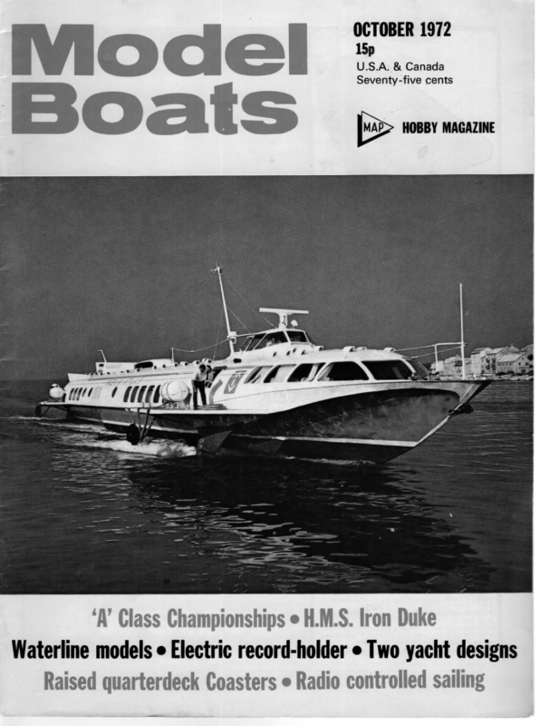 OCTOBER 1972 15p U.S.A. & Canada Seventy-five cents HOBBY MAGAZINE meet“ilie ‘N’ Class Championships ¢ H.M.S. Iron Duke Waterline models ¢ Electric record-holder e Two yacht designs Raised quarterdeck Coasters —_ Radio controlled sailing OCTOBER 1972 R/C Sheeting Systems to the shaft. The drum is simply three discs of ply with 3/16 in. spacer discs (sawn from a dowel or INPHE radio currently fitted to the original Star-C is – shown in the photographs above. It uses the completely reliable Flight Link two-function set, the cotton reel) clamped on the bush with a nut. Two wire loops epoxied rudder servo of which is conventionally used, mounted at the rear of the Formica panel which forms the hatch top. Cork from a bathroom tile forms the plug of the hatch. The throttle servo is mounted, with the receiver and Deac, in a clear sandwich-type box, inside the hull, and astride the servo is screwed feed-on guides. Weight is around 25 oz., with the extra battery, one, of hard plastic, bolted to the arm with two IOBA bolts, to depress either microswitch. This is clearly visible at the left of the left-hand picture. Wiring from the microswitches is such that only a single 3 or 44 v. battery is necessary to drive the winch motor in either direction. The winch is a Super Milliperm motor driving a Mini-Richard gearbox (this can be bought as a single one-piece unit, but we had the bits separately) and a screwed bush is epoxied The sketch below is of a system used by (then) Bdr. Geddes, sailing by R/C a year or two ago in Germany. The method has been used by other modellers, but this is the only one we have seen where the chain is not an endless loop. The ends provide a physical limit stop, providing, presumably, they do not disengage from the sprocket. Note that both sheets are doubled and travel the same distance, so that the boom attachment points must be equidistant from the pivots, which is now the rule rather than the exception. OE f (¢ EE My a = ‘reo RING SS i= Se a BOLT BRASS T Vey | \ a, ts! the Formica provide but this is an acceptable figure. It was necessary to tension the sheets with shirring elastic to prevent tangles, and limit switches will be fitted on the next the microswitch assembly made to fit a Graupner ServoAutomatic, which can be fiddled to fit over most servos. The servo arm carries a cam filed from a scrap & through ast Ts CHAIN Xe BRASS PLATE INSIDE t PULLEY BLOC | [@ MECCANO CHAIN TTT : 10 TEETH RING BOLT A BE X I? | [motor | FORE SHEET <0 v2 SW oBeK weccano orive IL arr) oo TaD TT OO PULLEY BLOCK (0) NYLON CORD 2 ee MAST ee : ee ge Sr SSS eS 1 — Se ee OSS SSS = NYLON CORD OL 425 PORE SHEET SOS 5 Se MAIN SHEET DECK CENTRE LINE ‘ AND OUTSIDE FOR STRENGTH BOTH ENDS Z =RING BOLT MODEL BOATS CINQUE and NERANG Two interesting Marbleheads designed by R. Dunster WHEN the Quartet series was being designed a round bilge version was schemed out and after some rather uncomplimentary comments from fellow club members in Greenock were passed, it was put away but not exactly forgotten while the process of proving the Quartet was carried on, as well as various other things, like shifting to Australia. More of this later. Now, after several years’ experience of the Quartet, both in U.K. and here in Australia, it was felt that there was room for improvement in two ways — planing attitude and performance in light weather. As regards planing attitude, the originals planed rather nose up and with a tendency to ‘stall’ as the pressure eased. They planed readily, however, but not as readily as some other designs; there are certain de- signs which seem to plane at the drop of a hat, so to speak, and although I am certain that this is mainly due to the skill or feeling of the skipper for this particular boat, or even a correct matching of spinnaker to the boat and conditions, I am also of the opinion that certain characteristics inherent in the design contribute considerably to this behaviour. Observations made over a period of time lead me to the conclusion that this is brought about by — a lightweight, shallow draft canoe body, with a flat fos NERANG The Model Maker Plans Service 426 mid section fore and aft and a well-placed centre of buoyancy in conjunction with the CG of the lead ballast. The forces acting on the sails are opposed by the drag of the hull and ballast, and if these items are placed in harmony with one another it seems to me that the whole outfit will plane easily and readily and consistently. I see these properties in a boat designed and built locally which, when it planes, and it does readily and rapidly, seems to have all these items in balance. On other points of sailing it performs well but not as outstandingly as downwind. So what do we need for easy planing? Flat sections or vee? Both will do the job, but which goes better to windward? As usual we have to compromise and choose the section or form which will fit to a certain extent all conditions (but no one perfectly) in order to get a good all-round boat. For this I am sure is what we need — a boat which will perform well in most conditions with average or even below average skippers. I know of many boats that perform well in spite of their skippers! All these things were taken into account when revising the Quartet series, and in Cinque (pronounced ‘Chinkway’, i.e. Italian for five) or Fivon the basic shape was altered by flattening the mid section at stations 5, 6 and 7, and in fact making the profile straight between these sections and then fairing in the run-up to the transom. A further alteration was to ‘lose’ the upper chine around No. 10 section so as to have a single knuckle transom. This was useful to improve the balance as when the run was added to the revised mid sections it became necessary to fine the extreme end of the hull as much as possible to retain balance. When the boat was built it did FULL-SIZE COPIES HERTS. OF BOTH DRAWINGS ARE AVAILABLE REFERENCE NUMBERS ARE MM