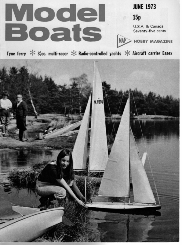 JUNE 1973 15p U.S.A. & Canada Seventy-five cents HOBBY MAGAZINE ae UGNTWENGHT: 36 “RESTRETED CLASS YACHT GOSLING designed Vic Smeed ‘ : x ‘ Mies . . ny . PL i (AS 8 FROM (75 f m – Y ey = — ———- Hemel me ne 7 a ch ‘ 98 NO MAW Booms FroM 3 ALUMROUM TUBE The Model Maker Plans Service 13°35 Bridge Street. roan fiw Ts re EYE a7 SAME OST FROM PCT i Sie, ree . 4 Gap soe ace wired ear by Hempstead, Herts. TOP LIGHT WEATHER) SUTT 6020° SLACK FIT Ma (USE LOCTITE/ePOXY To SECURE) w FLATTEN Boom cd <= HOLE FOR 8 TACK 3 12 x 0 BRASS sche 10K ss bay sal “ill | iCieue Fon Kexine “7 68a Boi" THRONE / (JD PACE FRAGA BRASS CORDN RAL AT ee, wate RXR Pa DEEP 1 BOOM HEEL MAST HEEL WITH DOWEL. SAW SLOT YO FIT OVER WAST RACK ‘SIDE AND BOTTOM HULL PANELS (SKINS) AND TECK aut V32 PLY R | \ = ' wie oe wr va a00 Moa aaLsn STRINGER SAND, ADO 1732 PLY SIDE SKIN 2 TURN PLAN OVER, USE SAME PIN HOLES, A TT Full-size copies of the plan above are available, reference MM 1164, price 65p including postage and V.A.T., from Model Maker Plans Service, P.O. Box 35, Bridge Street, Hemel Hempstead, Herts HP1 1EE. [uw ties) JUNE 1973 E left our boat last month with the hull built. fin and skeg fitted, rudder tube installed, and deck cut, with a couple of coats of clear polyurethane on the hull interior and underside of the deck; while these coats are drying attention can be turned to the lead. Some people find lead casting easier than others, and for these a circular section torpedo lead is shown. This entails turning a wood pattern on a lathe, splitting it, and making a mould from plaster or sand. No problems arise for those prepared to go about it,in this way, but for a raw beginner it may well seem a bit formidable. The prototype model uses the simpler lead shown on the drawing, and this really is an easy way of getting a lead bulb. Doubts about efficiency can be dispelled, as the prototype sails very ably with this set-up. First visit a timber yard or D.I.Y. shop which supplies timber products cut to size, and buy a piece of + in. thick blockboard somewhere around 12 x 8 in. — the sort of left-over piece that’s too small for most purposes. Trace on to this the bulb profile, twice, leaving an inch or so minimum between them. Cut out these two shapes; a band-saw is useful, but it doesn’t take long with a coping saw or even a fretsaw. Try to keep the cut vertical, which saves work later on. Cléan up the cut-outs to smoothness. then nail a piece of ply to form a bottom and if necessary a strip along the edge from which the sawcuts were started if a bandsaw was used. Ensure that the wood April issue) and the top surface. or even charred i.e. there will be you may like to is all dry, then melt the lead (see pour to fill both moulds flush with The wood will be slightly scorched when the cold leads are removed, a smell when the lead is poured, so Top, the hull and deck ready for permanent assembly; note blocks on underside of deck, Above, the deck in place on the hull being held with Sellotape and pins while setting. GOSLING Part Two of our lightweight do it outdoors. An alternative is to bend two j in. wide strips of metal to the bulb shape and nail round the outside, as in the photograph, which is even less work and should produce very neat castings. The top surface of the lead in either type of mould may not be quite flat, due to shrinkage on initial cooling, or even because impurities in the lead tend to bubble to the top. This is taken care of later; initially each casting should weigh a shade over 3lb. Clean up the keel faces if. necessary, with a file or glasspaper block; you can in fact plane lead without difficulty, using a spot of turpentine as a lubricant. Mark and drill two holes (say } in., to clear 14 in. x 10 brass screws) in one lead and one between these two in the other. Clamp the leads to the fin and spot through the fin to mark the opposite lead; drill smaller holes (say + in.) +:in. deep to take the screwed ends of the screws. Countersink the screwholes on the outer faces, then lightly screw the leads in place and check that the hull balances close to the arrow shown on the plan, approximately 20 in. from the bow. The leads can be moved fore and aft by enlarging the fin holes. When satisfied, epoxy fin faces, clamp the leads in place, and screw the three securing screws home. Fill the spaces between the leads fore and aft of the fin with scrap 4} in. wood glued in with epoxy, trim to shape when dry and force epoxy into any remaining chink. Clean up the outside faces of the leads, cut two + in. balsa shapes to the lead outline or a shade inside it, and epoxy these to the leads, cramping into contact if the lead faces are slightly concave. When dry, file and sand these panels to a smooth streamlined shape, which will also slightly round 233 36 in. Restricted class model for vane or radio sailing BY VIC SMEED Two types of lead mould are illustrated below. The upper picture shows the shapes cut from blockboard and set up ready for pouring the lead, while the lower picture shows one of the two moulds required, this time made with a strip of aluminium with nails to retain its shape. MODEL BOATS The leads screwed into position on the bottom of the fin; the fore and aft gaps are filled with scrap i in. timber. and smooth off the corners of the lead. Now to return to the deck, check that all necessary blocks to receive fittings are in place, either glued to the underside of the deck or in place in the hull in positions where the deck will glue to them. Most fittings are arranged on the centre line, and the shroud plates screw through the hull sides, where the strain will be taken at roughly right angles to the screws. However, the backstay must be split to clear the vane feather (unnecessary if radio is to be fitted) and needs an eye each side of the hull, and it is convenient to have an eye each side for the spinnaker sheet. The only other requirements are the two blocks beneath the deck 