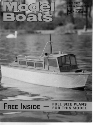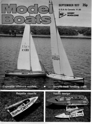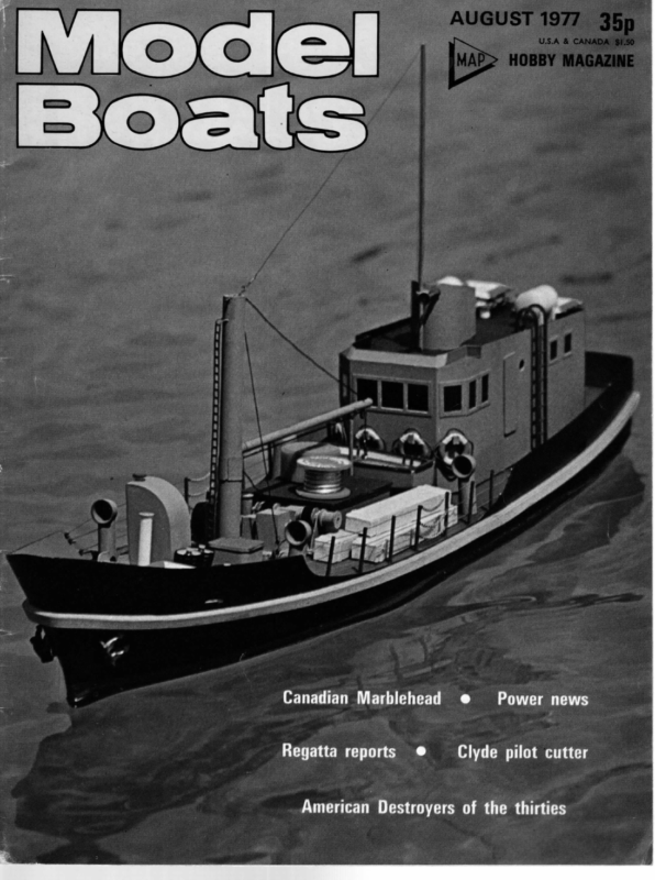 Canadian Marblehead @ Regatta reports Clyde pilot cutter ©@ Power news American Destroyers of the thirties BILL VAN DIEREN describes construction of KOKANEE a “‘light’’ air Marblehead for radio-control Part One Hull and deck stern tend to lift, in heeling, but at that heel the speed is such that the hull lowers in its own trough. bie» article was originally published in the club newsletter of the Vancouver Model Yacht Club, to assist new members in fitting-out of a grp Marblehead yacht. The Kokanee was designed as a light air radio- controlled Marblehead. There may be a lot of questions regarding some of the features, however, it has been proven to be difficult to beat in wind conditions in the range of 1-8 mph. Two Kokanees are finished at the moment and were entered in a regatta in Seattle on 2nd April, 1977. The 13-5lb. model was 2nd, and the 151b. model came 3rd in wind conditions varying from 10-15 mph. There is no doubt in my mind that the more conventional boats, eg, Sailplane, Moonraker, Blood-Axe, Madhatter, etc. are superior from 8 mph wind strength and up. However, our wind conditions are usually light on the west coast. Some data on the boat; it is double ended, where the forward half is identical to the aft half. The circular arc principle was applied without any compromise. The centre of the hull is a true half circle and the rocker is part of a circle. The following was aimed for and achieved: (a) the fore and aft buoyancy does not change if the boat heels, which prevents digging in. The bow and FIG.1. | | BASELINE = WATERLINE at _ oN) BASE | BOARD | ] Plug constructed from 68 pieces of Zin timber, shaped as per dimensions in table I and figure I. (b) Trim changes only very little in varying winds from 1-8 mph, because of even buoyancy distribution. (c) The centre of lateral resistance with fin at ‘B’ position and not including the rudder is on the hull centrelines, as well as centre of gravity of hull and centre of gravity of ballast, which provides for easy trimming of the boat. (d) The wetted area is considerably reduced from more common designs. Hull construction The plug was made in an unusual manner, We used 3in thick planed planks and cut out 68 pieces to fit the crosssections of the hull, as the shape of each piece could be calculated and then drawn onto the plank, Table 1. The pieces were glued together and only a little sanding was required to obtain the proper shape. The plug must be finished as smooth as possible, as any blemishes will be faithfully reproduced in the mould. There is only one sure way; many coats of paint rubbed down with wet-and-dry paper, followed by polishing to an acceptable gloss. The subsequent method of producing a mould and hull is described in detail in ‘A Clot’s Guide to GRP Hulls’, Model Boats, December 1976, page 714. The hull should be trimmed with a razor blade saw as closely as possible to the deck line. This line can be inscribed on the plug before laying-up the mould, hence providing an accurate trim-line for every hull produced. After saw-trimming, sand the excess away. August 1977 429 Place waxed paper in the mould and fit the trimmed hull inside. Make sure the mould is fully protected by waxed paper before proceeding any further. Lb» 50-1875″ (3n6″) — a ae 3-75″ + @mast—= Deck framing One thing should be mentioned at this point: all wood-towood glueing is done with ordinary white glue; all woodto fibreglass joints are made with a mixture of milled fibreglass fibre and resin. This should be mixed to a thick paste — Fi oS a 08 ——— >) —— | iat 9.25″ 4 2″ ee sj 5% ol | aan aa tS ate – ee 4″ ———— -— 2 ss ima| = = E Z consistency. The estimated quantity required of this mixture should be thoroughly mixed withcatalyst hardener before use. Apply this mixture generously and wipe excess off after glueing. The deck framing should now be installed according to figure 2. Make and install items according to the numerical order shown. The hull should be removed from the mould after items 1 to 9 are installed and should be placed in the ne | DESCRIPTION MATERIAL N* | DESCRIPTION MATERIAL boatstand forease of work, figure 3. Take a straight piece of 1 |BOWPIECE 1/4″ PLY WOOD 8 | HATCH BEAM ¥8″*1/8″ SPRUCE wood 1lin. long and tape ‘240’ sandpaper on this. Sand 2 | STERNPIECE 1° —:—— ¥) Sse as iat, ttle the top flat, so that no wood projects above the edges of the 3 |OUTER GUNWALE 3/8″*V/8″SPRUCE ‘10 | INNER GUNWALE rere [11 | KING PLANK ¥6’x3/16″SPRUCE fibreglass. The deck can be marked out with a sanding or 4 |MAST SUPPORT BEAM | 34″x3/16″SPRUCE 5 | STIFFENERS W6″*4″PLYWOOD | 12 | HATCH BEAMS 3/8″1/8″— – — cutting allowance of tin. The following are quite suitable 6 |HATCH BEAM V2″*1/8″SPRUCE [13 | —-— —- — —— ——-.— 9 ren oesa —-— —-— 114] CHAIN PLATE SUPPORTS| 1/4″PLYWOOD wooden decks: 15 | GUSSETS 1/2″ 1/8″ SPRUCE (a) 1 millimeter plywood; DECK FRAMING ARRANGEMENT (b) +;in plywood, which can be painted or used as a FIG.2. base for planking. The wooden deck can be glued on after the winch Mast step and chain-plates The arrangement drawing shows in detail the parts. As you supports, servo supports and fin are installed. can see, all parts are bolted through the deck. The chainSmall openings may be cut out for the hatches. However, plates should be mounted parallel with the centre-line of be sure that enough trim allowance is left. The next items to be installed are the fin and winch the boat, as this allows the mast and rigging to be moved without having to re-adjust the rigging. For example, a supports, as well as radio-component supports. However, the mast step and chain-plates can be made, and these boat has weather helm, which must be corrected by moving the mast forward. The best is to try this by tin or one-hole details are described next. 1 3 ty 6) @ 5») @®WM © OO FULL SIZE COPIES OF THE DR
