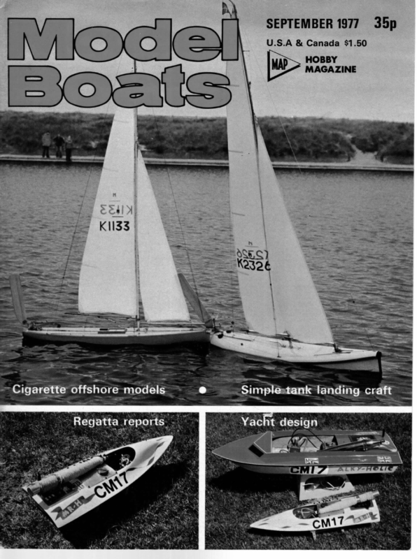 SEPTEMBER 1977 35p U.S.A & Canada $1.50 HOBBY MAGAZINE meee offshore” t design iienknipsitiie” x sttiiisedtben MODEL BOATS 490 Part Two KOKANEE a “‘light’’ air Marblehead by Bill Van Dieren the boat for front support of winch platform. The back end of the winch platform is supported by a bolt arrangement. The bolt threads into a wooden block which is installed in the bottom of boat, and two nuts support the winch platform and a nut on top locks the platform in place. The bolt must be removed to take out the winch platform, (30 second job). Fabricate a tray for the receiver and a battery holder for the winch, and epoxy in place to suit. Check out your installation, make sure everything works properly and that all components required are installed before the deck is fitted. If everything is installed and works properly, you can take the equipment out and put on the deck. Use white glue or epoxy for fitting the wooden deck. Trim deck excess at the outside of the hull and around the two hatch openings. Note: Make sure you can install and dismantle all components through the hatch openings. Winch Winches of different kinds can be homemade, if one has some equipment, or can be purchased. 7 -_ 4 Ki ura Winches have two basic modes of operation: A Standard Winch is activated by a servo which throws a switch and starts the winch motor in a forward or reverse (8) us oz =i l»——— GENEROUS FILLET EI: direction, depending on the movement of the stick on the transmitter. The unit stops as soon as the stick on the transmitter is returned to neutral position. The sail is adjusted by visual means as required. i A Proportional Winch is activated by means of a modified servo and limit switches, which are arranged in a manner that the position of the stick on the transmitter 7 {| : OF RESIN &CHOPPED STRAND, ALL ROUND. GUNWALES (3)((0) eo matey BEAM (4) KING PLANK provides a certain sail setting, say for broad reaching. The position of the stick, (non-spring loaded type) varies between closed hauled and running positions. Visual corrections are still required, however; rounding a mark to a broad reach will allow the skipper to approximate the set of his sails. The type of winch used is a matter of personal preference. All of them work well if installed and operated properly. So, if you are on the market for a winch, talk to the skippers who own the different varieties available, after which time you may be able to select the one best suited for you and your boat. A relatively cheap proportional winch for home construction is described in the Model Boats Extra, now on sale. It is advisable to install the winch ona tin thick plywood board. The width and length will vary depending on the type of winch used and amount of radio equipment mounted on it. A slotted piece of tin plywood is installed in ! +——FIN(19) Wi Ne | DESCRIPTION 16 | FIN SUPPORT 17 | FIN CLAMPING BLOCKS 18 | 3/16″ ® BOLTS 19 | FIN FIG.5. MATERIAL 3/8″ THICK HARDWOOD 5/8″ THICK FIR BRASS ALLUMINIUM ALLOY 1/8″ THICK ARRANGEMENT FOR FIN ATTACHMENT. 491 Ballast September 1977 RESIN & CHOPPED STRAND The hull and deck of the boat are finished and your work so far sits nicely in the boat stand. The ballast should now be installed. Prepare wooden plug to the shape of the bulb and push into casting sand, and pour molten lead into the depression. The result is one ballast half, slightly concave on the mating side and a little rough on the outside. A full account of casting techniques appears in ‘‘Model Racing Yacht Construction”, by R. Griffin. Drill a in dia. hole in one half and then through the mating half. Countersink the holes on the outside to suit the bolt head and nut. Install a slotted hole in wide near the bottom of the fin. The length of the slotted hole should be as long as possible, as the weight will be used to bring the boat to proper trim along or parallel to the waterline. The gap between the two halves can be filled with plywood after the boat is trimmed, ora slot can be filed to suit the fin. Shape the ballast or clean up the surface and bolt to the fin. The boat will be very steady now and will start pressing into the foam of the stand. The mast step can now be installed. Be sure that the centrehole agrees with the mast position shown on the drawing, and the mast step must be placed on the centreline of the hull. Obtain this by stringing a line between the bow and stern and mark the deck at several locations and drawa line on the deck. Drill holes through deck and king plank with plywood below, and bolt mast step into place. Install the chain-plates by aligning as shown on the drawing and mark mounting holes on the deck and drill. Be sure there is enough room below for the nuts. The chain-plates may have to be moved away from the edge of the hull to suit. Fin installation The fin is going to be installed now, as shown in figure 5. The reason for this arrangement is to provide easy access to all bolted deck connections, and it also provides lots of room for the radio and winch installation. Cut a 4in wide slot in the bottom of the hull and make sure that the fin fits nicely. It is critical that the fin is parallel to the boat centreline. Make fin clamping blocks and assemble them to the fin with the bolts. Lower the fin into the slot and check that the fin hangs at 90° to the deck line. When all this is properly fitted, place a liberal amount of epoxy resin on the bottom of the blocks, press the assembly into the hole and check alignment. Install the fin supports after fin assembly is properly set. Provide heavy grp fillets all around and on the bottom of the hull as shown on the plan. Rudder assembly Drill a in diameter hole in hull as shown on the boat plan. This hole must be on the hull centreline. Make rudder post support and install rudder post, but leave an excess length of rudder post. Align rudder post properly with fin. Make rudder as follows; cut out one half as per boat drawings and put 