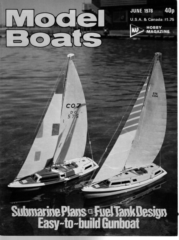 JUNE 1978 40p U.S.A. & Canada $1.75 HOBBY MAGAZINE Sulwsarine Plans «Fuel Tank Design : sy-to-build Gunboat 350 Model Boats ROUND 1786 REGATTA Early season events penalty for John, and meant that he didn‘t qualify for a sail-off against winner Dave Townshend. Very noticeable among the entries was the large number of Trappers, mostly from Danson. This beautiful boat performed very well in the gusty conditions, and some skippers even risked high-top suits with success. For once, Tony Abel’s Moonraker design was very much in the minority; even Tony was sailing a new ‘Challenger’ from Nylet. Norman Curtis was sailing a new boat; an unnamed design from Chris Dicks in ominous black called Frolic. John Curtis sailed the only Pickaxe, ‘Pickwick’, trouble. but had to retire from two races with servo Dave Townshend was a worthy winner, although I was naturally sorry that Woodley could do no better than Alan Oxlade’s seventh; congratulations to all winners and runners-up, many thanks to Jim Wilde and all the co-opted judges, and of course to all competitors for their good nature. Margaret Curtis presented the prizes, including a trophy of a handsome ship’s wheel with inset barometer, to be returned to the competition next year. One other thing—would someone else like to volunteer for scoring next year? You get, totally free, a pen that writes under water. 2nd April was Gerry Hurrell’s Vega design Tiptoe. Photo by C. C. William. Woodley. RM Open Meeting—19th March, 1978 From a purely personal viewpoint, this meeting was a triumph of physical endurance. Imagine, as I’m sure you can, a lake surrounded by tall trees, beneath a glowering March sky; and add a fitful, gusty wind blowing from approximately south—west. Sprinkle with increasingly frequent rain squalls, and you have an idea of the scene. For most of the time, I was keeping the score-board for the meeting. There was a tent, of course; but since it faced directly into the wind and rain on its open side, its value was more psychological than practical. Every piece of paper rapidly began to revert to the grey, soggy pulp from which it originally sprang; and you’ll have to take my word for it that the scores are as presented in the table below, since all written records haye been at least partially obliterated. The day began well: O.0.D. Jim Wilde forgot to put his clocks forward the night before, and arrived breakfastless and ill-clad for the weather, after being summoned by bells at the last minute. There is no Concours d’Elegance at this meeting; but my own experience indicates that a smart boat often belongs to a caring skipper; so I like to look around the boat park to see the standards of workmanship. This year, on the whole, the boats were looking good. Neat fittings, careful lining, attractive lettering, and undamaged paintwork showed that a lot of work had gone into many yachts; and more practically, the majority were rigged correctly. Later, my theory was proved again; one radio failure and one dismasting were the sum total of control failures. The radio failure was interesting; it occurred when a mystery transmission on orange frequency caused havoc with Woodley member Les Allan’s winch and rudder. Frequency monitors agreed that ‘someone was on orange ; but it wasn’t near the lake. Luckily it stopped later; and it was put down to ‘a nut with a model Results Pos. Owner 1. 2. 3. offered open house to all lady visitors whose fur coats and hairdos were in danger; for the men, a local hostelry served the same purpose. John Cleave reported great interest from the barmaids concerning his waders: ‘Show us how far up they go, duckie’, was one comment. Vic Cooney, belonging to a different generation, was not so lucky: he was merely asked if he’d caught anything yet. As last year’s winner, Vic was under some pressure. He sailed the same boat, Moonraker Lulu, but with less success. John Cleave, on the other hand, gained second place once more with Knut, although only after a long dispute over a collision with Chris Dicks had resulted in a Design Name Danson Trapper Lady M. P. Freeman Danson Trapper Boots 4. C.Dicks 5. A. Owens New Forest Ghibli Knut Clapham Danson — Trapper 10. T.Fuller 11. \.N. Oxlade JS M. Peppiatt 13. \D. Belding R. Belding New Forest Woodley Clapham New Forest New Forest Trapper Nookie Bear II Seahorse Ultrasonick Aeolus (mod.)Betagen Squiblet Condor 3 Seahorse Santoy 15. Woodley Pickaxe J J. Overton 7. R.Taylor 25. 26. R.Seager J. Fincham 27. 28. 29. 30. 31. T. Croxson Laps 80 78 64 D. Thompson ae Eastbourne — Silver Ship Trophy — 10R — 12th March A rather dull morning greeted competitors from London, the M.Y.S.A., Hove and Brighton, and the home club for the start of the Eastbourne Chamber of Commerce Trophy ‘“‘The Silver Ship’’. Sailing commenced with a close beat out, and a spinnaker run back, but the wind veered slowly to a reach. Lunch break was taken with just over half the event completed with several boats in contention, but the previous two years winner Des Daly in the lead. Sailing resumed after lunch with the wind still changeable and it was noticeable that 13 year old Michael Humber, though not quite winning, was causing quite a few flutters among the top skippers, only narrowly losing to one of the older boats in the race. After an exciting finish the trophy went to the London Model Yacht Club with Krakatoa winning the last 5 heats. Thanks were extended to Mr and Mrs Sylvester for excellent club house refreshments, to R. Godfrey O.0.D. and to the attractive young lady visitor from Hove who stepped in so ably to keep the score, the home club’s officers being depleted by illness. Results Pos. Design 1. 1838 Krakatoa 2. 1989 Restinga 3. 1851 Hiccup wh * 6. 7 JS 1846 Black Opal 1741 1991 1980 1774 Madelaine Bonfire McNim Benoulis Baby Owner J. Wheildon M. Goncalves D. Daly M. Connell P, Humber T. Gurr F. Slater M. Humber Club London Model Yacht Club Lo