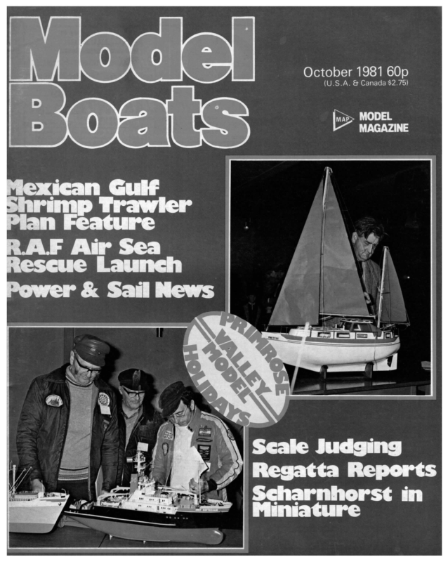 October 1981 60p (U.S.A. & Canada $2.75) a> MODEL MAGAZINE : rimp Trawler *jan Feature AF Air Sea rescue Launch Power & Sail News ii Seale Judging Scharnhorst i Miniature —— SEV AA PEALE LAL IE A I ABE LE EE SERN al EEG RE BNE BEER EE BE NS OEE IIE, SO PEPER ILL OIL BAIL BREE ADEA NONI NN TORE RAL LE EAI EEE ONE A BLL ae A light-hearted accou development of R/C \ staunch band of tra li Sailing trials at Sheffield. Cliff Bean, rubbing his hands an anticipation, behind his Starlet. Photos: Glynn Guest. went a long way to help this cause. VWVaserniva model power boat club start to HAT do you do when members of a well the interest in this area demanded support from the club and the first problem to be tackled was show an unhealthy interest in R/C yachts? Would a disapproving digit wagging at their jibs be sufficient to show them the error of their ways? Or that of a suitable sailing water. The regular club will it take something more drastic to impress was realised that R/C yachts and the powered sailing water is long and narrow and the trees on three sides shielded it from prevailing winds. It upon these clearly unbalanced mariners (Well model could not safely be mixed and that a larger really, anyone who puts his trust in the nebulous area for the exclusive use of these wind-driven This situation proved to be the boost (if any were needed) that the sport required and the number of yacht owners doubled in quite a short time. The majority used the Duplex 575 kit, if being a natural choice on the basis of size and cost, especially as no expensive sail winches are required. The large sailing area enabled more meaningful comparisons to be made between the propulsive power of air currents, rather than a models was required. A further consideration ‘proper’ unit of energy, must be a that hanging bits of materials from poles, in the was the dependence on public transport of several of these enthusiasts, adding toan already species and encouraged plenty of ‘go faster’ work particularly by messers E. Wright and A. Lees, who’s models were never quite the same oneach hope of gaining momentum, was quite insane weighty problem. After much head-scratching outing! and would never catch on! ‘It’s interfering with nature came the cry’ and ‘if the good Lord has meant us to travel by wind alone, he would never the obvious choice suddenly dawned upon us — Each weekend and some weekdays, broughtthe attractive and colourful spectacle of scudding little suspect) have invented the I/C engine and electric motor,’ said others. Read on and discover how this unsavoury interest evolved and howit’s followers overcame the withdrawal symptoms from amps and methanol! In common with most model boat clubs, our member’s interests were evenly divided between the functional multi-racers and it’s opposite number, the true-scale model. Then, on that fateful Tuesday evening 3 years ago, the first member to succumb to ‘Yachtitis’, produced ata club meeting, his new Starlet R/C yacht, (MAP Crookes Valley Park. Situated just one mile from the city centre, it contains a lake some 100 metres square, used during the summer by the public yachts across the lake and if you think this state- rowing boats. Come autumn, these are removed comments of an elderly couple overheard to say, until the following spring. Could the Society ‘Ee it’s grand to see some colour and actioninthe obtain permission to sail yachts there during the winter months? It already had a foot-hold with the park during the winter months’. They were, of course, referring to the model yachts (at least, | two multi-racing regattas staged there in June think they were!) and November, so the next stage was to send a By 1981 R/C yachting was firmly established written request to the Head of the Recreation Dept. explaining our dilemma. Emphasis was placed on the absence of noise, pollution and the usual recovery problems normally associated and it was felt that a club regatta should be plan 1048). It was and still is, a credit to it’s with powered models, also the compatability of this sport in relation to the other main users of perpetrator Cliff Bean, and it created tremendous this water, the fishermen. interest amongst the gathering perhaps because Just two weeks later came the reply: ‘Your attempted. Fortunately, there was a_ trophy available in the Society, intended for annual presentation to any new area of interest. This had been donated by the previous sec’s wife, nodoubt in the hope that now his term of office had ended, he would finally get some domestic chores done! (‘| should have known better’ she was heard to request has been placed before the appropriate say). committee and permission has been granted for the members of the Sheffield Ship Model Society to use the afore-mentioned lake for the purpose of sailing model yachts.’ Imagine our conceit! The organising such a regatta, Mr Lees and Mr Wright volunteered to produce a set of rules for this good news was given at the next club meeting but with it went a warning to be on their best of severe restrictions size of models that might be entered (the majority of which would be the Duplex 575) and specified 3 classes according to o/a hull length. This would cater for the larger Star/et and Duckling (MAP No. 1344) models and at the other extreme, a 16in within the Society. By now the committee were showing the Society of this terrible blight. It was suggested that a liberal application of methanol/castor oil our minds. We were not about to lose this water own design built by junior member Jeremy Ash, incorporating 2-function radio. solution (via a tuned pipe of course) was a possible cure, or a few well-aimed volts directed through a similar incident and members were told The proposed rules were: to identify themselves to the Park Attendants 1. The event will be divided into three classes: to various parts of the anatomy, might succeed in upon arrival. | think it sh