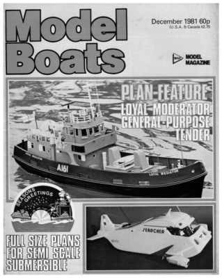 . 2 lal -= we % nuary 19860 ‘Ja ® (-R. 85p U.S.A. & Canada $2.75) , wab> MODEL MAGAZINE ~_ Launching Day a ,, e | for Steam Ship ” ze ‘Si ll Fu S# US PA 1920 ’59H.M. Cis & syibgece “T SAILWINCH. * Fully proportional * Three 1 | sizes of drum available _ * Compatible with virtually all R/C systems (state which) * Drumcanbe setfor any number of turns * Suitable for RM and R10R or scale boats. * £29.84 complete or £1 7.94 Mechanics only. ho LD ELECTRO 5S,UNIT 10, ¢ TE UNITS FROMWAWOR TFORD, HERTS. = \ \NDOWN ROAD, IV DR E IN RB TU L A E R A Y O J N E N A C U O Y W NO IKE THE ORIGINAL! _ ; JUST L turbine engine for model ships Designed and builtin High performance steam Japan, 4 subsidiary of World Media Inc CHANGEABLE PITCH INE V2 TYPE STEAM ENG14m m length: 48mm, Shaft dia: 4mm, 300g . Screw dia.: 62mm. Pitch inifinitely changeablefrom (forward) O to 1.3x screw dia. (80mm) and (reverse) O to 1.0x jet oiler. Wada Works Inc., SBURNER SET TURBINE & BOILER/GAwidth : 81mm, height: 110mm, weight: 00rpm. Operating speed: Turbine 30,0-in valve for forward, re. Built Transmission 3,000rpm d regulation. Maintenance free. verse, stop and spee Original turbine sound! , Boiler capacity: 850cc, length: 230mm, width: 80mm height: 110, weight: 1100g. ator. Two safety valves. level indic Gasburner. Water ol. as opSteam volume contr Pressure gauge available tional. For ships from 1 to 3mm long. £108.00 USS198 SCREW screw dia. (62mm). Shaft dia/ length: 4mm/250mm Shaft and stern tube can easily be shortened. All metal corrosion resistant. tries must he by Bank Draft or Money Order in Stg. bore, 13mm stroke. Built-in steam Shaft dia.: 5mm, length: 80mm, width: 138mm, height: 118mm, weight: 900g. Operating speed: 3,000rpm. and All parts are made from solidbrass , as durable material such etc. copper, stainless steel, for Original Stephenson control half forward, reverse, stop and speed. Suitable for ships up to 2.2m . FACTORY DIRECT PRICES long £36.05; USS68. £84.00 US$158 , INC, MODEL CRAFT DEPT. , JAPAN.J HAMA 4231WOR YOKO382 X 362,Tele LDM 276 x: 28 US Funds. Allprices exclude our +1. qe) 669-81 ttance from all: coun*immediate Delivery. We send goods worldwide byorairmail.;Remi “ parcel handling. 2 cylinders, double-action, WORLD MED IA PORT P.O. BO Model Boa by William Mowll =The Launch, June 2, 1981 Thrashing water and clouds of steam at the long awaited launching of SS Gt. Britain. The completed model will be on display at the Model Engineer Exhibition. Alllaunch photos by Ray Brigden. 1844, the headache of pondering on nearly four years’ spare time and getting the completed ship through the N DECEMBER work spent, and all the publicity which the lowering Upper Lock, to the relative promise of free- building programme has received as the Immediately it was apparent that all the dom ship ballasting in the River Avon, was a serious has grown through the different toasting of ceremony, the vessel calculations preceded into the had been the water. over matter, depending upon wind and tide as stages, | felt | shared by proxy some of the well as “‘the altering of the masonry of the lock,’’ as Brunel so delicately put it. The crowds were there, tens of thousands of people, on both sides of the lock, despite a severe frost anda biting east weight which Brunel felt on that day. The locker and 12 in the aft brought her to the model was capable of a similar wide range correct level, making an all up weight of missed at an from walking up the aisle by the demands of wind. The curiosity as to whether or not early stage in the building schedule and the official photographer, the ship longed to “the fat weasel, grown too large to be re- long since forgotten. be free at last, but had to be held back — leased from its hole’’ would ever emerge generous. Six pounds in the forward chain of possible disasters, from the spectacular 62lb. Just like the bride who is waiting at explosion to downright, the door of the church, but is prevented abysmal failure, through some small detail One must, as restrained even, whilst shutters clicked at possibly go wrong, however, plan ahead unscathed, was enough to hold the atten- though tion of both the optimistic and the pessimistic alike. The success or failure of human even though the weather report was un- two frames a second. Her final release brought the original favourable and gusting winds threatened to words of the ‘Liverpool Mail’s’ correspon- endeavour has always had the element of possible disaster as one of its major attractions for the spectator. The macabre ques- spring a mast before the model was even dent to my mind: nothing can shipped into the transporting van. For this “The contours presented to the eye are of purpose, believing in the old adage that the more damage is caused to models in transit beautifully rounded in her lines with a tions silently and secretly pose themselves — will she sink, blow up, keel over, break than her back or just plainly refuse to budge? have to perform, | built an 8ft. x 2ft. launch- Brunel wrote a rather nervous letter to Guppy a few days after the undocking ceremony, in which he said, “‘If all goes well we shall all gain credit, but ‘Quod est scriptum, most exquisite grace — fine and gentle sheer, she sits upon the water like by any operational tricks they may a racing gig.” ing ramp, with the idea that the model could (Liverpool Mail, December 12, 1844) be handled much more easily like this and To be truthful, | had not thought of this even launched on the ramp in a familiar model ‘pontoon style.’ Its width protects the yards operate as a sailing and the stunsail booms and even provides a canvas alone, but as with the full size ship simply and vessel which could effectively under est manet’ — if the result disappoints anybody, | shall have to bear the storm and all that spite and revenge can do at The little bit of ‘springiness,’ so essential to in counteract the harsh r