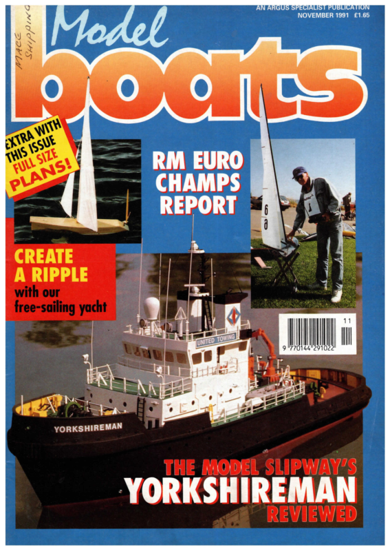 » fh . U KM NOVEMBER 1991 4 £1.65 RM EURO | CHAMPS REPORT | H A RIPPLE : . / \* soe iiB‘ Tomi YORKSHIREMAN Fl : wae De 4 ) 8 TEN Ls YORKSHIREMAN Build John Bone’s miniature sailing boat from our full-size plans – and discover the inexpensive delights of vane sailing In the Beginning often wonder what became of my very first model sailing boat. It was given to me on my eleventh birthday and so began a lifelong fascination. Over the years, despite divergences into other hobbies and interests, I have always returned to the small yacht for simple sailing pleasure. To sail a humble toy boat successfully on a large lake, with no power other than nature and one’s own ingenuity, is arguably one of the greatest challenges of our hobby. It has developed into a personal quest to find the ultimate small sailing machine and I have built countless models since that birthday present nearly thirty years ago. The commercial toy sailing boat has suffered complete neglect for a long time and it has never been able to rise above its ‘piece of string’ image. Given the archaic designs that most manufacturers cling to, there is little wonder that today’s ~ youngsters find them totally boring. The pleasures of simple sailing have been missed by a whole generation and the ultimate loss will be ours. In the light of school project. The overall length of sixteen inches has been established as the optimum, based partially upon the length of a sheet of balsa and the size of a plastic carrier bag. This boat is large enough to sail well, yet quick and simple to build, falling easily into the ‘miniature’ category. Ripple possesses no particular design surprises, her astonishing performance our present ‘green’ consciousness this coming about by close attention to detail hobby has much to offer and every effort should be made to encourage it. With a little thought the small yacht can be made to sail with considerable precision at speeds that are quite out of proportion to its modest size. That this can be achieved is worthy of recognition and an aimed at improving efficiency, the major failing of the toy boat. By a reduction of acknowledgement of the purest form of model boating. The model presented here has taken a long time to arrive, having been slowly refined and.developed to extract the maximum performance from the minimum of boat. She is a champion of her type, bringing the toy boat right up to date and on towards the next century. Ripple Ripple can be built for less than five pounds and on this alone represents excellent value. Whilst not entirely suitable for the novice to attempt, a little supervision from a more experienced modeller will help to develop the necessary skills and perhaps make an interesting 36 the scantling sizes to an absolute minimum, the cockleshell hull weighs less than half an ounce. A 75% ballast ratio has been achieved despite an all-up weight of only four ounces, putting the boat on a par with many high-tech Marbleheads. The ultralight displacement, high power and easily driven hull form is a sure-fire recipe for a fast boat, especially when propelled by an efficient rig. A simple, yet effective vane gear completes the set-up, making a miniature yacht with a superb sailing ability. The vane gear is an essential piece of equipment without which the model is virtually useless. The toy yacht will never be able to sail properly without one as it gives the boat an ability to think for itself, no other form of selfsteering system being able to match it. Once the difficulties of control have been overcome it is a great temptation to drive the boat very hard to see just how fast it can be made to go. This leads to a problem Ripple, moments after release, feeling her way through the dead patch at the windward end of the lake. that is also common in some of the larger classes — submarining and the pitchpole capsize. Due to the scale effect of the weather, the tiny model spends much of its time dealing with relatively extreme conditions. MODEL BOATS Heading, vane and sail trim for a beam reach. Note the apparent wind angle of the vane. The windward end of the lake may be an impossible area of doldrums, the short rig being unable to reach any high-level zephyrs that curl over the bank, whilst the steep broken waves at the leeward end are more akin to Cape Horn! The aircraftcarrier bow flares are therefore vital to give the boat a chance of survival, providing lift and buoyancy when the going gets tough. They are quite effective and when travelling fast, water can be seen squirting out horizontally from beneath them. The flares are added at the expense of windage and so their size and shape should be kept in moderation. Increasing the draught in the search for more power and speed should also be guarded against as, due to the short waterline length, the often violent changes in trim will conspire with a deep fin to trip the boat up, precipitating the pitchpole routine. Ripple has been observed in rough weather to submerge and perform a complete cartwheel before skating off a vertical centreline on both sides, is sprung into place and stitched with a spot of Superglue at each corner. The fairness of the hull is checked by laying it on a line drawn on the building board, ensuring that it passes through bow, stern and bulkhead centres. View the boat from ahead to check that it is not twisted at the stem and run a bead of Superglue into the joint from the inside, keeping it clear of the taped-up bow flares as these will be separated later. Superglue only sets quickly when used in small quantities or thin layers, so allow some time for this joint to fully harden. Cut and shape the stern bulkhead noting the chamfer at its sides and glue it in place, checking alignment again on the building board. Thé maximum beam of the boat is a shade below three inches and so the bottom panel can be fitted in one piece. Mark a centreline on the inside and stitch it in place with a spot of glue e