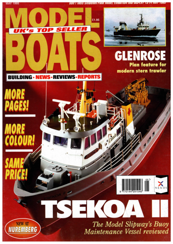 GLENROSE Plan feature for BUILDING – NEWS – REVIEWS: REPORTS | saddles n stern trawler un | TSEKOA i” Newar’TM NUREMBERG The Model Slipway’s Buoy Maintenance Vessel reviewed YACHTING Right: I’ll try and get the whole boat in next time. No. 19 is a Paradox using a shroudless conventional rig. This is a “C” rig, the shortest luff length for a full size rig used on today’s Marbleheads. The rig is fitted to the yacht in a similar way to a swing rig but one can see the forward yard that is locked ANTHONY CORBETT covers a variety of subjects plus an interview with guru Graham Bantock on rig construction, tuning and Marbleheads down to the bow deck beam and takes the tack of the jib. Below: the boot referred to in my missive on the One Metre rule changes. Although the picture is not brilliant, you should be able to make out the sheeting line that winds around the “heel”. The clip at the front fits around the fin box and the back has a half tube which locks against a post in the hull. In the other half of the shot, you can see the position of rudder servo and winch as well as the hatch cover removed, allowing access for battery and F my article in the March edition of irst a number of minor corrections to Yacht Lines, errors probably caused by the combined efforts of an exhausted scribe and an over exuberant spell checker. My thanks go the kind reader who demonstrated that he actually reads what I write by pointing out that the R36R design was a “Deduchan”, Alex Austin’s follow up to the “Taxachun” and not a Deception. The next error was the reference to Housemartin’s latest RM offering as a “Shaft” rather than a “Stark”. My apologies to anyone that was confused by said errors. One Metres “God not again!”, I here you cry but after all the recent correspondence regarding this class, those that actually read the rule, design and build the boats, will wish to know about the recent rule revisions that have been promulgated by the Model Yacht Racing Division (MYRD) of the International Yacht Racing Union; see the March edition for more detail about these organisations. As I have said before, there were a number RX changes. The RX is of flaws in the One Metre rule, many of held in place by Velcro. which came toe¢dight when yours truly wrote The unit is completed by cutting a waterproof material like fablon to shape and taping to the unit to seal it. A clever idea that can cut down on equipment costs. to the then MYA Technical Secretary asking for a ruling on the use of a carbon fibre “Yacht-boot” to contain the radio gear and winch. Those new to the hobby will probably have no idea what this “boot” is and others will perhaps just say that carbon fibre is banned anyway, however the latter is certainly not true, with many builders using c/f rudder post tubes and mainsheet posts. Anyway the point is that the boot, a device developed by Roger Stollery for use on his own boats, allows all the electric’s to be contained within one reasonable watertight unit and more importantly, transferred from yacht to yacht. I will include a photograph of a typical unit so the reader can get an idea of what it is all about but it is unlikely that you will have missed the potential for savings on spares and back-up. Most of us who sail the latest generation of Stollery Marbleheads have two of these boots that can be quickly changed over in the event of an electric failure. This means that a winch failure need not necessarily mean one being out of any more than one race. Now if you can design all your yachts to accept the same container, then the outgoing on winches alone (£100 a time) can be drastically reduced. Given that the One Metre is supposedly all about reduced expenditure, it was quite a surprise when the boot was ruled out. However the subsequent debate indicated that all sorts of other fittings and practice did not comply with the rule, so it was known that a major revision would be required. Please indulge me and my ramblings about this case but I think it is a good example of the difficulties involved in writing a rule to make a yacht class “simple”, as the One Metre is intended to be. In my experience of both full sized and model yachts, the simpler the intended boat, the more complicated the rule as the creators are forced to exclude everything that it is felt might conflict with the intention of the rule. In the case of the boot, I suggested that as the rule allowed plastic radio containers then a carbon fibre boot to contain the electric’s was in class. Look up the definition of plastic and you will perhaps start to understand. The Technical Secretary didn’t agree and I must admit to some sympathy with some of his concerns but in principle, everyone seemed to go along with the idea that a boot should be permitted. It’s worth noting that it wouldn’t have fitted in the boat anyway as the hull I used is quite shallow! I set out this little story to illustrate one of the reasons behind the most recent amendments to the One Metre rule, as there are bound to be those that will automatically switch to whinge mode. Those that belong to MYA affiliated clubs will of course have received the excellent leaflet issued by the Technical Secretary of MYRD. This explains the reasons behind the rule revision and highlights what might need to altered on your boat to comply with the 1995 rule, which incidentally comes into 56 affect on 1st June. For the rest of you I duplicate the main issues that have been addressed: 1. There is no keel thickness limit (This deals with the German proposal to control the thickness of fins). 2. A second pair of shrouds is not permitted (For some reason it was suggested that this should be permitted as an alternative to spreaders). 3. Corrector weights of lead are now permitted in rigs (The One Metre rule sets a minimum weight for the yacht and rigs in sailing trim. The No. 3 rig weighs far less than the top No. 1 rig, so som