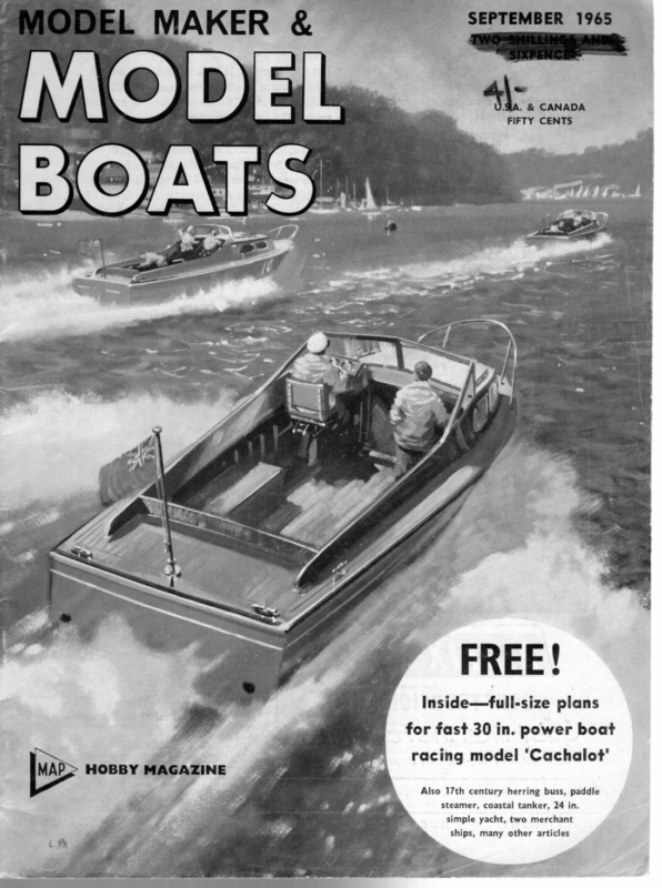 FREE! Inside—full-size plans for fast 30 in. power boat racing model ‘Cachalot’ Also 17th century herring buss, paddle steamer, coastal tanker, 24 in. simple yacht, two merchant ships, many other articles MODEL BOATS SIGMA Simple 24 in. sailing model By I. A. Wright CoN construction by pin pricking through plan, cutting out, and cementing together the two halves of D2. After cutting out the hatch, pin to a flat building board protected by wax paper. Mark out positions of Fl to F8 and cut these from & in. balsa sheet. These can now be glued to D2. Cut out and cement the two halves of D1 and, when dry, cement to hull together with FIA, F3A, F4A, FSA, KIA, KIB, F7A. Leave to dry and remove from building board. Consiruct keel from § in. balsa sheet and lead and check fit into keel slot. Insert the length of 8 in. sq. balsa between D1 and D2 and glue to F3 to form mast support. Fit and cement brass rudder tube (18 s.w.g.) in correct position at stern. Fit and cement all screw eyes in their correct positions. Give ail interior parts one coat of sanding sealer. Place the side of the hull on a ;% in. sheet of balsa and mark the outline of the side of the hull. Cut out and place on another ;!; in. sheet of balsa, and cut out second side hull sheeting. Cement first side to hull, holding it in position with pins and elastic bands. When firmly cemented trim sheet down to D1 and D2. Repeat procedure for the cther side of the hull. When the sides are completed place one side of hull bottom on ;!; in. sheet balsa and cut out outline. Repeat for other side of hull bottom, remembering to cut out recess of keel slot on each piece. Cement one side in place, hold with pins and elastic bands and leave to dry. Repeat for other side. When both sides are dry trim down to D1. Lightly sand hull and apply three coats of sanding sealer, lightly sanding down in between each coat. Although it is not absolutely necessary to tissue cover hull, if an excellent finish is required this should be done at this stage. Apply tissue with sanding sealer and dope brush, taking care to keep hull surface free from wrinkles in the tissue. Sand hull lightly before applying final paint work. The prototype was completed by giving hull and deck three coats of clear varnish, lightly sanding down between each coat. The mast is constructed from 4 in. dowel and is 32 in. long. A hole is drilled in top and bottom to accommodate & in. of 18 s.w.g. brass tube, at the top for burgee bearing and at the bottom for mounting the mast on the hull. The top tube should project é in. and the bottom tube ; in. Drill hole horizontally through mast at position shown on mast plan for bracing strut. Screw in screw eyes at 73 in. from tip of mast facing forward and 2 in. from bottom facing forward. Give one coat of sanding sealer and one of varnish. The boom is constructed from ;%; in. sq. hard balsa and is 9 in. long and slightly tapered at one end. Round square section to approximately circular sections, screw in screw eyes 3 in. from either end. Give one coat of sanding sealer and one coat of varnish. The rudder is constructed from 4 in. balsa and mounted on a 20 s.w.g. rudder pintle as the plan. The rudder pintle is bound to rudder arm with strong cord and cement, Fit skeg to hull. Both the rudder pintle: shown on the autoas shown. and auto- rudder arm are constructed from 20 s.w.g. piano wire. The rudder pintle is placed in the rudder tube and then bent to support the rudder. The jib horse is constructed from a large paperclip opened out or piano wire about 18 s.w.g. and slightly curved to radius of jib. This is mounted on the foredeck as shown on the plan. The mast and boom pivot is constructed from 18 s.w.g. brass tube and 20 s.w.g. piano wire. Bind ? in. 18 s.w.g. brass tube to mast as shown. Construct pivot from 20 sw.g. shaped to an “L” shape of approximately 3 in. outside. Push one end into boom end and cement in place. When dry place in 18 s.w.g. bush on mast. Construct kicking strap from a paper clip forming a hook at one end and fit into bottom of brass bush, bend other end at right-angles and push through screw eye then bend round to side of kicking strap. The diamond bracing strut is made from 5 in. of 18 s.w.g. brass tube pinched at each end. Insert through hole in mast before pinching the other end. Cut ;/; in. slots in each end with a small hacksaw to accommodate diamond bracing. The burgee is made from a triangle of polythene cemented to 2 in. of 20 S.W.g. piano wire. Step mast on to hull by drilling a hole in the correct position for the brass tubing to fit into. Support mast by fore stay and the main stays. The rigging was made up from Terylene cord and used bowsies, screw eyes and shroud hooks as shown on plan. The large overall stays are fixed by looping the Terylene cord through the shroud hooks and fixing by bowsies. The top of each shroud is made into a small loop and fitted over the projection at the tip of the mast. 364 SEPTEMBER SIGMA 1965 ne CoPYRian? MODEL MAKER PLANS SERVICE The diamond bracing is fitted over and around the projection at the top of the mast, fitted into a slot in each side of the brace and finally threaded through a hole 2 in. from the base of the mast and tied and cemented around the mast. The sail shapes should be construcied on cartridge paper, using the sizes given on the detail plan. The paper pattern should be pinned to the sail cloth after they have been cut out, the jib pattern should be pinned down with the aft edge along the selvedge of the cloth. The mainsail pattern should also have the after edge along the selvedge. Cut round the patterns % in. out from each side—this forms the hem. Fold the hem in once and pin in position, remove the pattern from the cloth and fold hem inwards once more. This brings the hem to the correct sail shape and size. The hems are machine sewn, removing pins as you progress with the sewing. Tie loops of cord on to sails at places shown on plan and secure m
