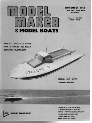 OCTOBER 1964 TWO SHILLINGS AND SIXPENCE U.S.A. & FIFTY CANADA CENTS CONTENTS INCLUDE : H.M.S. RESOLUTION BOATING OVERSEAS GUMSTRIP BUILDING EGYPTIAN SHIP ARMOURED CAR INSIDE : FULL-SIZE PLANS TO BUILD THIS ATTRACTIVE SAILING EL HOBBY MAGAZINE M.S. WORCESTERSHIRE CENTRE PUNCHING AND OTHER ARTICLES emia In the Tideway Wet. there’s no doubt that the young lady in the photos on the right is in the tideway! These fascinating pictures were processed from 35 mm. transparencies sent to us by T. E. D. Dodds, of R.A.F., Seletar, Singapore. Mr. Dodds lives in a bungalow on the northern beach at Kampong Layang, Singapore, and the photographs were taken during the north-east monsoon which gives strong and steady winds in the spring. The local Malay youths find conditions ideal for sailing their scalish outrigger yachts, rowing a couple of hundred yards off-shore and releasing the models shorewards. Speed is astonishing and yet the models never put their bows under. On average extremely well-built, the hulls are polished hardwood and quite ornate; the black objects on the outriggers are cones from nearby trees, significance unknown. The model in the picture flies a pennant won in a race at Changi village and apparently changed hands at a_ price equivalent to £4.13.0d. — a lot of money to the locals, indicating that modellers are the same the world over! We particularly like the feminine angle, though here is an obvious difference. Few clubmembers’ wives would splash about so enthusiasti- cally. In contrast, Mr. Dodds mentions that local fishermen neglect the use of sail and use very narrow beam sampans; occasionally, however, one sees a Bermudan rig or an enterprising character standing, arms spread, with a large sheet of polythene to speed his homeward journey. Records Quite a number of new European R/C_ speed records have been set so far this year, times having been lowered six times in four categories. The latest marks set, with the 1963 figures in brackets after each, are as follows: 30 watt speed, M. Nouailles, France, 86.9 secs. (117 secs.). 300 watt speed, C. Bordier, France, 37.0 secs. (41.07). 32 speed, K. Matschulat, 27.5 secs. (28.6), and 10 c.c. speed, also Matschulat, 24.5 secs. (28.2). These times are all for the standard triangular course, 30 metres between buoys, one lap, a turn, and a second lap in the opposite direction. We expect to see at least three of these boats in action at Ulm a few days after writing these lines, and therefore hope to give photographs in our next issue. We also hope to catch them (or at least boats of similar performance) on 8 mm. cine film, which will provide an oportunity of showing modellers in this country some of the leading Continental boats in action. Looking at the times returned in the R/C speed eliminators, it is obvious that considerable strides have been made in this country. Two or three models completed the course in under 50 speed is simple enough to lay out. go at it? REMAINING M.P.B.A. REGATTAS, 1964 Sept. 20 20 20 secs., whereas the 1963 winning time was 60 secs. and the 62 time (admittedly over a four-lap course) 73.9 secs. The gap in speed opened up over us in the last couple of years by, especially, the Germans, has rapidly closed; in rough water we would probably win but we could be a second or two behind under the smooth conditions customary for many Euro- course, which What about one of our enterprising clubs having a 20 20 27 Oct. pean meetings. It would be illuminating to see what times our boats could return on the standard Naviga 466 27 4 Wulfruna M.B.C., West Park Pool, Wolverhamp- ton. 11 a.m. Fee 2/6d. — R/C Steering. Brighton and Hove S.M.E., Hove Lagoon — R/C. Cheltenham S.M.E., Arle Court, Cheltenham — R/C, S/R. Kingsmere Model Power Boat Club, Rushmere Pond, Wimbledon Common. 11 a.m. No fee. — S/R, R/C. Fleetwood M.Y, and P.B.C., Fleetwood — R/C. West London M.P.B.C., Victoria Park, E. 11 a.m. No fee — S/R Regatta. Burnley M.B.C., Shempsens Park, Burnley — R/C. Southern Counties Steering Championships. 11 Portsmouth and District M.P.B.C., Canoe Southsea. 11 a.m. — R/C Steering, R/C and special event for superhets. 18 25 Brighton — as above. Fleetwood — as before. Lake, Speed WMOWEL IMVANRIEIR 1964 BRITISH OPEN ‘A’ CLASS CHAMPIONSHIPS AND INTERNATIONAL Gosport, August 9th ham) Juanita both with 13 pts. and D. A. Wilkinson’s (Fleetwood) K.796 Ayala lying third with 12 pts. Monday, although bright, brought a complete relapse of sailing conditions, with the wind as slight as it had been the previous morning and gradually falling. A 9.30 a.m. start was made with the pairs getting away pitifully slowly and again by lunchtime a single heat had been completed. After the lunch break hopes were up for a repeat of Sunday’s weather with the wind is 10 a.m. on the morning of Sunday, August 9th, the 1964 National Open ‘A’ Class and International Model Yacht Championships got under way at Gosport. After his customary welcoming of competitors, the Mayor of Gosport, Councillor H. W. Cooley, started the first pair in the National Com- petition in fine but calm conditions — in fact, the wind was light and variable, and mainly from a westerly direction. Scoring for this the first day was set at 2 pts. down the lake and 3 pts. back and, despite the lack of wind, a complete heat was concluded by lunchtime. Things looked brighter after lunch, however, and when sailing resumed at 1.45 p.m. the wind had backed to the south east and freshened to a good, moderate sailing breeze, much to the satisfaction of the skippers. Scores at 4 p.m. showed K. Jones’ (Birkenhead) K.806 Mersey Beat in the lead with 15 pts. with E. G. Leech’s (Fleetwood) K.809 Kai-Sara tying for second position with C. H. Elsom’s (Clap- picking up throughout the afternoon but, alas, it was. not to be. At 2.30 p.m. O.0.D. C. E. Brazier was forced to call a halt due to absolute lack of wind. Things did pick up later in the day, though, and