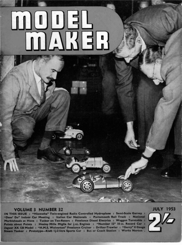 VOLUME 3 NUMBER 32 IN THIS ISSUE : “Hiawatha” Twin-engined Radio Controlled Hydroplane : Semi-Scale Garvey : a el “Dees’ Do” Indoor Car Meeting : Italian Car Nationals : Portsmouth Rail Track : National Marbleheads at Hove : Tucker on Ten-Raters : Freelance Diesel Electrics : Waggon Turntable : Points about Points : Healey Mille Miglia for 4cc. Engines : ‘Number 12” 10 cc. Record Car : _ Jaguar XK 120 Model : “H.M.S. Wolverton” Freelance Cruiser : Drifter-Trawler : “Gerry” 0 Gauge _ Steam Tanker : Prototype—Kieft 11-2 litre Sports Car : Bus or Coach Station : Works Norton . JULY 1953 HA 36 in. UNRESTRICTED CLASS MODEL YACHT This model is effectively rudder controlled only by the E.D. “Boomerang’’ ready-wired RadioControl Unit, the E.D. Mk. II Miniature R/C Unit or the E.D. Mk. Ill Miniature R/C Unit. The rudder control is operated by the E.D. Mk. | Clockwork Escapement. Radio, Servo and batteries are housed in hatches in the deck. “A” CLASS MODEL YACHT This model is fully radio-controlled by rudder and sail with the E.D. Mk. IV Tuned Reed and 3-Channel Radio-Control Unit. For more than one operation (i.e., rudder and sail) the reed unit is, of course, essential. This magnificent model was built, installed and operated with great success by Mr. George Honnest Redlich, the R.C.M.S. Fleetwood Winner, and Percival Hove Winner. E.D. Marshall, RADIO CONTROL UNIT PRICES E.D. Mk. Ill ‘Miniature’ (Transmitter, Receiver, and Escapement) E.D. pt “Boomerang” mitter, Receiver seo RED, LS (Trans- Escapement), completely wired, soft or hard valve) £11 showing eck, ShOWINg the E.D. tag Mk. 19 6 E.D. Mk. Il ‘Miniature’ (Transmitter, Receiver, and Escapement) three hard The radio and servo installation (inset) in the drop-in box on the deck, ; and “beter? 1 ead £17 Il son ety tuned Reed 3- IV x annel : receiver, rudder mechanism, sail mechanism, and batteries. Unit, 6 comprising Transmitter Control Box and Receiver, less Escapement one eh … £23 15 0 All Prices include Purchase Tax “ELECTRONIC DEVELOPMENTS (SURREY) LTD KINGSTON-OW THAMES DEVELOPMENT -E GItNeEER S REPLYING TO 1223 (8,VILLIERS ROAD, KINGSTON -ON-THAMES, SURREY, ENGLAND. KINDLY MENTION “MODEL MAKER” WHEN ADVERTISEMENTS | ne eS SS MODEL MRKER 10- RATER DESIGN INTRODUCTORY 10 – Il A NEW REMARKS RATER TO DESIGN WHICH WILL APPEAR IN AUGUST BY B. TUCKER buying plans that have been designed as a whole. If you try to “improve” them, you are quite likely to ruin the boat by introducing features that are out of keeping with the original. So, please, keep to the design. When a set of lines are published, the designer seldom hears from builders, particularly if they are successful yachts. Recently at a Southern Club, I was shown two boats by a member. “There you are,” he said “* Twins from your published design. This one, mine, Club and District Class Champion—that one second, Mr. Dash’s, just a few points behind in each race.” Yet I had never heard that a single boat had ever been built to these lines or had any news about performance. Of course it was nice to know, but a little information as to performance, etc., is always helpful and an A study in wave making: Though not a flattering picture o Lynx this shows her action and wave throw very well. These points are of great interest to a designer. At the time there was a moderately light breeze, and the boat was travelling fast. It will be seen from the distance apart of the crests of her bow and stern waves that even in a comparatively light wind she uses almost her entire length, and maintains her fore-and-aft trim exactly. Her clean wake shows how little water she pulls astern of her, and how well bow and stern wave are synchronised encouragement to the designer. The design which accompanies this article is a10-R. This is the oldest class of model yacht in use, and is to the Length and Sail Area Rule, promulgated by Dixon Kemp in 1887 for the A®* a designer I naturally take great interest in models built from my designs. H. Yet success in model yacht racing is only attained by a combination of good design, good building and good handling, and of these the key factor measurement of full-sized craft. It contained two novel features. Under it Sail Area was measured for the first time. Also instead of measuring L.O.A., as hitherto, L.W.L. was is the skipper. Some years ago I visited a strange pond and made myself known to some members of the local club. One of them told me he had built to one of my published designs, but the boat was measured. This rule produced a number of Classes, and at first proved very popular, especially in the 3-R and 1-R Classes. It was adopted by model yatchsmen during this time for several Classes including the 10-R on a scale of 1 in. – 1 ft. The fact that L.W.L. was measured led designers to evolve boats with long overhangs in order to gain unmeasured sailing length. As not a success. Now I knew this design had produced a number of excellent boats, so I suggested he should show her to me. On inspection I saw the boat was well built and finished, but instead of her stern matching the bow, as in the design, she had a great, heavy stern that was entirely foreign to the design. I enquired, and it appeared that the builder had showed the lines to Mr. Bill Blank, who opined the quarters wanted filling out. I detail this for the benefit of any novices who may read this article. It is a waste of time and money to build to an inferior design. On the other hand, if you buy a good design, you are a result, though early Raters were desirable boats, later ones became shallow, beamy scows with inordinately long overhangs. As a result, the Rule was ultimately superseded by the Linear Rating Rule of 1896. I myself once owned an old 1-R, 30ft. L.O.A. on a 20 ft. L.W.L. To-day, the sole survivors are a few old 1-Raters which race up-river, but in models the 380 Sea July 1953 10-R remains as popular as ever, and, a