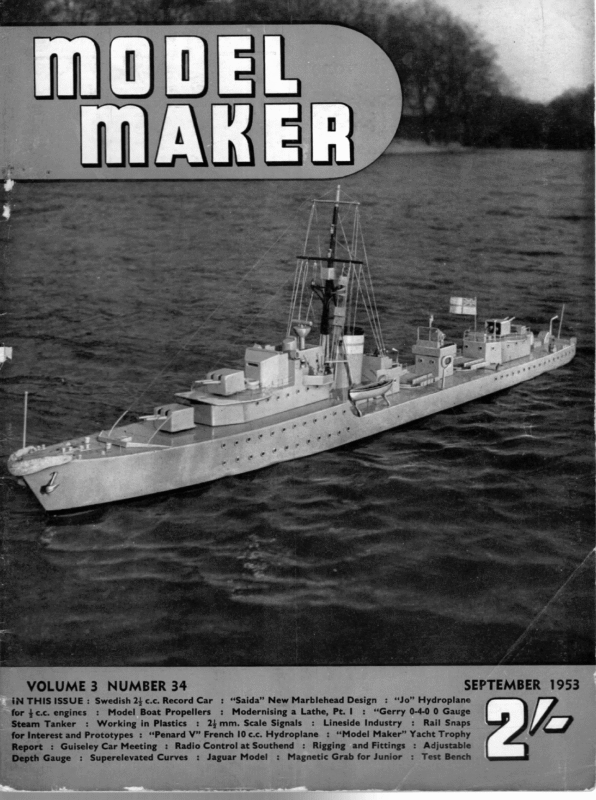 VOLUME 3 NUMBER 34 SEPTEMBER 1953 iN THIS ISSUE : Swedish 2} c.c. Record Car : ‘“Saida’” New Marblehead Design : “Jo” Hydroplane – for $c.c. engines : Model Boat Propellers : Modernising a Lathe, Pt.1 : “Gerry 0-4-0 0 Gauge Steam Tanker : Working in Plastics : 24mm. Scale Signals : Lineside Industry : Rail Snaps for Interest and Prototypes : ‘Penard V” French |0c.c. Hydroplane : “Model Maker” Yacht Trophy Report : Guiseley Car Meeting : Radio Control at Southend : Rigging and Fittings : Adjustable a Gauge : Superelevated Curves : Jaguar Model : Magnetic Grab for Junior : Test Bench Mu) = ass Se MK IV RADIO CONTROL UNIT TUNED REED—3 CHANNELS The last word for the control of all models which demand progressive, personal and accurate following of multiple orders. In weight and size the complete receiver and battery assembly can be used for model planes of down to 66 inch wing span and boats of 30 inch length. It is also the only type of equipment capable of operating both sails and rudder of model sailing boats. A self-contained transmitter housing all batteries and with 8-foot sectional monopole aerial is supplied with a general purpose hand control box for three channel operation. The receiver uses standard hard valves throughout with an average life of 3,000 hours. Receivers are pre-tuned to the transmitter and once installed, there is no necessity for any further adjustment. The receiver output will operate either escapements or electric motors. Recziver size …… 5 x 3 x 2 ins, Recaiver weight ……… 84 ozs. Receiver battery weight Range exceeds ……… 643 ozs. 1,000 yds, PRICES E.D. Mk.1V, Tuned Reed 3 Channel Unit: Complete… £23.15.0 Separately: — RRGQOOIVOR occ cta trades <3es te £14, Transmitter, and Control Aerial 5.0 Box ............ £9.10.0 All prices include purchase tax ORDER THROUGH YOUR MODEL SHOP “ELECTRONIC DEVELOPMENTS (SURREY) LTD STON-OW THAMES DEVELOPMENT. on S aN SES EORPS 1223 (8, VILLIERS ROAD, KINGSTON -ON-THAMES, SURREY, ENGLAND.: KINDLY MENTION “MODEL MAKER” WHEN REPLYING TO ADVERTISEMENTS F J. HEMSLEY proved a worthy winner of * the Second MopeL MAKER Trophy for 36 in. Restricted Class Yachts held at Barnby Dun, on July 11th and 12th, and organised by the Doncaster M.Y. & P.B.A. It was a triumph too for MoDEL MAKER’s sharpie design Lancet, for the winning boat Lanett was the very first boat ever built to the design, and sailed straight off Tommy Lance’s board ! The winning boat was fitted with a lightweight Vane adapted to 36in. class sailing, and, as the out of water photo shows, had a slightly deepened skeg and cutaway keel to compensate. A sister ship Bowie in the hands of clubmate A. R. Turner unfortunately suffered damage and was withdrawn, or we should have been able to compare conventional Braine with Vane sailing. Second boat home was Hon. Secretary Reeves’ boat Reelew skippered by E. Baker. This is a Duck boat built to the original Donald Duck plans by Adams of Yarmouth and fitted with a half-scale Mullett type Vane, weighing 2% 0z., which has been developed successfully by the Doncaster Club (Arthur Mullett please copy !). Heading: Doncaster Club Commodore and O. C. Thorne Sea Cadets, Lt. Comdr. J. Farrell, takes the salute at the hoisting of the club pennants with full naval ceremonial at Barnby Dun Third was another MopEeL MAKER design Harlequin, again in the hands of Bournville skipper R. Harris. This has had a busy season being close to winning brackets on a number of occasions without quite making them, except for a club event, and will now be retired for the winter to have minor modifications learned in competition incorporated. Left: Second boat, Mr. Reeves’ Renlew which took second place, skippered by E. Baker, in the foreground, while in behind it can be seen The entry was pleasantly widespread, the thirteen boats coming from _ Birkenhead, Brighton, Bournville, Nottingham, Doncaster and Sheffield. One new boat from Nottingham Jack Flash was withdrawn after the first day’s sailing as it was obviously insufficiently tested to compete in an open event, which with the damage to Bowie left eleven active participants. In addition to their variety of club, they also Harlequin, third place boat, with Ron Harris releasing it Left: A group of competitors and supporters on “dry land.”’ Note the shelving sides on water on left Right: the Panther _ fore= groundleads Harlequin. Centre: The Daniels design Blue Belle, which showed such promise in a board with Kreen behind, which came sixth Extreme right: Two vane geared boats, Lamouette(10) and Eagle (5) another Lancer boat which came fourth September 1953 showed a most catholic variety of design and age, varying from 1953 registrations back to a thirty-year-old boat that started life as a Daniels One Metre design and had its stern chopped to make the 36 in. class! This boat, Invader, skippered by R. Beaumont of Sheffield, though narrow in the beam was by no means outclassed and won some good boards. J. E. Tansley’s Heather Glen was another interesting old timer, being a canoe bodied Alexander design in the “two-hundred”’ registration range. We particularly liked Blue Belle, which at one time looked like leading the first day’s ee a sailing. This was a first-ever boat built by its skipper L. Patchett from the Daniels design in his half-guinea book “Build Yourself a a Model Yacht,” and very closely resembles his Midge. It can safely be said that given another season’s experience Blue Belle will win races for its skipper, though Bill Daniels makes no out-and-out racing claims for the design. Another Lancet sharpie that showed promise was in the hands of local clubman J. Schofield, who had a strong juvenile following encouraging his every board! The Barnby Dun water is some 285 yards long and about 40 yards wide, which means that a straight run without retrim is the exception rather than the rule. The absence of local trees or buildin