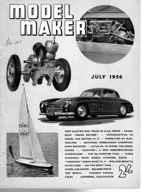 JULY 1956 FIRST ELECTRIC RAIL TRACK IN U.S.A. OPENS : CANAL BOAT “FRANK RAYNER” MODEL CAR RACING, Pt. Il TROLYSIS : : : HYDROPLANE : NEW AIRSCREW-DRIVEN THE ALL-PURPOSE TOOL FROM SINGLE CHANNEL “TARANAKI ” CARGO BOAT, Pt. II IN PICTURES TALKS : : THREE RADIO – : WELLING REGATTA : ON THE RIGHT TACK : MODEL CAR NOTES : READERSWRITE TEST BENCH TO MODELLING BY ELEC- LOTUS Mk. IX MODEL FOR DIESEL “SCOOTER”, A CONTROLS : INTRODUCTION NATIONAL MARBLEHEAD CHAMPION- SHIPS REPORTED POWER : : : TUCKER’S TOPICAL UNIVERSAL CALCULATOR fam | MODEL 1956 MARBLEHEAD CHAMPIONSHIPS EIGHTEEN ENTRIES GOMPETE AT DOVERCOURT MAY 19-21 Left, Triumph ,local winner and second oldest boat in the race, moved into top place during the first day, was 15 ahead on the second, and won comfortably with a final 11 point lead. Centre, second boat Doris H SECOND was 1954 winner and is a real veteran. Right, third place went to Anemone, another seasoned campaigner THIRD HE 1956 National Championship for Marbleheads was held at Dovercourt over the three days of the Whitsun holiday. The entry of 18 boats was extremely disappointing especially when it is remembered that the 1955 championship yielded a total of 42 competitors. The late withdrawal of the three French entries, owing to the political troubles, was a disappointment for all concerned, but nevertheless the complete absence of any boats representing the South Coast clubs was quite surprising. Under the control of Mr. Mark Fairbrother as O.O.D., sailing commenced on the Saturday morning with a light N.E. wind, and by lunch the oldest yacht entered, Doris H, had gained a four point lead over Emma and Hopalong. In the afternoon the wind backed and became somewhat lighter, and this gave a chance for all the skippers to show their skill. Triumph steadily improved her position and by the end of the day had built up a three point lead over Emma with Doris H lying third. The 342 weather during the day had been fine, but somewhat cold, the skippers and mates making full use of the teas supplied by the lady members of the local club. Sailing commenced at 10 a.m. on the Sunday with an off-sea breeze, which was light and very tricky. The most interesting board of the day was that between Triumph and Doris H, the latter boat gaining all five points by very narrow margins. The weather was quite warm, and the event attracted a number of model yachting enthusiasts from non-competing clubs. By the end of the first round the scores were as follows:—Triumph, 62; Doris H, 57: Gannet, 524; Foxtrot, 52; Scottie, 50; Anemone, 50; Emma, 49; Hopalong, 49; Varuna, 46. Gannet, a new Duck-design boat, proved quite successful, although not good enough for the mate, Mr. D. A. MacDonald, who at lunch-time decided that the sail plan was not correct, borrowed a pair of scissors, and cut off considerable portions of the mainsail. Foxtrot, last year’s winner, proved very strong JULY, 1956 Monday morning, Doris H and Anemone sailed each other, Anemone winning the beat by a very short distance, and the return run being a dead-heat. In the last heat of the.day however, both yachts gained full points, leaving Doris H second, Anemone third and Gannet Farthest travelled boat was Varuna, which came 300 miles from Ireland. Polythene is obviously difficult over there, hence the ingenious and despincorative ! naker fourth. The championship proved a great success in spite of the poor entry. The Ulster competitor, Mr. Tregenna, stated after the race that he considered that the 600 mile return trip had been well worth while. The sailing throughout the contest called for all the skill that the skippers could muster and at no time could the event have been described as “in the bag” for any particular boat. Most skippers agreed, however, that a little more wind would have made the event more exciting and given some of the heavier boats a better chance. An interesting point to note is that the three top boats bear registration numbers under “500”, proving that, with the right skippers, these designs can still head the list. on the beat, but with the very light airs she did not do so well on the run. All boats suffered with the light winds and consequently many resails occurred. During Sunday afternoon the wind steadily decreased and by the time the fifth heat in the second round took place boats were almost stationary on the pond. This state of affairs caused all sorts of sights to occur (such as Doris H returning over the starting line after she had been half-way up the pond, and then only just losing the board), but it did not last long, and the breeze increased again to give a run and a beat for the last two heats FINAL POSITIONS Triumph Doris H. … Anemone… .. Gannet … Foxtrot Hopalong Nicolette … .. Alexia .. Emma .. Scottie .. Varuna … Zoe … Skuall 1, 2. 3. 4. 5. 6. 7. 8.4 of the day. It was during this period that Triumph gained her real supremacy, only dropping seven points all the afternoon. Results for the leading boats up to the end of the second day were as follows:—Triumph, 95; Hopalong, 80; Anemone, 80; Doris H, 78; ll. 12. 13. 14. 15. 16. 17, 18. Letitia-May . Comet .. Spero Flamingo … Virgo lV … Foxtrot, 76; Gannet, 724. Monday opened with a steady breeze from the N.W., although still light. The main point of interest lay in finding out if Triumph could hold her lead in the face of such seasoned opposition as Foxtrot, Doris H, and Hopalong, all of whom she had to sail. As in the previous round, the Daniels’-designed Doris H gained the full points, she being the only yacht to beat Triumph each way in the contest. A light boat, built by Levison, Triumph has always proved to be equal to the others, and on this day it proved no exception, as she retained her lead of 11 points to win the championship, the first time a national trophy has been held by the” The position for second Dovercourt club. place was not settled until the last board. On Sixth place went to H