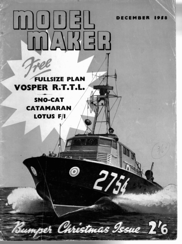 = MANE FULLSIZE PLAN VOSPER R.T.T.L. “ SNO-CAT CATAMARAN LOTUS F/I idiia Ti ! : MODEL MAKER) model principles provided sufficient data to ensure satisfactory performance with Sea Cat, Vic Smeed offers yachtsmen SEA MEW the first ‘serious’ Catamaran design for exciting sailing ITH the “discovery” of the catamaran by the full-size yacht types, and the tremendous publicity received by such craft on a national scale, it is hardly surprising that modellers should begin to show an interest in the possibilities of a cat. To the best of our knowledge the only cat model so far published (apart from very small examples in this magazine, and two smallish kit models) is the 30 in. model Sea Cat in Model Maker Manual. Although of very simple form, this model performs very satisfactorily, and it is therefore safe to embody many of the principal features in Sea Mew, albeit this is a larger, nicer-looking, and altogether more advanced design. Since we are moving into what is virtually a new model field, there is little previous experience to draw on; however, a study of successful full-size craft—the Amateur Yacht Research Society bulletins are perhaps the most helpful—plus applicable basic sailing and logical development of these ideas has produced Sea Mew. Perhaps the greatest value of the design is that it will provide a model which can be compared directly with conventional racing yachts, and any builder who arrives at the pondside with this model when any normal M.Y.A. 36in. yachts are afloat can be assured of an extremely live interest from all present! It would naturally be foolish to suggest that Sea Mew exploits the catamaran configuration to the full, because we simply don’t know. She could probably carry much more sail, especially in light airs, and we may eventually have to change our ideas on hull shapes, length/beam ratios, displacement, etc., but nevertheless we believe that she incorporates just about everything that is definitely known at the present time. After all, we’ve got to make a start somewhere, and in ten years’ time we may know enough to say that single central fins and rudders are superior, that bipod masts are better, that ballasted fins are unnecessary, that cats won’t point as high to windward but their speed offsets such a disadvantage; we may even have an official M.Y.A. class for them. At present, the only class in which they are permissible is the 10-rater, but a 6ft. cat would seem an awful waste if it wasn’t successful, which is probably why we haven’t seen one yet. The conventional 36R yacht weighs within an ounce or two of 12 1b. and carries, usually, about 800sq.in. of sail; Sea Mew’s sailplan indicates slightly under 500 sq. in., but on the other hand the displacement is only 5lb., and this is variable since, with an effective 18 in. beam, it would take a fair blow to push the leeward hull under or lift the windward one, and it might therefore be possible to dispense with the lead on each fin altogether. Constructionally, Sea Mew offers no problems. If the four hull sides are carefully fitted with the din. sq. framing and the bulkheads accurately cut, no problem of misalignment can arise in the individual hulls. The rig is pretty conventional, except that no shrouds are necessary. The fore and backstays form a pyramid adequately staying the mast from all directions; to obviate side whip a diamond stay arrangement is also fitted. For portability the entire craft strikes down by undoing fourteen nuts (sixteen including the rudders, if these are removed) and slacking off the four stay turnbuckles. It can be re- 604 DECEMBER, [aay Bac me DEsickeo BF SEA MEW = Sneed a op RASS LOC J 4 ass Tv STANDING \ ie MIGGING (Fonestars, BacestaTS face ptt CIAMOMD STAYS) “ ee e¢ XSg oe wiMaAMOGANT ETC er so N 1} | \ : JUMPER STRUT, 226 BRAS . z ao |\ AX : pagel beg saebeaee ole waneR PLANSAas SoOseeen im —— eS ‘ Catewanan 1958 , r mmuace Soba * sou0e “ okey | i & PROM 22-24 SmC STAINLESS | saceumt 6 Ys wine iran, wae | ” 7 DRESSMAKERS HOOKS & AETED on CPEMED EveRY 4° TO LUPPS OF BOTH Sant ‘ SBA BOLTS EVERY O° Ur mi 13 dp EADS PCKED TO RETAW teh: wily SorTee somews (TunBuceits) Om PORE & BACESTAYS, enous tunes ‘s Yo x 20 4″ yh BACHMAUL EYE 7 *2 se H TRACK (ines 8 ee | Lear | a CEES ;H L-MasT ster Wine. avert ‘Vs wine icoiaade ‘Wor erm vemvicas tocinc sta of Ye muy, :;1 Pes Sag y TLLEa river iv 4 om zm pes binant se vee oe ap i — cur reow ¢Uatam ase | mansi (= ll 2 came n’t” seevee iin nvno 8 40 pata raaut on mr HOES Us Woo «01h TO acicw oy, ve CLYEMT BULEMEAOS TO TRAwES EEL © DE mm PREFABRICATED CONSTRUCTION Avicnwent ~ ASSURES ~> > Witcao swear (aremox “4 083) om 31 OF CaCw WEEK mb0eGO OBECME PLAMeine acme CaaCtT et TR, ’ Pr CEG mar Banos Tete Stew a SHkmnnitee 7 nD BOLTED om PLACE CPETYy assembled in a few minutes, and is self-aligning. As far as cost goes, the most expensive items are likely to be the mast and cross-tubes. If no discarded T V aerial is suitable, H. Rollet and Co. can supply these. Dimensions are not too critical, and because of likelihood of variation in these and items such as vane gear, it is suggested that before finish painting the model is assembled and floated, the lead sheets being strapped in place with rubber bands and moved or trimmed slightly to obtain correct trim. 605 DECEMBER, ( “7 UCKER’S TOPICAL TALKS LESSSONS FROM SCEPTRE ) t is interesting to note that Olin Stephens, the American designer of Columbia, the successful defender of the ‘‘America’s Cup”, declined to publish her lines. Almost the only facts about Columbia that I have been able to glean are that she is of lighter displacement than her British rival Sceptre, and was superior to her on all points of sailing in all weights of wind. As a general rule, both in models and full-sized craft, contestants are so closely matched as regards design that the major factor in a yacht’s success or otherwise is the ability o