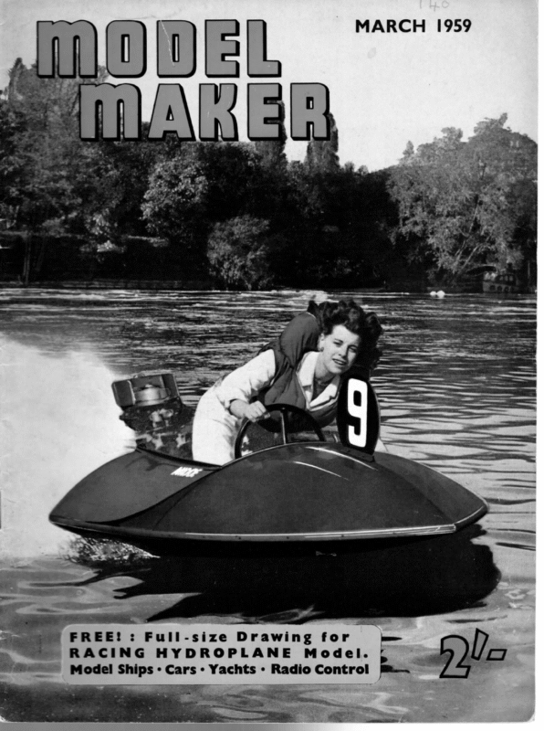 MARCH 1959 FREE! : Full-size Drawing for RACING HYDROPLANE Model. Model Ships – Cars – Yachts – Radio Control Author C. S. Gould Sho ws what can be done to restore an old yacht to the active list, and conclu des by wondering Just how many simila r hulls are gathering dust uncared for and forgotten, Readers may have oth er interesting experiences with refits like this and Model Maker invites the m to tell their Stories. – I ee, ee ~~ WEW LIFE FOR AN OLD 10 Wwe I was offered an old hull by an ex-naval friend I acce pted with alacrity . I was warned that it was dilapidated, and on collection realised that this was no understate- ment—the model was in very poor indeed although the hull appe ared sound. construction was unusual in that shape only The five 3/16in. mahogany plan ks had been used on each side, screwed to internal timbers with 00 screws. The friend ment ioned that it was his first encounter with a table of offsets, there being no Model Maker Plan s Service in those days! . Although not an experien ced yachtsman, I had seen and admired man y fine modern boats, and I decided to modernis e this one, which in any event deck up. would require rebuilding from the Enquiries indicated that it was built to the old champion 10-ra ter Daniels des X.P.D.N.C., which in its original employed a long bowsprit and enormous main om. New deck beams were fitte d, plus a new deck, and due to the proje cted change of sailplan, rule-of-thumb calc ulations that the mast should be move d back 4 in. (on trials this was found to be 4 in. too far). An alloy tube mast was installed with the usual wooden topmast, and new booms and fittings, —— Having seen the amount of water shipped through the hatch by som e models, I seated mine On valve rubber as in the sketch, retaining the hatch by a strong rubb er band which com- Presses the valve tubing One or two of my own maroon gunwales, and white Trials waterline; the original was intended for 36 in. She is only used for pleasure Sailin g, but has quite a pleasing performance. Due to lack of waters near home (Gillingha m, Kent) she is Sailed at various places and has puzzled quite a few people, many of whom are convinced she is a 6M. AS a passing thought, I wonder how many other good old hulls are lying about waiting for a new lease of life? PART SECTION OF HATCH ARRANGEMEN T on each gunwale for the main boom—this to DECK ‘ keep the deck as clear as possi ble. RUBBER BAND TO KEEL 140 deck. W.L., but correspondence since with — the designer reveals that she was best on 384 in. CYCLE VALVE RUBBER mercial vane gear was insta lled. a in nylon by (after much cajo ling!) the wife, but a professionally-made top suit in terylene has since been obtained. Bein g rather light (20 Ib.) she carries only 981 sqin. on a 41 in. ideas were incorporated as, for example, dis- pensing with a main horse and fitting a bowsie provides were first undertaken with a second suit made etc., made with the help of the M.M. Rigging and Fittings plan. and virtually watertight seal. Finish is powder blue with black waterline, MODEL Readers Write… The elegant little plastic wallet containing chrome vanadium double-ended B.A. A modelling are always read, for I consider that to call oneself a model maker one should take a passing interest in al] types. You should be congratulated for producing a very excellent magazine on so wide a subject. The pros and cons of plastic models are interesting. My point of view is this, plastics allow one to build excellen t models of one’s favourite car, boat or aeroplane in a much shorter time, thereby allowin g more time to concentrate on one Particular model. I am collecting my favourite vintage and veteran cars, and how nice it is having them in model form rather than in pictures . J. A. Briaes. St. Albans. YACHT FIN DESIGN Dear Sir, I would refer to Mr. R. H. Morrell’s article in the February issue re Model Yacht Design. I am sure many model yachtsm en like myself found Mr. Morrell’s summary and analysis (for that is what it was) very interesting. He is not the only one to have sought in vain for the commen ts of the *‘Designers’’? on_ this particular aspect of yacht design. One is led to wonder whether they have a theory that can be expound ed or whether they cautiously experim ent and observe and hope, and are naturall y reluctant to admit this as their method. There is one aspect Mr. Morrell over- looked or was unaware of on which I am prepared to as he was). steering has expound (kite flying perhaps It is the influence that vane had on fin and skeg design. One must realise that the vane steering gear was virtually unused in this country till after the last war and was adopted very reluctantly, until its capabilities “stood out a mile’, This change required, in fin and skeg design, a change from lateral planes of fin and skeg designed to stabilise a very powerful rudder operating force, to one in which the rudder Operating force was very weak, but capable of considerable accuracy in positioning, it being dependent on wind direction instead of wind force. This change is only of the order of 10 years of age, a very short period in the evolution of design and its documentation. The writer became very conscious of these factors when watching Triplane win the 10-Rater National in 1950. This design, of course, took things too far and made (1) lack of lateral resistance, and (2) too much forward resistan ce due to the relatively bulbous nature of the bottom of the fin. The new fin was designed with all these thoughts and observations in mind. It may approach the extreme for smallness but it is certainly effective. I would strongly controlled superhets on the market, but these POOL PERMUTATION Dear Sir, I would like to suggest the followi ng method for arranging an interes ting club event—an inter-team match of three teams each consisting of four boats. The event would occupy about the same time as an ordinary ten-boat event. Th