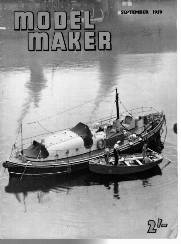 i MARBLEHEAD CHAMPIONSHIP Details extracted from the official report, photographs by W. A. Smeed Wwe only three points dividing the first five, this year’s Championship (Birkenhead, Whitsun) provided one of the closest finishes yet seen in a National event. Winds generally over the two and a half days favoured the light-weather boats. and were mainly from N.E. to N., giving semi-reach conditions for much of the race. Many re-sails were necessary because of the conditions, but nevertheless 30 ‘heats were sailed before the pre-arranged deadline was reached. Priest-designed Witches and Witchcrafts were numerous (at least eight) and did extremely well; Sue and Anne were Witchcrafts. Duck and Mithras designs (Gannet, Luvaduck, and Girl Pat, Trump, and Mithras) fared badly in the light wind conditions, Trump’s position being due solely to outstanding skippering. The Ballantine (U.S.A.)-designed Bacchus was one of three sliding rigs racing, and other competitors looked thoughtful about the effectiveness of this controversial rig. Only one sharpie appeared, Blue Mist, and this boat finished higher than two previous winners, Floreana and Tweedledee, both of whom like more wind. Once again the 1953 winner Foxtrot was well up in the hands of her designer, as was the well-known Gretel; seven the points Scottish behind boat the pleased the keen Scots. a race which the conditions, out on proved top. Yacht “Sur’’ “‘GRETEL’’ ‘‘FoxTrRoT’’ ‘“ANNE’’ “TRuMpP’’ 7 8 9 10 11 12 13, 14 15 16 17 18 19 20 21 I) 23 24 25 26 27 28 29 30 31 32 33. 34 “YACHABEL’? “SUSAN J’’ “‘ESTRELLE’’ “BAcCHUuS’’ “Ecuo IT’’ “SpERO’’ “Gicr’ “BLue Mist’’ “‘FLOREANA’’ ‘“BoLERO’’ “TWEEDLEDEE’? ‘‘CANASTA’’ “BLUE Boy’? “BLACK AJAx’’ ‘‘WeREWOLrF’’ ““GANNET’’ “LuvApUCK’’ “TaNntivy’’ “CrusaDER’’ “LewarRa’’ ‘“EcHo’’ ‘‘ATom’’ “Aricra’’ “Davey’’ “EpNa’”’ “Girt Pat’ “URsuLa’’ ‘‘MiTHRAs’’ 6 631 KS.2 319 763 955 1015 968 1187. 1182 564 1195 726 972 668 884 1166 947 935 1034 1173 1092 1013 1035 214 1162 1100 1117 1112 906 ‘“Comer’’ did which well, only must have matter what Altogether a fair result from again the best Posn. No. 1 1197 2 654 3 927 4 937 5S 1090 Yachabel winner, Heading picture shows Lewara leading from Girl Pat; above, Foxtrot and Susan ¥#. manage to keep full spinnakers despite a tricky wind. Below, highest placed heavyweight was Trump, here shown in company with Canasta that boats Skipper D. McIntyre R. Harris W.L. Grint R. Mackarel J. Pemberton P. Mustill no and skippers come Club Total Score Fleetwood 103 Bournville 101 Norfolk & Nwch. 101 Fleetwood 101 Birkenhead 100 Birkenhead T. Todd Glasgow D. Watts Birkenhead R. J. Burton Clapham K. Jones Birkenhead J. Graham Clapham K. Roberts —_ Birkenhead L. Maskell Bradford C. Dicks Clapham W.H. Jones Birkenhead G. Reeves Bournville M. Widdows Bournville R. Bonthrone Clapham S. Camm Birkenhead D. Britton Bournville G. Stobbs Doncaster J. Gorst Clapham J. Sixsmith Birkenhead R. Dunning Bury P. Hughes Llandudno D. Pearson Birkenhead W. Whittle Nth. Liverpool E. J. Blackshaw Birkenhead C.H.Elsom Clapham J. Elliott Bournville F. Hunsperger Nth. Liverpool G. Kelly Llandudno J. Whittle Nth. Liverpool L.G. Nason Clapham » 97 96 94 91 91 89 88 82 79 784 75 744 73 71 71 71 70 65 64 64 62 60 54 53 50 49 45 42 38 386 MODEL MAKER) RADIO2+ CONTROLLED YACHES | J. C.HOGG CONCLUDES A THREEPART ON SERIES THIS GROWING SPORT ae control system gives proportional steering and progressive (non-sequential) sail control. It has two relays only—one a normal type, the other a “‘Rotorelay”’. It needs no intergear batteries or relays. Fig. 4 is the circuit, which shows that both relays A and B are operated from the anode circuit of the last valve, one directly and one via the transistor “‘T’’. Before describing the action reference is made to the Rotorelay A, used for controlling the rudder servo. This operates rather in the same way.as a milliammeter, but instead of a pointer it has a contact arm. The contact arm will move strictly in accordance with the mark space signals being received (as would a milliammeter) and therefore in accordance with the “‘tiller’’ at the transmitter. The Rotorelay contacts are set close together and are electrically connected to the rudder servo motor and are also mechanically connected by means of a light rod to the lever or crank which operates the rudder itself, to give a feed back action to the contacts. So the rudder accurately and quickly follows the contact arm to whatever position it is moved by the tiller. The Rotorelay comprises a cylindrical magnet mounted on a vertical spindle which carries the contact arm. This turns inside a coil system. The relay can best be made out of a small Desyn indicator by adding a contact platform, contacts and contact arm. Only two of the three wires from the base of the Desyn are used— found by trial. Care should be taken to avoid sparking at the contacts by bridging them with a condenser and resistance in the usual way. I find that a small 25 mf electrolytic condenser and 10 ohms resistor is a suitable combination for this purpose. The other relay contacts have changes in polarity so that an electrolytic cannot be used. In this case they should be bridged with a 0-1 mfd and 40 ohms. Properly protected the contacts will go the whole season with cleaning. Without protection they will soon stick. This applies to most sensitive relays. While mark/space signals are being received the second relay B (a polarised E.D. type or similar) is held in, being fed via the condenser C and the transistor. If these pulses cease, either due to a full space or a full mark being sent, the relay drops out and feeds current to the winch servo S. A mark lets out the sheets and a space winds them in, the amoun