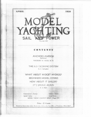 I I.( se–, ( t“ ‘\ Sfif¥ AUGusT. – sEPTEmBER i950 Copyright 1950 C 0 N T E`>N.®T S RACING SCHEDULES HOW TO SET .THEM UP KID STUFF-EDITORIAL •l-ed Houk MODEL SPEED BOAT NEWS B9b Graham SOME THOUGHTS ON “A” CLASS DESIGN WHAT ABOUT TLt,E 5c,c. wioDELS S. S. Rabl M. Y. R. A. A. CONVENTION SEATTLE, WASHINGTON, SEPTEMBER 3RD Phi,ip Barr ‘ aseRE=RE:=T ~J`-` -‘ _r. Editor’s Notes Club Notes Price 25 Cents Entered as Second-class matter March 31st,1948, at the Post Office at Providence, R. I. Hditor6ceL nobel ti ckf,.tt9 SAIL AND POWER..: ‘,, Seantioh of the M. Y. R. A. A., to be hllJ at Seattle, `September 3rd, on`.Qapf t’i“e very important issues to be .`consiflered by the delegates will be the matter oi” supporting this magazine in the futur,i`. `.-`.–.., All St’at.es Publishing riouse, Inc. /.Owhers an.d Publishers PHILIP BARR, Editor It has been a herculean tf.sk for the publishers to bring the publicat:on up to Associate Editors a high standard, and we feel that the past twelve months of sustained improvemeiit merits the confidence of . DR. T. W. HOUK everyone i.1tereste.d in model yachting. The field is small. The few stalwarts Sail : 6019 51st Ave., N. E. who sincerely have the sport at heart anid have clone their best to carry the Seattle, Washington .load, deserve =i`om the ran’c and Power: 6 North East Ave. Baltimore, Maryland back; MR. ROBERT GRAHAM 1,2e?s€;t|%g;,S#e;.t AUG -SEP.1950 • \ No 66 SUBSCRIPTION RATES Domestic, Foreign, One One ` If this magazine is to continue its advancement, very definite action must be taken by the fraternity as a whole through the various clubs, and this action must be maintained through the secretaries of the clubs. To rely upon individual members doing their part is, unf ortunately, impossible. Too many “laggarids” pad the club rosters. They Contributing Editor Vol. VI fill something more than a verbal pat on the JMR. S. S. RABL Year …………………… $2.00 Year …………………….. $2.50 demand the most and give the least. The Clubs are in the best position to get real results. Why not each club underwrite a minimum annual co.ntribution through ADVERTISING RATES t:ie M. Y. R. A. A., toward subsidizing (Effective March 1, 1950) •„ the growth of the magazine? Throug`h benefit functions of various types, the required annual contribution would easily be obtained. How much? If each club would undertake to raise annually the sum Of $25.00, the magazine would. grow by leaps and bounds. To disabuse the minds of those who may conclude that the publishers desire to make a ‘fortune out of the magazine, let it here be stated that no such thing is remotely possible in view of the costs 1 Page, Sin’gle Edition ……………… S?0.00 1 Page, 12 Editions ……….. Each 18.00 % Page, Single Edition ……………. 11.00 I/2 Page,12 Editions …….. Eachl0.00 1/4 Page, Single Edition ……………. 6.50 1/4 Page, 12 Editions ……. 5.75 Each All cuts extra unless supplied. by advertiser. •} Copy must reach our office by 25th each month f or next issue. Terms: Check with order. ` THE M. Y. R. A. A. CONVEN,TION SEATTLE, WASHINGTON, SEPT. 3R`D “\ ‘Duiing t`he ‘forthcoming annual con- Address all communications to MODEL YACHTING MAGAZINE 92 Douglas Ave., Providence 8, R. 1. of publication today, and further, that the publication would have ended last January if the publishers had’ not been good sports and carried the load them- =J±_ -J-,-_– -‘ —–` _. ____ 2J selves so that tile fraternity could enjoy its continuance. The time is at an end for “words of praise” to suffice in paying the bills. We have do:1e our part. The proof is available for anyone to see. Now its up to the rank and file, plus the good faith of the clubs, to do a little performing. The convent:on will be the time and place to insure d“finite and positive action. What this convention will do in the matter will govern the future of this magazine. And we’re not kidding. What each Club ought to have is a man of the calibre of the national president, who knows how to “apply the needle” to get results. Even the stout heart of Dr. Houk has not been sufficient to move a large number of “laggards” into action to support a wholesome cause. A` competent and energetic leadership is severe,ly handicapped by human barnacles who have the “gimmics.” Dr. Houk and his fellow-officers deserve bet- ter consideration in the future than they have received in the past from . . . not a few . . . but the whole fraternity. Finis. The Editor. Khut9s Stuff! By TED HOUK Many model yachtsmen suffer from an unnecessary fear that th` ir activity will be considered juvenile by the public. They go to great lengths to explain how costly their yachts are and how difficult to design and bqild. Thus they widen the gap betwieen the boy and the man, some•times too wide to bridge over. ‘` Let us examine the facts in other sports. Big league baseball is a far cry from the baby who rolls the ball back and f orth to Daddy on the parlor rug. Yet this baby play is the beginning of major league ball playing. Nowhere does baseball create a division between juvenile and adult activity, but rather the child advances by easy stages from the tot with his big rubber ball to the King of “The Seven Ages of Man” has often been paraphrazed to apply to specific areas of human endeavor. At the risk of being trite, may we suggest the “Seven Ages” of a Model Yachtsman: I. The baby in the bathtub, who pushes his bar of soap around, making fcrry boat noises the while. 11. The toddler who tows his toy yacht along the pond`side with a string. Ill. The Cub-age boy who whittles a sailboat from a shingle, mounts a paper sail, and turns her loose to the mercy of a friendly breeze. IV. The teem-aged lad with two or three-foot sloop, complete with keel and Marconi rig. Many hours he has laboriously worked on his rna,sterpiece, and now she is sailing 
