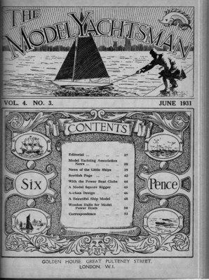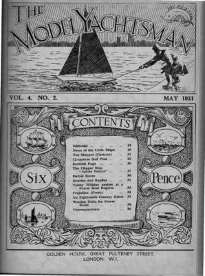 MDD[L YAEHTINE MAY-JUNE 1931 2© @©mfls a @©my iFw© ®©ELaEas a Fff©aEa NATIONAL CHAMPIONSHIP RACES WILL BE HELD AT LARCHMONT, NEW YORK June 29, July 1, 2 and 3,1931 UNDER THE AUSPICES LARCHMONT MODEL YACHT CLUB The winner of these races will represent the United States at Gosport, England, August 1, 3 and 4, 1931. c]C>lR]O^C^A]C>^O^G^rJC>lr.Or/9irJcr^O^4r` ODEL YACHT FITTIN::€:_,-~–qi: SPECIAL ALUMINUM ALLOY TURNBUCKLES Light as Aluminum, strong as Steel I inch take-up, 75 cents each. Brass. Same size, 35 cents each. Rigging cable, wire, screws, goosenecks, pulleys, steering gears, all of the latest type. WAMSUTTA SAIL CLOTH, 75c yard ARTHUR R. BROWN MELROSE HIGHLANDS, MASS. MODEL YACHTING AND qITHH; MODm;m9 clfz&®Hill A PRINT-CRAFT PUBLICATION FOR MODEL YACHTSMEN VOL. II. MAY-JUNE 1931 NO. 4 BUILDING A PLANKED MODEL-Part 11 By THE EDITOR Two typographical errors appeared in the April instalment of this article. First column, page three, second line should read:”hold stem piece firmly.” Next to last line, same page and column i”off our hull when completely planked.” Plate V. shows the building board dropped down from the position shown International Class A. .4#¢tt)cr, 69.25″ a.a.. 47″ w.I.. 32 lbs. lead. venience in building this particular model so readers may disregard them so far as these building instructions are concerned. Plate VI shows the backbone in place, Inolds squared up and ready for the sheer wales or clamps. Sheer clamps should be 1/4×3/8 in. ash or oak, these are to give us our deck shape and fasten our ribs to. The sheer clamps should be put in with the 3/8 in. 13.75″ beam, 10.50″ draft. 4| lbs. displacement, Designed and built by the editor as described in this series. in Plate IV, and ready for the back bop,e Square up aiid side parallel with the waterline plane. •The ribs `are mo.rtised into this clamp so plumb all your molds. Bc sure there aT+c no twists, fore and aft, in your bar“k- placing them tliis “’ay leaves more wood for your fastenings, 8/8 in. No. 0 brass screws. P:ate VII. shows this sheer clamp in place. Plate VIII. shows the “bow-end” of the building board with to be fastened in plo,ce. bone. I neglected to tell you that the u|)rights on No. 3, plate I., are brass tubes to take 1/4 inch brass rod for a detachable keel. I put these on for con- slot for deadwood left on stem piece as MODEL YACHTING PI.ATE V Building board in position to start work with molds in place. Note two forward molds are cut out in center and la*t one aft; also, these are left in to stiffen the hull. PLATE VI Backbone in place over molds. Molds should be carefully squared, as the correct shape of your hull de|)ends on these steps. PLATE VII Sheer clamp in place ready for the next step. The molds are set on six-inch centers. The black spots along the backbone are notches cut where our rib3 will come, making the ribs on three inch centers. MODEL YACHTING dcLscribed in the first instalment of this building series. Plate IX. shows the aft or stern end of building board. Note center lines on molds for lining up with center lines on building board. The small piece in the foreground is the transom, the square 3 IMPROVING THE PAPHR Mr. A. R. Brown, Dear Editor:Everywhere I go I am asked when is Brown coming out with the next issue of ]Iodeb Yachbing. W.ell, tliat sometimes is a hard question to answer. But before asking that question ask yourself, “How does he finance the magazine?” for it would cost, if he had to have the printing done, eeoo per month and with five hundred subscriptions at $2 a year you can soon figure out for yourselves. PLATE VIII block under it represents the sheer, or A-B measurement at th:s point. The two screws XX shown in Plate IV. go through the building board into this block of wood. These two plates (VIII. and IX.) give a good view of the two molds forward and one mold aft, with centers sawed out wh:ch are left permanently in the hull. If you want news, send it in. Each locality should have a page or two that someone in that pal.ticular locality should look out for, and in a shol.t time we “’ould have a real magazine. It is up to the clubs belonging to the Model Yacht Racing Association and Boys’ Clubs to send the news along. Now I suggest that each club belonging to the Association, and Boys’ Clubs send in a contribution of S15 a year to Editor Brown, we have fifteen clubs and ee25 would go a long way towards getting out a magaz:ne each month and with your co-operation about news, the subscr:ptior}s would increase and in the end the magazine would be sustaiiiing a nd maybe Brown would get a little more than a new dollar for an old one. Editor Brown is doing all he can to carry on, but one has to eat and live, and if yacfafi..ig had to give it up as they could not make it pay, well. Brown has got to be wizard if he can. But we want the magazine and I know there are model yachtsmen enough in the United States to support this paper. Get busy fellows and send in an extra subscription. Wc will have a magazine this month so get busy so we can have one every month. PLATE IX You can shorten the.giraffe’s neck with a saw, but you won’t have much of a giraffe left. You can alter the nature of man by sawing out parts of it, but you won’t have much of a man left. FREI) L. PIGEON. Never make a decision when you are downhearted. Never let the weak side of your nature take control. The physical wreck is usually up on the fighting dope. 4 MODEL YACHTING CHAMPIONSHIP RACES AT LARCHMONT Interest in model yacht racing has increased to such an extent in the I)ast thl.ee years that it is attracting the leading yachtsmen. Early this spring several experienced and most capable skippers of the Larchmont Yacht Club decided to take a hand and have spared neither time or expense to acquire the best to be had in model yachts. Com. Johnson of the Larchmont Club commissioned Chas. Lucke of Brooklyn to build an International Class-A m