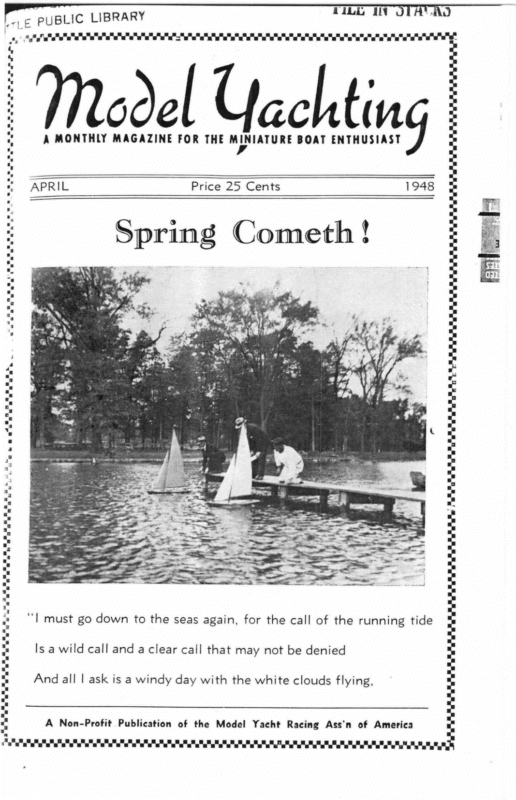 Price 25 Cents 1948 Spring Cotneth ? J :: ■ ■ ■ •• :: :■ .. ■ /’ a ;J ,· J • ~ • •ill :: := :ii =· :: :: ~~ •'” •• “I must go down to the seas again, for the call of the running tide :: _. Is a wild call and a clear call that may not be denied •• ~ And all I ask is a windy day with the white clouds flying, •• …. •• •• ~ • A Non-Profit Publication of the Model Yacht Racing A$s’n of America ··••■-■YN.-.■•■•■• ■.w.■•■• .. ..,.._._…….. , ..lvY … W.Yllrl’.Y.-.Y.• … -.,………………… ~ If for any unfortunate and unforse!:’. r: reason negotiations tor its manufactur~ should fail, the One-design might just ;i, well never had existed. The purpose of adopting this boat was to place into the hands of marine minded persons th~ requisites for enjoying model yachtin without much fuss and bother, and at~ reasonable price. Practically all contemporary contributors to “Model Yachting” seem to agree that a large majority of present day skip. pers have one and only one object in mind-speed and more speed to the exclussion of all other elements in design or good practice in ship building, and in appraising the one-design this majority continues to value it in terms of SPEED. Now, then,-the 50/800 one-design never u.:as intended to out-sail the unyachtlike contraptions we are now sailing as Class “M.” The reason-and a good one-why the one-design was incorporated into the 50/800 or “M” class, was to allow those who bought them to compete, if they so ‘desired, in that class, when not racing strictly in the “Helen J” one-design regattas. We have every reason to believe that the “Helen T’ class boat will be reason, ably fast, sea,worthy, and pleasing to watch. Nevertheless, those that have the best interests of model yachting at heart -are not interested in its speed-but in the enthusiasm-building possibilities inherent in this model. Let’s NOT talk “speed” when referring to this class, but rather “equality of opportunity.” We have no patience with those who say that we should have waited and canvassed the membership for the best boat available. That’s a lot of baloney, with the emphasis on the “bull.” Were that method adopted we would be forever trying to select a model. Remember the “Wampum”?!!! It would turn out like Bocaes the poet, that was presented a roll of worsted suiting by an admirer, with instructions to have Cont. on Page 11 ?11.~q,,~.t. .4~~4.fo19 MAIN OFFICE 71 CaIla Street, Providence 5, R. I. Freeman J. Santos, Publisher-Editor Miss Jeanne A. Santos, Associate Editor Leslie Gesback G. C. Gallagher Mid-West Western Founded MODEL in 1945 by H. Farley Official Publication of the YACHT RACING ASSOCIATION OF AMERICA Subscription, $2.00 Charles Rep. Rep. in U. S. and One Year, Canada: $2.50 Foreign All rights reserved. Nothing that appears in thts magazine may be reproduced. either whooly or in part, without written permission of the Editor acting for the MYRAA or from a contrib1ttor who reserves his rights. Make all Checks and Money Orders payable to “MODEL YACHTING” Vol. IV APRIL No. 38 FORE’N’AFT WHY THE ONE-DESIGN?!!! Ever since the “Helen J.” one-design was adopted discussion has run wild with few understanding just why the class was given to the sport. The 50/800 one-design came into ex, istance thru necessity-not thru fancy. Practically everyone interested in the sport knew that our periodic stagnation was due primarily to the fact that our present class boats were, because of con, stantly changing design and intricate craftsmanship, becoming more and more beyond the capabilities of the average hobbiest. We all realized that something had to be done to gather into the fold the thousands of prospective model yachtsmen that have in the past been frightened out of the sport; the manuf actured one-design was the only logical answer. 2 MODEL YACHTING DESERVEScoOo’t.’ttK’!s’c llROlH~\ Hon. F. C. Tansley \ 10 Jd ship and yacht building, design….. sailing, and racing, can today be than ever a fine recreation for .. l(·-·l 1.L. .. 1Ji\·iduals of all ages, and as a corn· ..•1unity activity can yield real benefits •’!re\.. • . •t or 1’ndirect. The cult has a lnn~.. ,. ,d honorable history, and we all know ·::.,ut the collections of ship models, old ;: ! new, very proudly acknow’. 1,,c in all that a wonderful craftsman, and an abiding world trad_ition well “·()rth preserving and extendmg. But u~t now we are thinking _most of the 1 -cive version of the same mterest-the ,l1.. d h yac ts ,l1..•tual sailincr :::, of these ships an , 111 town and park lakes. The model yachtsman, whether craftsm:tn or sailing man, knows full well the mental and bodily benefits he derives from following his fascinating sport, h\lhby, art, craft, science, or whatever he has made of it; but others, and even those in authority, are not always so :nlightened. When City residents, retired people, factory workers, and restless youth cry aloud for something to do, then model yachting has occasionally been :tllowed a meagre opportunity. Nevertidess we are sure that model-yachting :1.:; a sport and pastime has often been foraotten or misunderstood, and ;.., these hard days can even be displaced for the ·ake of short-range economies .. So model yachtsmen must be watchful and active and do all they can to sustain and increase their local activities on which the strength of the organized sport depends. In discussions it is important to em’)hasize the fact that the Association of ?vfodel Yacht Clubs, is a nation-wide fraternity of amateurs and is in no way a profit-making combination; we group ourselves with the artists. fine craftsmen. and amateur sportsmen of the nation. and in nowise with commercialized sport nr financial undertakings with profit as the motive. ;!,~ ,~ Some authorities do recognize that our sport deserves recognition, but in o