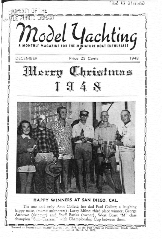 .,oQ u C OT- I ,7·r~ ~ ~ i:. · 1f -• , I V It I (..-=?<==>1>~<><==><><==><><=::><1-::==><><==>< 1 ;(,"f £ rU ,Lv ~ :..,10,, 1 U _.c1-c::::;.<><= ~ . DECEMBER ~ i.- __ • Price 25 Cents 1948 lmt¢r~v Qt{1Ji1"i~fm~~~ ~ ~ 1$48 ~ ~{ ~ ij ij ~ ~ ~ ~~ ij ij ~ ~ C - u ~ ij ij ~ ~ ij ij ij ij ~ ~ (l U ~ ~ HAPPY WINNERS ~ AT SAN DIEGO, CAL. The one :...::.. :: only -~_:-_-i Collett; her dad Paul Collett; a laughing happy mate, ( ::--==-=:e unk.:-_-_-xn);Larry Milne; third place winner; George Atthowe (sk::;:~~=-) anc ~/4:rr Banks (owner), West Coast "M" class champion "Sc:_ - -=::1rress --:"rh Championship Cup between them. 0 - ~ n U ~ ll><===>–<><===><><===><>~o~_–==::><.><==><><===><><===><><===><><===><><===><><===><><===> Entered as Second-c_;:;___._ :::<-tter :':fa.··-=- : :: .. 1948, at the Post Office at Providence. i.::-.. ::--;:=.':: .-=-.ctof ~larch 3d, 1879. Rhode Island, cords in his possession, he can with exactness ascertain, that at no Annual meeting have _the division delegates '.)Ut· numbered the voting power of the meeting. MAIN OFFICE The phrase "constitutional require71 Calla Street, Providence 5, R. I. ment" is most certainly an exagerated personal interpretation, suspiciously basEDITORIAL STAFF ed upon the assumption, or the desire to Publisher-Editor Freeman J. Santos. make the Ex. Com. a judicial body with Mi~s Jeanne :\. Santos. Associate Editor power to approve or revoke any piece 'Technical Editor Ains Ballantyne of legislation passed by the elected deleMid-West Rep. Leroy Gesback gates. A perfect example of the "tail" G. C. Gallagher Western Rep. wagging the "dog". It will indeed b~ a Founded in 1945 by Charles H. Farley sorry day for organized model yachting when we relinquish to the Ex. Commit, Official Publication of the ~U:DF.L YACHT RACING ASSOCIATION tee, or any other small group our God OF AMERICA given right to collectively govern our, Subscription. One· Year, selves. To even suggest such an organi$2.00 in U. S. and Canada: $2.50 Foreign zational arrangement, is to insult the All rights reserved. Nothing that appears in ;/a·.r intelligence of the membership, and its magaain,· may be rcprod11rrd. Eith,,,- w'·olly • or in part, withont writtc11 permission of t 1•e Editor acting ability to legislate for its own good. Look for the MYRAA or from a contributur who reserves around you and witness what this type hi.r rights. MR ke all Checks and Money Orders payable te of management has already done to "MODEL YACHTING" RUIN· the sport in some sections of the country. We must endeavor to the utVol. IV No. 46 most to uphold and safeguard the democratic way of life within our· organiza, tion and sport; to relax is to invite disWHO'S FOOLINC WHO? ! ! aster and chaos. In analyzing paragraph (j) tet us One of the most extravagant utterproceed upon a factual basis. First that ances yet advanced, is credited to one,::· the Ex; Committee only begins to fu~cof our present officers, to the effect :-hat , tion after the Annual Meeting upon the it is "a Constitutional requir~ment t-hc:t - date the new officers assume power the Ex. Committee pass on changes in (January 1st). second that it is the inracing and rating rules as a saf egu.ard tent of the Constitution that they exeagainst one Division dictating to an- cute first the mandates arrived at durother ", also "that an Annual meeting i3 in the Annual Meeting, and then prousually attended by members only in the ceed by either their own vote at :1 meetdivision in which it is held. Therefore ing or by mail without a meeting to act it is really more of a divisional meeting on their own as stipulate in paragraphs than a truly Annual meeting." (atom), which are rules laid down for Two dubious, if not strictly untrue their government during the periods be, statements, not substantiated by evi, tween Annual meetings or Specia.l meetdence. Out of 27 clubs in the organiza, ings, The said paragraphs (a to m) do tion, 22 were represented either ·by del- not in any sense curtail the deliberative egate or proxy. The five absentees were. powers of the delegates, regardless of ?Jl.q,e.~.l .4.r1:f.4Jf ~9 clubs in the division where the meeting was held. As this official has the past re2 their wording. Let us group this polemical article to- SEATTLE PU8llC LIBRA ~ gether for easier understanding:"The Ex. Co:nmittee shall manage the affairs of the Association subject to this Constitution and to the actions ta~en or decisions r'eached in Annual or Special meetings of the Association and ~hall auspices of the Boston Model Yacht Club. Six rounds of six bL~ts were sailed in the two days. The firs~ Jay the v-ind was S.W. to N.W. variable :ind very tricky about five to ten miles per hour. (a) hold a regular meeting as soon as The second day the wind was N.W. to convenient after the adjournment of the N.E. from three to eight miles per hour. Annual meeting and hold other meet, The first two rounds were sailed under ings . when called by the President, or 3 and 2 scoring and the last four rounds upon demand of two member.3 of tr.e 2 and 2 scoring. The variable wind made the sailing Committee; (j) formulate new sailing rules which must be ratified by a ma, the trickiest that this observer has seen jority poll vote, etc.". It will be readily seen from -.:heabove grouping, just what is the "intent" of the constitution. The delegates are given the power of formulating new legisla, tion and the Ex. Com. the mandate of executing those deliberations. From the above it is plainly evident that the Ex. Committee has no power to -change sailing rules except when on its own, and to further safeguard again.;;t arbitrary action the "ratification" clause is added, just as W. Hopkins intended it to be when he presented Par. (j) at the 194 5 Annual. The clause was intended as a check during the interim of the Annual meet, ings, otherwise it would have read, "all racing rules". I may not be a B. A., D. Lit., J. U. D., B. Litt., or Lit. D.-but even 