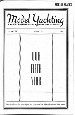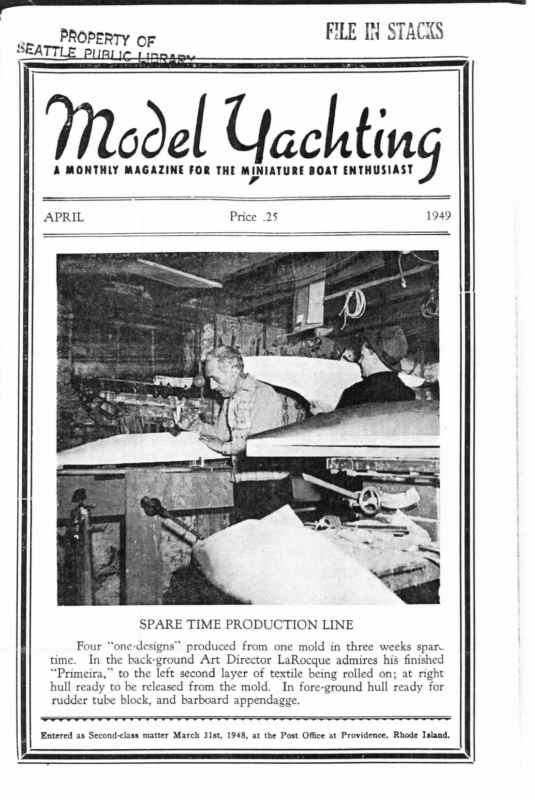 •. F!LE INSTACXS P~OP£t(TY OF SEATTLE:PliBllC Lf§BA\2′( WE APRIL 1949 Price .25 SPARE TIME PRODUCTION LINE Four “one-designs” produced from one mold in three weeks spar’-time. In the back-ground Art Director LaRocque admires his finished “Primeira,” to the left second layer of textile being rolled on; at right hull ready to be released from the mold. In fore-ground hull ready for rudder tube block, and barboard appendagge. • • • • • • • • • • ♦ • Entered as Second-class ♦ ♦ ♦ • • ♦ ♦ ♦ y • ♦ ♦ • • • ♦ • • • • • • • • • • • matter March 31st, 1948, at the Post Office at Providence. Rhode bland. the Annual Meeting, therefor we offer merely as a suggestion, that San Dieg- … and Seattle get together and exchange dates. It would be extremely dangerous at this time to further agravate matters some 24 years standing and a Constitutional requirement. We feel confident that this omission was an oversight and not intentional, and look forward with the hope that the situation will be amiably settled. ?Jlq,£,~J. .’5-Jff.~4.t!~9 MAIN OFFICE 71 Calla Street, Providence 5, R. I. EDITORIAL STAPP Publisher, EditoT Associate Editor Art Director Mid-\Vest Rep. Western Rep. Freeman J. Santos, Miss Jeanne A. Santos, A. LaRocque Leroy Geshac:k G. C. Gallagher Founded in 1945 by Charles H. FM!ey Official Publication of the MODEL YACHT RACING ASSOCIATION OF AMERICA $2.00 Subscription, One Year, in U. S. and Canada: $2.50 Foreign All f’ights f’eserved. Nothing that appears i,s thN 1naga1ine may be f’eprodured. Eithef’ ‘U.’holly or in tart, without writtc11 pef’mission of the Editor acti11, for the MYRAA or from a contributor who f’eservu lils f’tghts. Make all Checks nnd Money Ordera ~–~MODEL YACHTING” pa:,ahle te All articles , and photos submitted to this publication become the sole property of same, and none will be returned, unless previously agreed upon. News or scores previously appearing in ~ny periodical or news sheets will not be accepted for publication, except those clipped from a local daily. Vol. V-2 Annual APRIL No. 50 Meeting We noticed that the Executive Committee in alloting National Racing dates for 1949, did not take into conside,ration the 1949 Annual Meeting, which according to established procedure ia held at the same time, and place as a major International Race. Thia year the Pacific coast has that honor, and the loKical club to sponsor it should be San Diego, by virtue of being • alloted the National “X” daas race. However, July 4th is far too early for 2 1 I ( Welcome It is pleasing to note that the Nat’l Secretary has taken a step, which we believe ia in the right direction, by publishing in “Model Yachting” the business of the organization. We welcome him as a collaborator, and offer our complete cooperation. A Bt•oken ‘I I ! l Recot•d We think we have broken a record,_ by many years, for the continued publication of a model yachting magazine. The amount of work has been great and thankless, but if it serves a purpose, we are glad to continue. Thanks, Kid . . . We desire at this tim.e to express our gratitude and thanks to Charlie Farley for the spirit of sportsmanship he has shown and the magnificent cooperation he has given us in keeping alive this lusty child he conceived in March of 1945. As a symbol of his unrelenting and unselfish efforts in promoting the sport, may it continue forever. Great Britain It was decided at the A. G. M. of the M. Y. A. that the International Races for the “Y. M. Cup” (and attendant Trophies if arrangements can be made) be Raced for at Fleetwood, England on August 15th, 16th, and 17th, 1949. i i Log of the Secretary Your secretary is pleased to report on some unfinished business from 1948 with reference to the Sailing Rules for skiff sailing. He has received votes from sixteen clubs in good standing approving the revisionof the SkiffSailingRulesas ‘ I prepared by a committee of which W. D. Hopkins of the Deeper Hudsdon M. Y. C. was chairman. The new rules were approved by the delegates to the 1948 annual meeting, and have been unani, mously approved by the Executive Com, mittee of the M. Y. R. A. A. Since the majority of the clubs in good standing have approved the Skiff Sailing Rules prior to January 1, 1949, the Revised Skiff Sailing Rules are officiaf for the 1949 racing season. It is unfortunate that the sailing rules for pond sailing have not been revised. However, in order to make the rules available to the members desiring them, the Executive Committee of the M. Y. R. A. A. have approved the printing of two hundred copies of the existing sailing rules to, gether with all of the approved revisions. These should be available shortly from Mr. Gesbeck, 7345 South Blackstone Avenue, Chicago, 43, Illinois. The Secretary wishes to call to the attention of the various club officials the following two items: ( 1) If your club has not already paid its 1949 M. Y. R. A. A. dues, we would suggest that this matter be taken care of promptly in order to avoid any unnecessary confu, sion and misunderstanding later on in the season. (2) It is also suggested that wherever possible, registration for yachts be sent in by the club secretary m groups. C. A. Heisterkamp, Secretary 1 Cadillac i Club Archie Arroll reports that from pres, ent indications that the 1949 season will be one of the most successful in the his, tory of the club. Many new boats are being built, and some of the older ones are undergoing serious alteratipns. The new officers are Stanley War, wick, Commodore; John Chlubna, Vice; Herb Chandler, Sec’y,Treas., 3476 Auq, abon, Detroit, 24, Mich.; Will Robertson, Measurer. Some Changes Made On the Pacific coast, where there are more one-design major yachts than in any other section of the country, they have found it necessary, to save the sport, to limit the amount of equipment that shall be assigned to each boa