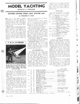 at MODEL YACHTING EDITED BY R. P. DEZENDORF HAS MODEL YACHTING “GONE WITH THE WIND”? By THEODORE W. HOUK ODEL yachtsmen everywhere have been gloomily prophesying a decline in model yachting since the start of the war. But a more optimistic viewpoint develops when one analyizes the situation. The war should bring a relative boom in model yachting. Already Uncle Sam is actively encouraging minor sports that draw many participants and few 3pectators. Physical fitness is being stressed as a patriotic duty, and outdoor activities such as model yacht racing are being emphasized. The spirit of “Carry on!” in civilian recreation has kept British countries at a state of high morale, and that spirit is rapidly spreading in America. Problems in civilian auto- mobile transportation will naturally increase city park and playground activ- ities as Sunday-driving diminishes. Since “hard times” mean good times for inexpensive hobby activities, the re- turn of large specialized groups in civil- ian and military life to relative poverty will encourage model yachting in these groups. Special regattas for soldiers and sailors on leave are already being planned by many clubs, in cooperation with military recreational organizations, are being constantly received from nations already at war. Typical of the attitude of gloom that has been affecting model yachtsmen are the laments of two outstanding skippers: “Guess it will be a tough year for the little ships!” “Tt looks at present as if for quite some time the sport of model yachting is definitely out!” For several issues, MopEL CRAFTSMAN had been devoid of yachting articles.Even the perenial “Crow’s Nest”, mimeo graphed _ publication of Warinanco kept actively interested by more wide- M.Y.C., Inc., was behind scheduie. The But the lull was only temporary. ly Government, by smiling benevolent upon outdoor sports that are not highls,y crowd commercialized nor attract huge is giving model yachting a big boost. How better can one keep in good trim physically than by racing model yachts?is A ten boat round on a regulation poolnce equivalent to 18 holes of golf in dista walked (or run!), to say nothing of the and publicity chairmen are being urged to report all races and club news in of the back, shoulders, forearms and thighs, as well as keeping the neck lim- local community clubs and service organ- izations. Military restriction of sailing waters for large yachts will cause many major yachtsmen to turn to miniature yachting. Discouraged club members with old and inferior model yachts are being spread use of handicap systems of racing. A new class, the Two-Meter is being widely boosted te stimulate new efforts in designing and building. Club secretaries the press, to elevate the morale of gloomy model yachtsmen throughout the country. Although building activities face a slump due to priorities on metals, yacht fans are entering cheerfully into the nation-wide game of discovering substitute materials. Model yachting activ- ity is definitely not at a standstill, as reports of building, designing and racing TRIM TRIO OF “FINLESS FIN-KEELS” beneficial effect on the waistline from stooping at least 18 times to tend your yacht. Skiff sailing develops the muscles ber as an owl’s. Medical science rec- ognizes the benefits of model yachting. Dr. Thewlis in his recent book, “Care of the Aged”, mentions model yacht building as an adjunct in the prevention of ist early old age. To the indoor hobbyway or craftsman: There is no better to tie your hobby into this nation wide campaign of physical fitness than to build a model racing yacht, and SAIL it—often. With rationing of tires and gasoline, a return to park strolling will be greatly sncreased. The week-end-tourist will become a trolley-strap-hanger, and head for the nearest city park. Naturally, the moving white sails will attract him and a new devotee to the sport will be born. True Sweetster, new Commodore of Berkeley M.Y.C. writes, “For your information, we (the model yachtsmen) are going to play a very important part in civilian morale when gas and tires get scarce.” Se Watch your pondside spectator crowds for new faces, especially for faces that light up with interest at the sight of trim tiny yachts realistically ploughing the waves. Keep a few of your old yachts in commission and invite inter- ested spectators to sail them, or to serve “2ST SIsie as mates. You will soon regain your membership lost to military service and the seven day working week. into Dr. Houk, designed to put a dash of toliferight, Here’s a piece of photography, sent to MC itby too easy during the past winter. Left you model yachtsmen who have been taking (see race model, the Marblehead “Klatawa’ Wilming these three “Finless Fin-Keel” boats are: V-Class built by A. R. Lassel, report in this issue of MC) and a “40-700.” The trim trio was —start ‘em sailing, and keep “em ton, Calif. Better take 2 tip from Brother Lassel,is skippers practically with us. that way! The 1942 Season It has often been said that racing miniature yachts is a “Depression sport”. Model yachting grew rapidly with the last depression to reach its zenith in 1936 to 1938. In recent years, with money freely circulating, a distinct falling-off was noticed, in number of entries at races, yachts registered, and clubs affiliated with the Model Yacht Racing Association of America. War times breed depression of a different sort, and create special depression groups. First, (Continued on page 43) Tue MopeL CraFrsMAN MODEL YACHTING (Continued from page 34) Hold ice station operators, workers dealers and manufacturers in rubber, silk, house- steel the heat conductivity of iron and . . . three times the wearing quality This . and only one-third the weight. Commotor tips the scales at 434 ounces. pletely built and block-tested in America’s When plant. motor largest miniature you’re looking for speed, look for a Rogers- 35