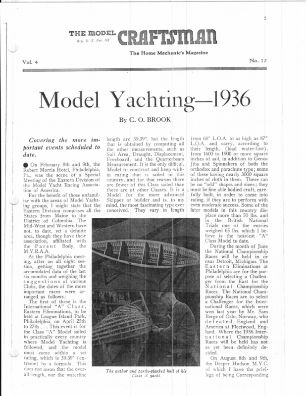THE MODEL ZZ Reg. U. S. Pat. OF. The Home Mechanic’s Magazine No. 12 Vol. 4 Model Yachtinge—1936 By C. O. BROOK Covering the more im- portant events scheduled to date. @ On February 8th and 9th, the Robert Morris Hotel, Philadelphia, Pa., was the scene of a Special Meeting of the Eastern Division of the Model Yacht Racing Association of America. For the benefit of those unfamiliar with the areas of Model Yachting groups, I might state that the Eastern Division comprises all the States from Maine to the from 68” L.O.A. to as high as 87” length are 39.39”, but the length L.O.A. and carry, according to that is obtained by computing all their length, (load water-line), the other measurements, such as from 1600 to 1900 or more square Sail Area, Draught, Displacement, inches of sail, in addition to Genoa Freeboard, and the Quarterbeam Jibs and Spinnakers of both the Measurement. It is the only difficul: orthodox and parachute type; some Model to construct and keep withof these having nearly 3000 square in rating that is sailed in this inches of cloth in them. There can country, and for that reason there be no “odd” shapes and sizes; they are fewer of this Class sailed than there are of other Classes. It is a , must be fine able bodied craft, carefully built, in order to come into Model for the more advanced rating, if they are to perform with Skipper or builder and is, to my even moderate success. Some of the mind, the most fascinating type ever later models in this country disconceived. They vary in length place more than 50 lbs. and in the British National Trials one of the entries District of Columbia. The Mid-West and Western have not, to date, set a definite area, though they have their association, affiliated with the Parent Body, the M.Y.R.A.A. At the Philadelphia meeting, after an all weighed 65 lbs. which I believe is the heaviest “A” Class Model to date. During the month of June the National Championship Races will be held in or night ses- near Detroit, Michigan. The sion, getting together the accumulated data of the last six months and weighing the suggestions of various Clubs, the dates of the more important races were ar- Eastern Eliminations at Philadelphia are for the purpose of selecting a Challen- ranged as follows: pionship Races are to select ger from the East for the National Championship Races. The National Cham- The first of these is the International “A” Class, Eastern Eliminations, to be held at League Island Park, Philadelphia, on April 25th to 27th .. . This event is for the Class “A” Model sailed in practically every country where Model Yachting is followed, and the model a Challenger for the International Races, which were won last year by Mr. Sam must cided. come within a_ Berge of Oslo, Norway, who defeated England and America at Fleetwood, England. Where the 1936 International set rating, which is 39.39” (extreme) by a formula. On August 8th does not mean that the over- and 9th, the Deeper Hudson M.Y.C. This all length, nor the waterline Championship Races will be held has not as yet been definitely de- The author and parily-planked hull of his Class A yacht. of which [ have the privi- lege of being Corresponding 6 TH E Secretary, will hold their 4th Annual Regatta for the 50-800 Class Model. This race is the outstanding social event of the year, and might MODEL CRAFTSMAN be likened to Marblehead Week son M.Y.C. watch the highway, and wait at their lake at Hampton Manor, Rensselaer, N. Y., from early Friday evening until the last guest arrives on Saturday. All dur- to bring the Model Yachtsmen to- who might have experienced diff- among the bigger craft. It was originated in 1933, the desire being gether for two days of racing and good times. Every heat is seriously and keenly sailed; each Skipper, whether of Host Club or guest, does his utmost to “bring home the bacon” and win the best of the TroAt this event you phies offered. find the real Model Yachtsman and the members of his family. Keen racing, good food, dancing, music, impromptu meetings and little or no sleep mark this gala two-day event. The members of the Deeper Hud- a ing the night a small group will be found watching for their friends culty in reaching the lake, and it is our proud boast that our friends in other Clubs are legion, just as each of these have reason to know that nowhere on earth will they find more enthusiastic or loyal friends. On September 5th-6th, at Red Bank, N. J., there will be the now famous “Heisler Cup” Race. This Cup was donated by the present Commodore of the Deeper Hudson M.Y.C., Mr. C. Heisler. In draw- gt Mees, b ing up the Deed of Gift, I doubt if Mr. Heisler could have imagined what a historical document he was phrasing. In brief, the Cup is open to any Club member whose Club is affiliated with the Model Yacht Racing Association of America, but must be raced for in the Eastern area. It is an extremely attractive trophy standing 34” high to the top cf the ship’s mast that adorns the cover. The face of the cup is engraved with a picture of a Model, and the wording “Deeper Hudson M.Y.C. 50-800 Class Trophy.” Each year some lucky winner has his name and the Club engraved on it. The Cup must be won three times to become any individual’s property, though not consecutively. The first year it was won by Walter Rayburn of the Staten Island M.Y.C. which brought the 1934 event to that Club. That year if was won by Franklin Anderson of the Red Bank M.Y.C. (N. J.) and last year the race was at that place, and something happened that was believed impossible, for, out of a field of 54 contestants, Franklin Anderson again won the cup, giving him 2 legs on it. This year’s race promises to be the hardest fought contest ever sailed in any event, large or small, because the Red Bank Skipper is determined to win the cup and get it out of circulation, while more than 100 Model Yachtsmen from other Clubs are just as determined that the Cup must 