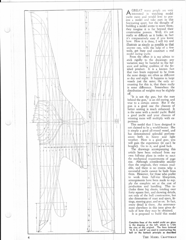 GREAT many people are very interested in watching model yacht races and would love to pos- sess a model and take part in this fascinating sport, but the thought of building a model seems to scare them; they imagine it is far beyond their constructive powers. Well, it’s not really so difficult as it looks; in fact it’s comparatively easy if you know how. How it is done, I will try and illustrate as simply as possible so that anyone can, with the help of a few tools, get busy and construct a real model racing yacht. From the offset it is my advice to stick rigidly to the drawings; any variation may be harmful to the balance and sailing qualities of the finished product. It is a known fact that two boats supposed to be from the same design are often as different as day and night. It happens in large vessels just the same; the only accounting for this is, that there really is some difference. Somewhere the distribution of weights may be slightly off. “It is not the gun, but the man behind the gun,” is an old saying, and true to a certain extent. But if the gun is a good one the chances of better scoring is much enhanced. It is the same with a model yacht. Build a good yacht and your chances of winning races will multiply with experience. This model that I have designed is not claimed to be a world-beater. She is simply a good all-round vessel, and has demonstrated splendid perform- ances both in heavy and_ light weather. Here is a good gun; you will gain the experience (it can’t be bought). Go to it, and good luck. The drawings accompanying this article have been reduced from my own full-size plans in order to meet the mechanical requirements of page size. Although considerably smaller than the originals, they remain readable, and there is no reason why a successful yacht cannot be built from \ \ aie { = them. However, for those who prefer to work from full-size blueprints, arrangements have been made to supply the complete set at the cost of production and handling. This includes three big sheets, totaling over forty square feet, and showing details, not only of the hull construction, but also dimensions of mast and spars, fittings, steering gear, and so on. In fact, every detail is there. An announcement elsewhere in this issue gives details of how they may be obtained. It is proposed to build this model ae 4 be 4 | \ j ee 2 Se kK NY || a Complete lines of the model yacht are given in the drawing at the left, which is 1/5th the size of the original. The lines lettered “A, B, C, and D” are used in constructing the hull on the buttock principle as described Tue Mopet CraFTsMAN : BLACK WATCH very e “= i” Staten Island Model Yacht Club on what is called the “buttock system” rather than the ordinary B. tee “bread and butter’ method, because in this system of construc: 90 Eon tion there is considerable saving in labor and material. ! bal. produces a stronger job by virtue of the fact that larger gluing give a clear conception of the vessel’s shape. From this drawing ree it will be noted that a fairly broad stern is called for, and as S. from 5 erent — expected this broad stern has helped considerably when running down the wind. Having a clean underbody, the broad stern does not impair her other sailing ; 7; qualities. I ato E The buttock lines are clearly indicated by letters the ° . ° of the alphabet.” They represent the shape the hull tightly would take if the completed model were held ver- 7 ng, and tically and cut into strips parallel to the center line. ; So that no difficulty will be encountered in cutting templates of the buttocks, I Bef the have prepared separate drawings of them. ces of If you get the full-size blueprint, you Bed It simply take this print and prick or trace E. Build through onto thick paper or cardboard a: bth ex- all the lines shown on the buttock templates B1, B2, B3, B4 and B§, all clearly : indicated ened j 3 erformlicht i j and ; you 8 can’t be duck. § a g this om my —_ of page corners are chiseled off smoothly to dotted lines a i t from Tf] Lf etfnetecesuen| clan \\ i =cost of oan fINISHED HULL |1lAmpine cle[fest7 Clare | < a - Down To Line. Tug | ie pat aa = at , 467 Ps momaam 5 details, 4 : fon, but pars, fit- | “In fact, Semoec Cr Line ALL Round — ‘ ! H ae Bot har | Zt WY ae _— Lee 7 i Suepius Mareaial cur Away ee Se THWARTSHIP i C SHCoyT “| SECTION THRO. STATION “S — ware given sis 1/5th s lettered | : i a Sr. ? Beijoc « A Berrece : ; A 7 Ce Wat ‘ Zives deained. ; Lf Le } mounce- acting the described -/ aorreer oes Sb: u! amen | \ P View for location // BS “> Lest _ BEAMS See StroNc FeAN THWARTSHIP li Cut Seumpos matemial | — © ut S10 $——H+4} TecetHs SN pe) A OT perce “Ss ayre ee AY Ss Saw Coy Fell ee Clean yo Oemenen Line over al t Glveme Sumpace| | S|1 BS ‘his in- wy tessiome Final Firat – ——__}+—_ Slamm Tocener Firs} ami – a to sup- [ets = eo 7 Final Clargming Sacon® Stace. _ heprints, ; To \ \‘ —&S 4 Beste 22 Ose ro ‘ a Py mg & qj nile ae] 36 of Cunwale : 0 prefer thick gluing surface than the usual “bread and butter” method. After the glue is thoroughly hard, the ‘ h The how the buttocks are glued together to form i read- the drawing. the general shape. This construction gives more { ssmaller on A thwartship section of the hull, which shows She sel, / It also surfaces are developed. A careful study of the lines plan will “ fin- J craft looks when afloat By John B. Duncan and few good idea of how the A 50-800 MODEL YACHT | ‘ This sketch of the completed yacht gives a — CAMBER Of STRONG BEAMS “ FOR OTHER SECTIONS TH paper or cardboard you have made this impression on is cut with a sharp tool (an old razor blade will do) exactly to the line. Also, be careful to mark the load water line (l-w.l.) and the line of stations No. 3, 5, and of the clamps hanging on the wood are supported; you may twist the wood out of shape otherwise. 7 on each of these moulds. Cutti