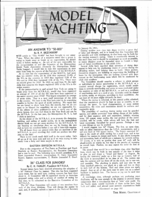 [ sot ULI | | Tree PUTTER AT TTTTneree PETETITT Taree “TT Te finish in keeping with the antique nature of the cups, When it was found that the black lettering did not stand out sufficiently, the problem was solved by rub- EDITED BY R. P. DEZENDORF SOLVING THE TROPHY PROBLEM By Dr. 1. W. HOUK bing white lead into the grooves formed by the electric needle. This gave a decidedly rustic effect. Comic consolation prizes for last places were made One cup was assembled by taking two gelatin molds, T= provision of suitable trophies for second and third places in model yacht regattas does much to ensure the success of thes: events. Many of the skip- the smaller of which was placed upside down for a base. An ordinary spool was used for the stand, with for years without ever having had possession of a trophy. At the end of our 1938 racing season, it was of aluminum were shaped to represent handles and riveted to the sides of the cup proper. The “engrav- pers in the Pacific Northwest clubs have been sailing found that all of the A-class cups but one in the asso- ciation were held by Mr. Simpson of Bellingham, and all of our 50/800-class cups were held by Mr. Clark of Vancouver. It was felt that if second and third place trophies were provided in the three mair a bolt placed through and through, uniting the gelatin molds and the spool in one firm unit. ing’ was done by painting on the lettering with lacquer and a fine brush. Another last place prize was made funnel. through tin cup, of these skippers woulc have the opportunity of possessing a cup for ai least a year. The Seattle Model Yacht Club was however, faced by considerable limitation of funds. One of us found a of silver and pewter cups, goblets, and sugar bowls in a second hand store and purchased tip cup and two aluminum handles attached. A wooden bound copy of Here are some of the gag trophies as described in this article by Dr. Houk. You can easily imagine the fun of awarding or receiving one of these trophies. They’re equally fitting, too, for miniature car races, powerboat contests and other sports. Some of the cups were badly bent and cor- roded. After carefully rernoving the dents in the cups, they were introduced to a polishing wheel with plenty of polishing compound. A piece of kiln-dried Eastern maple, 2” thick, was selected. One surface was smoothed. Circles of suitable size were drawn on it with a compass and cut out with a band saw. These were then turned over to two members of the club who owned lathes, and bases were turned out in harmony with the designs of the cups. Retention of the cups to the bases was done by undercutting the top edges of the bases slightly, and gently tapping the bottom edges of the cups into the undercuts. To save on engraving, one of us used his surgical electro-cautery outfit with an electric needle and burned the letters on the bases. varnished. Several March, 1941 of them “How to Sail Your Model Yacht” served as a them at a ridiculously low figure. from a tin cup and A bolt was placed the bottom of the down through the spout of the inverted funnel, thus holding the point of the funnel tightly to the bottom of the tin cup. The regular handle was then removed from the events of the Labor Day regattas at Seattle, many number Narrow strips The bases were then were given a dark red last place trophy in the Marblehead class. The cover was made of plywood. Leather, held in place with upholstery tacks, provided hinges. The book was bound between the covers loose-leaf fashion with a leather thong placed through several holes in the plywood. The inscription and a picture of a sail boat were burned on the cover with an electro-cautery needle. cover was then given a coat of shellac. The whole In addition to the trophies, ribbons for first, second, third, and fourth places, to be retained permanently, were given. The printing for these ribbons was first carved on linoleum blocks with the words ‘“A-class,” “30-800 class,” “First,” “Second,” etc., interchangeable. The bases of the linoleum blocks were grooved so that they could fit into an improvised printer’s stick. Ordinary printers’ ink was then placed on a piece of glass, rolled out flat with a small roller, the ink trans- ferred to the linoleum blocks from the roller, and the done with direct pressure on the ribbons. (Continued on page 54) printing 43 boys Inasmuch as we now have three groups of adults interested in building and rac- credit, ing three different objects, it has been but I’m again sayin’ that they should be proposed, and sketches to this effect have been submitted, for a combined space at eA shouldn’t who it a a oe about Py few a) Miniature 1.2 SBS —- 89 P-P. SS ee Se C COPY OF 9D yp? Fonfes ’ FABER Every Item! | —iwdieibeiad # – # i ‘Gorneriby fuelthed she orncrib, gs vator, oished, aoa hog ele- HI-BALL u e race some thing, bring why out a year Why, for can’t their it been Now, if you appear to be one of the regulars, out of a solid block of year. Where’s the fun in P.S. This column is open to anybody that has anthing to say, pro or con on I hear that at Oakland they allowed the boys to take as many warra-up laps as they wanted. Rumor was that one ganization warm-ups the before big 834×11” pages of bargains. Over tivo thousand items described and priced, and all carried IN STOCK for immediate delive ry they $4.95 Also, National rules state can enter more than one car I’m not first cable national ever (?) California held, so up to the sunshine. big All parts planes, Needed. Average min, Send only . GHQ 54 C.0.D, same literature MOTORS—Dept. or K-40 guaranteed. midget finished. Only day. 6c E. cars, a atc. For All Screwdriver for 21 for Jumbo 8t., FREE cat log. Mow vision west of M.Y.R.A.A.; Model Yacht Pacific Racing NorthAssoc.; Championship Regatta; Regatta; 1938; 1939; Seattle; Bellingham; Vancouver ; Harrison Lk.; Silver Lk.; Everett ; two go at the bottom of the ribbons. the | a