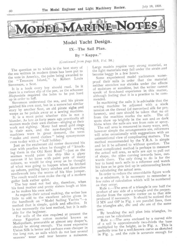 60 ew. The Model Engineer and Light Machinery Revi July 19, 1928. Model Yacht Design. 1X—The Sail Plan. By ‘‘ Kappa.” (Continued from page 515, Vol. 58.) strong material, as Large models require very r the strain and unde fail may s rial the light mate s. hour few a become baggy in yachtsmen waterSome experienced model that the material Isla in order sails the ‘Treasaure their f proo r the effects unde nks Scot. shri nor ches Stevenson, stret er neith should read. In it the writer cannot but , hine suns or ture It is a book every ofboy mois of pen, as the schooner || speak of first-hand experience in this matter, there is a curious slip thethehelm be comto be put hard ired although feeling that it is a practice to Hispaniala requ d. mende up in order to luff. and his pirate is advisable that the Stevenson understoodbutthein sea, In machining the sails it sted with a slack a somewhat similar , adju be ine mach ng patched his own coat sewi and s sigh te silk for prepira ed old eris an , merc (of Scot ad her thre anot the by on y ion stor tens ine. mach ng that no oil n sewi a take at be y ld awa shou ls peda care he and as , s nce) weep fere not a is The oil this . sails her the whet s t mark poin ine t moo mach a the is It from in the sun and as dark y years ago practically all y of which is the best stor The question as to ern to put been has s time mod in ten writ the sea to ded awar g bein palm the ica, Amer in the vote nd,” by Robert Louis | plunder. As latetheiasr fort ng at their own Gothes—singi seamen made gold rings l smal had y Man ing. sigh not k wor sewing led fang newthe and , ears r thei in in great demand, the term machines were hes ” being synonymous ‘make and mend clot holiday.” half “ a with ay even to-d his rated t old coster deco Just as the exuberan kof ght thou he n whe lies coat with pearthe Old Kent Road ’’—just“ knoc the as ing them in like a gipsy paint his ship pots seaman would loos of many t pain with e caravan if let d he sing away as he thought colours, SO woul g to happen when he fetched of what was goin decorative ing fancy stitofcheshisand up ashore, putt jumper. blue ms sea the needlework into even make the rig of a modern The result woulder quiet. golfer look rath when The boy need not feel shy, therefore, him his fond mother and pretty sisters laugh at . as he makes his own sailsmaki ng, the writer has al As regards their actuexce n in llent advice give jittle to add toonthe‘‘ Mod el Sailing Yachts ’—aIt the handbook le, quick and effective. method that isilysimp the best method, but it is suitis not necessarbegi nner. able for the ent the size required at pres For sails of the cott wn as kno rial mate on tian Egyp p chea er’s, drap any st almo at le urab proc am, poll Mado nsive expe more The gh. enou ng stro be ld shou in perhaps even cheaperral Union Silk is better andwhic seve last not do h sails as run, long the tear become a nuisance. seasons’ wear and spots show up brightly wet from rain or spray. blobs when the sails areured and, in many ways,rmer meas is area sail The s refo are, ents ngem arra the le simp ver howe an with ons esti sugg with ly ional occas arise will licating matters. The unintentional view of comp le the Y.R.A. is simp by ded mmen method reco red to with The . tion ques out and let it be adhe is perhaps to measure most complicated methodsails are apt to pull out the actual sail area, as inwards here, outof shape, the sides curving to do is for the wards there. The onlytothing h boy to hand such sails a reformer and watc tied up in uninteresting knots his face as he gets actua l area. in calculating the unavoidable figure worka In order to reduce thenece ssary to remember to a minimum, it is n whic h will be numbered few rules of calculatio triangle is one half the Rule 1.—The area of a trian gle and the perpena of side any of uct prod er on to that side dicular from the oppositeIt corn ld be noticed that shou sary. neces if uced prod lel lines, then paral are 1 Fig. in OP and MN if of the same are ebc and dbc abc, gles trian the By breaking the sail plan into triangles, its area can be calculated. by a curved side Rule 2.—The area encloy sed hirds the base two-t atel oxim appr of a sail is 2. This is Fig. in as t, heigh the multiplied by sketched as e curv wn -kno well a for perfectly true for in Fig. 3, and the rule is accurate enough as they occur. area. July 19, 1928. The Model Engineer the curves dealt with in actual practice, and Light Machinery which may differ from it slightly. The Y.R.A. measures and marks the spars at A, B and C for the mainsail and E, F and D for the fore triangle, as in Fig. 4. It then fixes the area of the head sails at 85 per cent. of the deduct ro per cent. of the fore triangle and then half of this (5 per cent.), a matter of subtracti on only. M yachtsmen have x T experienced a e Io X mast, N the 61 area of the mainsail is . 125 sq: ins; 2 | triangle—a normal proportion. To calculate this percentage it is only necessary to model the 25 “TOF fore Several with Review. : Pe et 6G, The area of the fore triangle is — 2 71-5 sq. ins. Deduct 10 per cent. or 7.15 or sq. ins. Also deduct half this or 3.57 sq. ins. Then 85 per cent. of the fore triangle becomes 60.7 sq. ins. and the rated sail area 185.7 sq. ins. It is always better to over-estimate the sail area rather than under-estimate it, so make it 186 sq. ins., and it is desired to redraw it at 800 sq. ins. From article V it will be remembered that lengths can only be compared with lengths, P&P b c Fig. 1.—Measurement of Area of Triangle. Se. Height ay —_— base —__—__——_—__> Fig. 2.—Measurement of Curved Edges of Sail. Fig. 4.—Sail Measurement. areas with areas, etc., and a length can. only be compared with the square root of an area, Fig. 3.—Measurement of Area having a Curved Side. difficulty in laying off a sail plan of a given area and a desired shape. A smart-looking sa