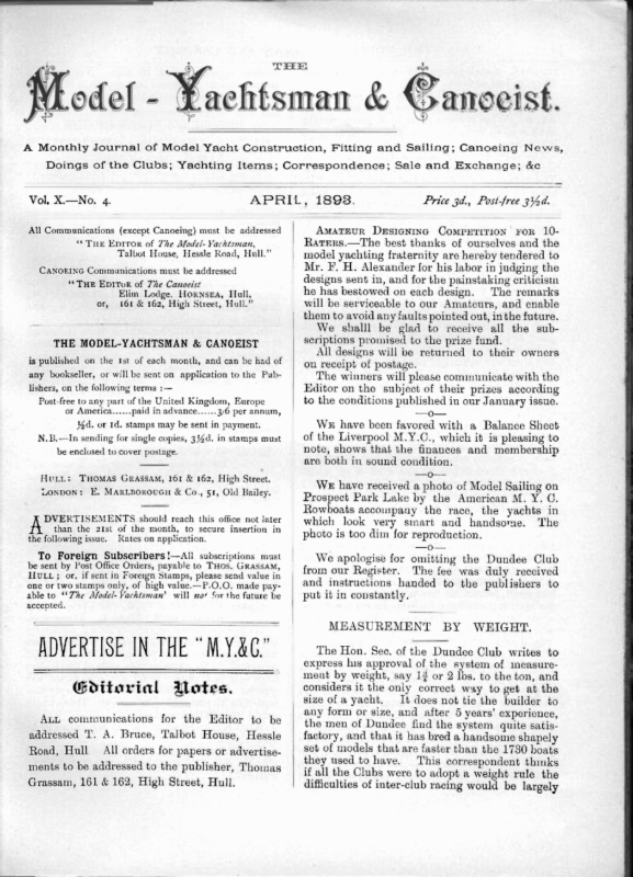 ——— ‘NG Communications must be addressed oo AMATEUR DeEsicNinc CoMPETITION FoR 10Raters.—The best thanks of ourselves and the model yachting fraternity are hereby tendered to Mr. I’. H. Alexander for histlabor in judging the designs sent in, and for the painstaking criticisin ‘THe Epitor of Zhe Canoetst Elim Lodge. HORNSEA, Hull, or, 161 & 162, High Street, Hull.” he has bestowed on each design. The remarks – will be serviceable to our Amateurs, and enable them to avoid any faults pointed out, inthe future. scriptions promised to the prizefund. ‘e to any part of the United Kingdom, Europe i America…… paid in advance…… 3/6 per annum, Yad. or 1d. stamps may be sent in payment. The winners will please communicate with the Editor on the subject of their prizes according to the conditions publishedin our January ii ssue. — (0 — We have been favored with a Balance Sheet In sending for single copies, 344d. in stamps must of the Liverpool M.Y.C., which it is pleasing to en are both iin sound condition. : . to cover postage. THOMAS GRASSAM, 161 & 162, High Street. on: E, MarLsoroucu & Co , $1, Old Bailey. note, shows that the finances and membership . ee WE have received a photo of Model Bailing on Prospect Park Lake by the American M. Y. C. Rowboats accompany the race, the yachts in which look very sinart and handsome… The photo is too dim for reproduction. rane imom ke. Y.R. mly A. lielde tiee put it in constantly. be Oe TBO oe a See o stam _ ‘The Model. Yachisman’ will not for the future be _ Se y Post Office Orders, payable to THOos. GRASSAM, or, if segt in Foreign Stamps, please send value in only, of high value.—P.O.O. made pay- – We apologise for omitting the Dundee Club from our Register. The fee was duly received and instructions handed ‘to’ the publishers to . »reign Subscribers !—All subscriptions must ee . RTISEMENTS should reach this office not later n the-21st of the month, to secure insertion in sing issue. Rates on application. AL Pub- ene EVES application to the All designs will be returned to their owners on receipt“of postage. DS NN BE HTCwae? seller, or will be sent on 1 the following terms :— arbor er ed on the rst of each month, and can be had of. bbuarn re MODEL-YACHTSMAN & CANOEIST rns @] We shalll be glad to receive ‘all the sub- Park a A. ©THE Epitor of Zhe Aodel- Yachtsman, Talbot Ilouse, Hessle Road, Hull.” SY ee ee ee ee \unications (except Canoeing) must be addressed Price 3¢., Post-free.3zd. ond | Bon ewes APRIL, 18938. —No. 4. ne ee ty em igs of the Clubs; Yachting Items; Correspondence; Sale and Exchange; &c So. a hly Journal of Model Yacht Construetion, Fitting and Sailing; Canoeing News, ee = en et ist. tt. > peer aeae odel – Yachtsman & MEASUREMENT BY WEIGHT. ERTISE IN THE © M.Y.&6.” Gditorial Uotes. communications for the Editor to be sed T. A. Bruce, Talbot House, Hessle Hull. All orders for papers or advertise- to be. addressed to the publisher, Thomas m, 161 & 162, High Street, Hull. The Hon. Sec. of the Dundee Club writes to express his approval of the system of measurement by weight, say 14 or 2 lbs. to the ton, and considers it the only correct way to get at the It does not tie the builder to size of a yacht. any form or size, and after 5 years’ experience, the men of Dundee ‘find the system quite satisfactory, and that it has bred a handsome shapel set of models that are faster than the 1730 boats. they used to have. This correspondent thinks . if all the Clubs were to adopt a weight rule the difficulties of inter-club racing would be largely t ips, be- THE MODEL-YACHTSMAN CLUB REGISTER. GOOLE,.—Tonnage—Y.R.A aud Handicap by Manchester Rule We shall be pleased to insert particulars of all ‘Clubs, and invite the Secrotarics to forward the necossary information any change in Names and Addresses, also, to notify Station—Raweliffe brick Ponds. J. S. Simpxon, 8, Albert-street. GATESHKAD.—Tonnage—Y.K.A. J. Wilson, 44, Whitehall Road. Station—Onatenhead Park GUERNSEY.—Tonnage—Y.R.A. Station—Model Yacht Pond J. BB. Randell, Allez-atreet. GREENOCK. —’Tonnaze—”94″ Rule. AMERICAN.—Lenpgth taken on I.w.1. Station—Prosnect Park, New York. It. McNair, Junr., 10,, Antiguastreet, Il. Melvin, 14!, Park Place, Brooklyn, U.S.A. BRADFORD MOOR.—1730 and length. Station. Bradford Moor Park, GRIMSBY.—Tonnage—Y.I. v9. Dudley Hill, Undercliff, Bradford. T. E. Barker, Station. —Exley:. Reservoir. Frizinghall. Lewix Crossley 15, Springfield Place, Manningham Lane, Bradford. BELFAST—Ulster.—Kule 1730. Station—W aterworks, Antrim Road W. H. MacKey, Adam-street. CENTENNIAL (New South Wales.)—Measurement from outside of ; also overall, astern to inside of rudder head J. M. Donaldson. 46, Roxe-street, 8S. Sydney, N.S.W DERDES —Weight. 1} Ibs. to 1 ton.—Station.—Stobsmuir Pond J. Cant, 60, Watson Terrace,’ lebe. Station—Alexandra GLASGOW. —Alexandra—”L. & S.A.” Rule. Park, Glasgow. W. Crawford, 181, Comely Park-street. NULL.—Kingston—Length taken on |.w.1.; also 10-ton clasr Y.R.A. Station—Club Lake, Inglemire Lane, Beverley Road. 3; R. Windsor, Bankside, Sculcontes, Club Lake, Chalk Lane. Albert—Tonnaye—Y.f.A. Hessle Rd. 8. L. Tucker, Belgrave Terrace, Rosamond St. Park, Station.—East rule, East Hull.—1730 B. P. Bell, 18, Gladstone Street. LONDON.—London.—15-rating class and 10-ton class Y.R.A. Station— Ronnd Pond. Kensington Gardens. Mr. Walter Greenhill, L.M.Y.C., Kensington Gardens, W Telegrams :—Bermudian, London Postal :—L. M. Y. C., Kensington Gardens. GOSPORT.—particulars wanted. HARRINGTON. -—Sailing Rules, Y.R A. Station- Harrington Reservoir. J. A. Young, Gas Works, Harrington, Cumb. JARROW & HEBBURN. —. Tonnage—Y.R.A. Station Hall Lake. G. Johnuon, 41, Caroline-strect, Jarrow-on-Tyne. Station—The Serpentine, 9.W. J. Spurgin, 89, Hans-road, Brompton, London, Corinthian.—10 and 15-tons 1730 Rule, alzo 10,