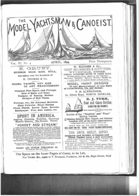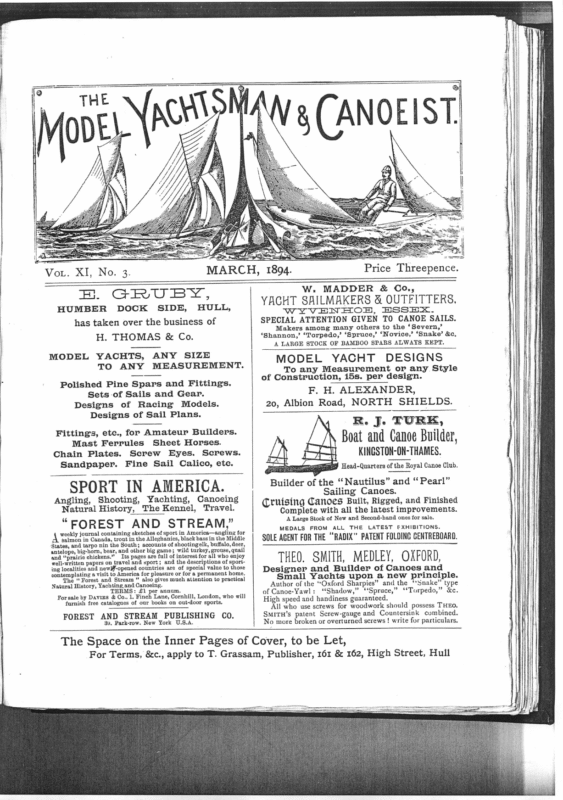 a ee Se he My a Ss Uni fe IE”: , tp by —L Sn A Ss DOCK SIDE, HULL, has taken over the business of H. THOMAS & Co. MODEL YACHTS, ANY SIZE TO ANY MEASUREMENT. Polished Pine Spars and Fittings. Sets of Sails and Gear. Designs of Racing Models. Designs of Sail Plans. WYVHNEHOH, SSH. SPECIAL ATTENTION GIVEN TO CANOE SAILS. Makers among many others to the ‘Severn,’ ‘Shannon,’ ‘Torpedo,’ ‘Spruce,’ ‘Novice,’ ‘Snake’ &, A LARGE STOCK OF BAMBOO SPARS ALWAYS KEPT. MODEL YACHT Angling, Shooting, Yachting, Canoeing Natural History, The Kennel, Travel. “FOREST AND STREAM,”g for Lice journal containing sketches of sport in America—anglin cA salmon in Canada, trout in the Alleghanies, black bass in the Middle States, and tarpo nin the South; accounts of shootingelk, buffalo, deer, antelope, big-horn, bear, and other big game; wild turkey, grouse, quail and “prairie chickens.” Its pages are full of interest for all who enjoy well-written papers on travel and sport; and the descriptions of sporting localities and newW-opened countries are of special value to those contemplating a visit to America for pleasure or for a permanent home. The “Forest and Stream ” also gives much attention to practical Natural History, Yachting and Canoeing. TERMS: £1 per annum. For sale by Davies & Co.. 1. Finch Lane, Cornhill, London, who will furnish free catalogues of our books on out-door sports. FOREST AND STREAM PUBLISHING CO. 39. Park-row. New York U.S.A. DESIGNS To any Measurement or any Style of Construction, 15s. per design. F, H. ALEXANDER, 20, Albion Road, NORTH SHIELDS. R. J. TURE, Fittings, ete., for Amateur Builders. Mast Ferrules Sheet Horses. Chain Plates. Serew Eyes. Screws. Sandpaper. Fine Sail Calico, ete. SPORT IN AMERICA. MADDER & Co., Boat and Canoe Builder, KINGSTON-ON-THAMES. =) Head-Quarters of the Royal Canoe Club. Builder of the “Nautilus” and ‘‘ Pearl” Sailing Canoes. Cruising Canoes Built, Rigged, and Finished Complete with all the latest improvements. A Large Stock of New and Second-hand ones for sale. MEDALS FROM ALL THE LATEST EXHIBITIONS. SOLE AGENT FOR THE “RADIX” PATENT FOLDING CENTREBOARD. THEO. SMITH, MEDLEY, OXFORD, Designer and Builder of Canoes and Small Yachts upon a new principle. Author of the “Oxford Sharpies” and the ‘*Snake” type of Canoe-Yawl: ‘‘Shadow,” ‘‘Spruce,” ‘‘Torpedo,” &c. High speed and handiness guaranteed. —— HUMBER W. YAGHT SAILMAKERS & OUTFITTERS, All who use screws for woodwork should possess THEO, SMITH’s patent Screw-gauge and Countersink combined. No more broken or overturned screws ! write for particulars. ——————— GRUBY, HE. Price Threepence. ARCH, 1894. Vor. XI, No. 3. The Space on the Inner Pages of Cover, to be Let, For Terms, &c., apply to T. Grassam, Publisher, 161 & 162, High Street, Hull dinate naga inten a Jf achtsman & © anoeisng Net.ws Model – and Sailing; Canoeige, &C g tin Fit , ion uct str Con ht Yac el Mod of l rna Jou y thl Mon A Sale and Exchan Doings of the Clubs; Yachting Items, Correspondence, —————— —— aaroeo———————— MARCH, 1894 Vol. XI.—No. 3. be addressed All Communications (except Canoeing) must Yachisman, l‘©THE Epiror of Zhee,Mode Talbot Hous Hessle Road, Hull.” d addresse CANOEING Communications must be etst Preaszs Nore.—The fee for constantderpub d ive unt amo lication is 5/- per annum, the ing our or, 161 & 162, High Street, Hull THE MODEL-YACHTSMAN & CANOEIST of h, and can be had is published on the Ist of eachonmont ication to the Pubappl sent be will any bookseller, or :— lishers, on the following terms part of the United Kingdom, Europe m, Post-free to any ica….-. paid in advance…… 3/6 per annu or Amer ent. yd. or Id. stamps may be sent in paym ps must N.B —In sending for single copies, 3744. in stam be enclosed to cover postage. h Street. HuLL: THOMAS GRASSAM, 161 & 162,51,Hig Bailey. Old Co*, LONDON: E. MARLBOROUGH & e not later ld reach this reofficinse ENTS shoumont DVERTISEM rtion in secu to h, the of than the 21st Rates on application. the following issue. criptions musM,t ibers 1—Ablelltosubs n Subser To Foreig SSA THO paya rs, Orde ce Offi Post by be sent; or, if sent in Foreign Stamps, pleaseS.sendGRAvalue in L HUL . made payue.—P.O.Othe , of high val stamps onlyYach one or twoZhe future be for no? will n’ tsma lMode ‘‘ to able 7 y KDVERTISE IN THE “ M.Y.&6.” Gditorial Botes. Editor to be ALL communications for the Hou sle addressed T. A. Bruce, Talboters orse,adveHes rtise- Road, Hull. All orders for pap lisher, Thomas ments to be addressed to the pubet, Hull. Gragsam, 161 & 162, High Stre . will send We shall feel obliged if Hon. Secsecti ons for us notification of any changes or corrthe Ann ual our Club Register, as soon as Meetings are over. “Tue EpiTor of Zhe CanoHORNSEA, Hull, Elim Lodge, .” accepted. Price 3d., Posi-free 31d. from this source being devoted to uphold journal. commenced business, Two New Criuss haveothe r at Cambeltown, the one at Swansea and from the ways just are h bot ; Argyllshire s and measurerule h wit out and not yet fitted some more —o—- e to give ments, &c., but we hopissu e. t nex information in our denied the possibilitie,s Tur newspapers havingAme for 1895 the rica CupWol of a Challenge for ds verton and en rav Dun Lor that now have it t. —_Oo— mean to challenge with a 7Oft. yach ore of the Manchester Mr. Jonn Hann, Commod 10-rater built, and will —_Oo— keel club is having a fin keel to be hoped that try her against the s,theItis club will have some of some of the members ng keels of the same rati to test her. ous wish of the Mr. G. Hate by the unae nim n for the coming agai Serpentine club takes offic being scarce he men d Goo Sec. . Hon year as a private dom free his has not been allowed may be sure as progress that We . long for member in hand d han go will club ne and the Serpenti —_—O— whilst 