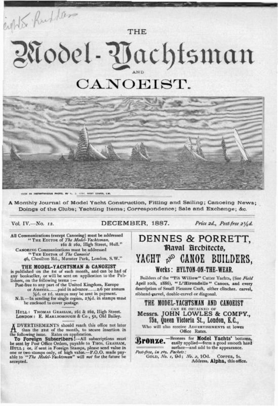 THE Alodel- VWachtsman AND CA NOHIS’T. “ROM AN INSTANTANEOUS PHOTO, BY %. 4. \ #¢ WEST COWES, I.W. A Monthly Journal of Model Yacht Construction, Fitting and Sailing; Canoeing News; Doings of the Clubs; Yachting Items; Correspondence; Sale and Exchange; &c. Vol. [V.—No. 12. DECEMBER, All Communications (except Canoeing) must be addressed y ‘¢ THe Epiror of 7he Model- Vachisman, 161 & 162, High Street, Hall.” THe Epiror of The Canoetst ae Raval Erchitects, Y ACHT p” () ANOK is published on the Ist of each month, and can be had of lishers, on the following terms :— Post-free to any part of the United Kingdom, Europe or America…… paid in advance…… 2,6 perannum ~ 44d. or Id. stamps may be sent in payment. N.B.—In sending for single copies, 24d. in stamps must Tuomas Grassam, 161 & 162, High Street. Lonpon: E, MARLBOROUGH & Co., 51, Old Bailey. AS Works @ HYLTON-ON-THE-WEAR., | April roth, 1886), “ L’Hirondelle*? Canoes, and every description of Small Pleasure Craft, either clincher, carvel, ribband-garvel, double-carvel or diagonal. THE MODEL-YACHTSMAN AND CANOEIST — CAN than the 2ist of the month, to secure insertion in Rates on application. To Foreign Subseribers !–All subscriptions must be sent by Post Office Orders, payable to THOs. GRASSAM, HULL; or, if sent in Foreign Stamps, please send value in one or two stamps only, of high value.—P.O,O. made payable to ‘“‘The Model-Vachisman” will mof for the future be aecepted. BE OBTAINED OF Messrs. JOHN LOWLES & COMPY., 15a, Queen Victoria St., London, E.C., DVERTISEMENTS should reach this office not later the following issue. BUILDE RS Builders of the “Tit Willow” Cutter Yachts, (See Field toe emolne bn eaneer poodtaipe Hutt: 4 ~ THE MODEL-YACHTSMAN & CANOEIST any bookseller, or will be sent on application to the Pub- Price 2d., Post-free 2d. ‘ = ‘ D E N N ES & PO RRETT CANOEING Communications must be addressed 46, Chesilton Rd., Munster Park, London, S.W.” 1887. Who will also receive ADVERTISEMENTS at lowes Office Rates, i= Rronze —Bronzes for Model Yachts’ bottoms, J) * easily applied—form a good smocth hard = surface—and add to the appearance. Post-free, in 102, Packets: GOLD, Ao. 1, Od; Me. 2,10d. CoppEr, 1s. Address, Alpha, this office. 178 THE MODEL-YACHTSMAN Forest & Stream (New York) Yachting Extra-1887. Containing illustrations, dimensions, etc., of Thistle and Volunteer, Mayflower and Galatea, Puritan and Genesta, ete., AND CANOEIST. strong wind and lumpy water, storm sails, going free, distance 367 yards, 3 trips were made occupying 6m. 355., 6m. 30s., and 6m. 57s. respectively. Second day :—Light breeze, big sails, running, distance 440 yds, 8m. 55s. and 9m. 35s. Going full, distance 205 yds., 3m. 458. Close hauled, Also interesting particulars of the America Cup. Price 8d. per copy, post free. Alf. Grassam, Stationer, 57, Porter-St., Hull, Eng. same distance, 3m. 57S. NOTICE.— Having again sold out all the copies ordered SAILING RULES OF THE Cowks MODEL YACHT CiLuB.—The Cowes Club sail their matches on the Agency for West’s Photos. ofall the ‘Crack’ Yachts. from New York, 1 am now booking for a fresh supply. Orders now waiting will be sent as soon as [ receive supply. Gditorial notes. CANOEIST.” IN response to the pressing necessity for more space 1n our journal, the publishers have decided to enlarge it by four pages: two pages for Model Yachting, and two pages for Canoeing; and the price will accordingly be raised to 3d. monthly, or post-free 3/6 per year. We feel sure that model- yachtsmen will not begrudge the extra penny, and that they will support us with even an increased friendship. ‘The change is for the common wel- fare, and in great part due to the many suggestions we have received that this alteration should be made, Our firmest stand has been made on keeping the price at such a moderate figure as to be within the reach of all, and we feel confident that so small an increase will not deprive us of a single friend, especially as our services are given free and without stint for the general benefit of the sport. Subscribers please note this change when sending your yearly subscriptions ! —lO— A CORRESPONDENT informs us there is a strong desire to form a club in the town of Deal. Surely if such is the case this strong desire should bear fruit. Look at the Register of the Model Yachtsman, ye model sailers of Deal, and blush for your pusilanimity, if ye cannot find the spirit to enrol yourselves under a proper title in that goodly list. WE are glad to hear our enthusiastic friends of Lowestoft have had a bit of model racing at last. The tide having filled an old ballast pit, gave them an opportunity of testing their boats, and Mr. Tansley and his son were both to the fore on that occasion, We wish you more luck of the same sort, good people of Lowestoft, and feel satisfied the water is the only thing wanted to bring out a strong club tn your town. —-Q— SpeeD Triats.—Mr. Tansley has made the following speed trials on the Broads with a model 251n, long, 5in. beam, 2¥%in. draught. Sea, and the conditions of such matches being so different to those of most clubs, the following abstract of their rules may prove interesting. ANOTHER ENLARGEMENT OF THE “MODEL-YACHTSMAN AND —O— First day: There are 3 classes measured by weight:—1st class over 25 and not more than 45lbs. 2nd class over Io and not more than 25lbs. 3rd class not exceeding rolbs. Each Yacht must be the property of an amateur- The entrance fee is 2/6. No ballast to be shipped or moved during a match. The matches are under the control ofan Umpire. The course varies with the difference in the size of the yachts, such distance heing chosen as is estimated to occupy the yachts half-an-hour to accomplish. The positions are drawn for, and there is a time allowance table to give ail an equitable chance. Rowing boats accompany the yachts so that the owners can alter their course, &c