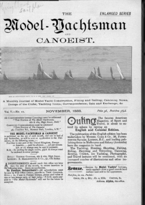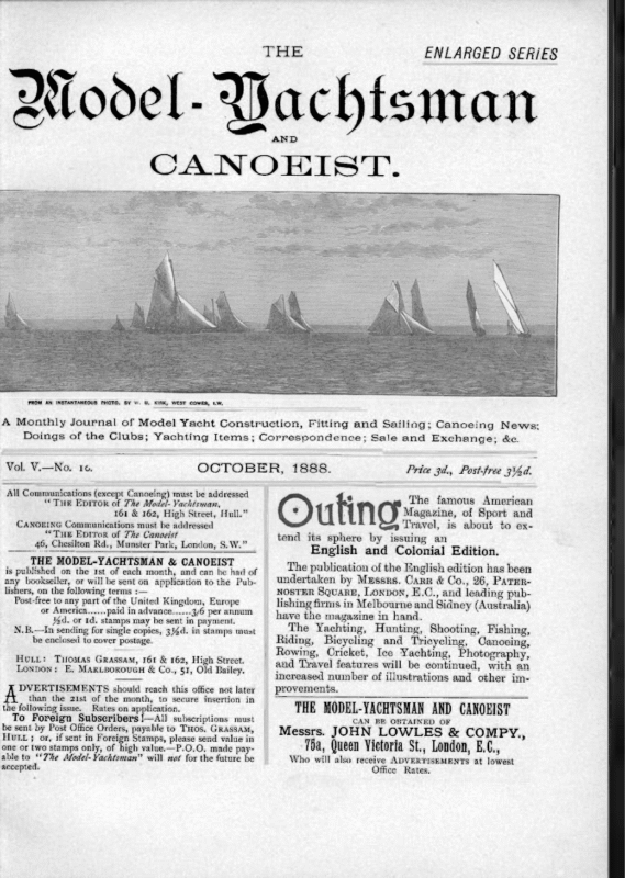 THE ENLARGED SERIES Alodel- Wachtsman AND CA NOHIST. —- FROM AN ee INSTANTANEOUS — PHOTO. BY as Ww. U. KIRK, ee WEST = COWES, 1.W, A Monthly Journal of Model Yacht Construction, Fitting and Sailing; Canoeing News: Doings of the Clubs; Yachting Items; Correspondence; Sale and Exchange; &e. Vol. V.—No. roe tro. OCTOBER, ommunications (except “THE Eoeton of The row Yachtsman, 161 & 162, High Street, Hull.” Canoeing) ul “Tue Epiror of Zhe Canoetst THE MODEL-YACHTSMAN & and CANOEIST | can be had of is published on the st of each month, lishers, on the following terms :— Colonial about to ex- Edition. The’ publication of the inglish edition has been Undertaken by Mussnrs. Carr & Co., 26, Parur- . a ‘The Yachting, Hunting, Shooting, Fishing, be enclosed to cover postage. _ HvuLL: Tiiomas Grassam, 161 & 162, High Street. Lonpon: E, MARLBorouGH & Co., 51, Old Bailey. DVERTISEMENTS should reach this office not later than the 21st of the month, to secure insertion in Riding, Bicycling and Tricycling, Canoeing, Rowing, Cricket, Ice Yachting, Photography, and Travel features will be continued, with an increased number of illustrations and other improvements. Rates on application. ‘*7he Model-Yachtsman” will not for the future be and is have the magazine in hand qe . ‘MthAT N.B,-—-In sending for single copies, 344d. in stamps must able to Travel, lishing firms in Melbourne and Sidney (Australia) or America…… paid in advance…… 3/6 per annum 16d. or id. stamps payment. 72 P may ¥ be sent in pay one or two stamps only, of high value.—P.O.0, made pay- 2 NOSTER Square, Lonpon, E.C., and leading pub- Post-free to any part of the United Kingdom, Europe To Foreign Subseribers!—All subscriptions must The famous American no Magazine, of Sport and English any bookseller, or will be sent on application tothe Pub- be sent by Post Office Orders, payable to Tuos. GRASSAM, HULL; or, if sent in Foreign Stamps, please send value in – tend its sphere by issuing an 46, Chesilton Rd., Munster Park, London, S.W.” accepted. Price 3@., Post-free 3d. must be addressed CANOEING Communications must be addressed the following issue. 1888. | THE MODEL-YACHTSMAN AND CANOEIST Messrs. CAN BE OBTAINED OF JOHN ‘ LOWLES & COMPY., : 75a, Queen Victoria a London, E.G, Who will also receive ADVERTISEMENTS at lowest Office Rates, THE MODEL-YACHTSMAN AND CANOEIS? 182 (@diterial Totes, A Summer holiday has never afforded the writer more quiet enjoyment than this year, when somewhat impaired by hard work indoors, and the imprisoning effects of a long run of unsettled weather, he obtained the necessary advantage of change of air and occupation in the district of the Norfolk Rivers and Broads, Our model-yachting and other readers should visit this district, if possible ; its charms will repay the effort. Don’t go for scenery such as you can view in other places, as you will be disappointed, but if you have a small spark of boating love in your nature, this is the place to fan it into flame. The number of pleasure wherries, yachts, and sailing boats, is surpassing, and the variety a never-ending source of interest. Splendid boats, yachts and wherries, can be hired at very reasonable prices, and a holiday fortnight can be spent on these waters with the maximum amount of fresh air and recreation for the minimum outlay in money. A handbook of the Rivers and Broads of Norfolk and Suffolk, by G. Christopher Davies, can be ordered through any bookseller, price 1/6, and will prove of great value to intending visitors, and will give those details of description that our columns are not The well-patroexpansive enough to contain. nized sea-side resort Yarmouth is well worth a visit. The old town is fuli of interest, and the splendid expanse of beach with its crowd of pleasure-seekers is a striking scene. Take a look at the beach boats, which are loaded or rather occupied by those eager for a sea trip; these boats, especially the larger ones, never look ‘‘loaded,” they carry their human freight so buoyantly over the waves. They are of magnificent mould, fine clean lines, and bear aloft their flowing white canvas in grand style. . Lowestoft claims special mention, first for the beauty of its appearance, and second for the reason that it is likely to become in the near future, a place of some importance in the model yachting world. Much to the writer’s regret, his visit was all too short to this admirable watering place, but under the kind guidance of Mr. T’ansley, who has done much for our sport in his district, the most interesting features of the place were visited. First, of course, the Harbour, the yachts, and the lifeboat, the special virtues of the latter, so different from the ordinary type being explained ; next a ramble through the town, where cleanliness and neatness pervades; then to the beautiful Park, which overlooks the site of the proposed model yacht pond. This is close to the sea, and will be free to the wind from all quarters, the water springs up at the foot of the hill ready to fill the place as soon as itis excavated, and one of the best sailing places in the kingdom can be made there. In Lowestoft there is undoubtedly the spirit to carry on the business and pleasure of a flourishing elub, and stimulated by the fact, that boating and yachting plays such an important part in the life of the town and district, Lowestoft / should not be behind-hand in showing us how . to build and sail the fastest models. Tue pleasure of the visit to Lowestoft was enhanced by an introduction to Mr. Tansley, Senior, a model-yachtsman of the good ripe age of 71 years, and who experimented with weighted rudders for models so far back as 1850. Mr. Tansley’s years seem to sit as a lightsome burden, and we hope he is a long way yet from the wind-up of his pursuit as a model-yachtsman. —-Q— New Znatanp furnishes us this month with an interesting account of the Wellington Club, and the matches which ha